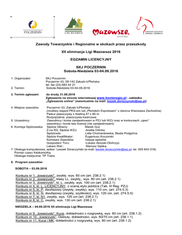 Zawody Towarzyskie i Regionalne w skokach przez przeszkody XII eliminacja Ligi Mazowsza 2016 EGZAMIN LICENCYJNY SKJ POCZERNIN Sobota-Niedziela 03-04.09.2016 1. Organizator: 2. Termin: 3. Termin zgłoszeń: SKJ Poczernin Poczernin 43, 09-142 Załuski k/Płońska tel. fax (23) 683 44 21 Sobota-Niedziela 03-04.09.2016 do środy 31.08.2016 Zgłoszenia na stronie internetowej www.konieregio.pl - zakładka „Zgłoszenia online” (ewentualnie na mail: [email protected]) 4. Miejsce zawodów: Poczernin 43, Załuski k/Płońska (możliwy dojazd PKS-em lub „Płońskim Expressem” z dworca Warszawa Zachodnia) Parkur piaszczysty z fizeliną 47 x 80 m Rozprężalnia: piaszczysta kwarcowa 5. Uczestnicy: Zawodnicy i konie zarejestrowani w PZJ lub WZJ oraz w konkursach „open” zawodnicy i konie bez licencji (nie zarejestrowani). 6. Komisja Sędziowska: Sędzia Główny: Marek Guz Z-ca SG, Sędzia WZJ: Anetta Orlicka Sędziowie: Lidia Chomentowska, Beata Podgórna Sędzia Kwalifikator: Eugeniusz Koczorski Komisarz Zawodów: rotacja sędziów Gospodarz Toru: Łukasz Akszak-Okińczyc Lekarz Wet.: Mariusz Gębka 7. Obsługa komputerowa, spiker: Leszek Doraczyński (e-mail: leszek.doraczyń[email protected]; tel. 505 843 018) Pomiar czasu fotokomórką Obsługa medyczna: TP Trans 8. Program zawodów: SOBOTA – 03.09.2016 Konkurs nr 1, „towarzyski”, zwykły, wys. 60 cm (art. 238.2.1) Konkurs nr 2, „towarzyski”, klasy LL, zwykły , wys. 80 cm (art. 238.2.1) Konkurs nr 3, „towarzyski”, kl. L, zwykły, wys. 100 cm (art. 238.2.1) Konkurs nr 4, kl. L, LICENCYJNY, z oceną stylu jeźdźca (Tab. III Reg. PZJ) Konkurs nr 5, kl. P, dwufazowy (zwykły, zwykły), wys. 110 cm, (art. 274.5.3) Konkurs nr 6, kl. N, dwufazowy (zwykły, szybkości), wys. 120 cm, (art. 274.5.5) Konkurs nr 7, kl. N1, zwykły, wys. 125 cm (art. 238.2.1) Konkurs nr 8, kl. C, zwykły, wys. 130 cm (art. 238.2.1) NIEDZIELA – 04.09.2016 XII eliminacja Ligi Mazowsza Konkurs nr 9, „towarzyski”, Kuce, dokładności z rozgrywką, wys. 60 cm (art. 238.1.2) Konkurs nr 10, „towarzyski”, Debiuty, dokładności, wys. 60/70 cm (art. 238.1.1) Konkurs nr 11, Kuce i MK, dokładności z rozgrywką, wys. 80 cm (art. 238.1.2) Konkurs nr 12, „towarzyski”, kl. LL, dokładności, z trafieniem w normę czasu, wys. 80 cm (Załącznik S1. Reg. PZJ) Konkurs nr 13, kl. L, LICENCYJNY, z oceną stylu jeźdźca (Tab. III Reg. PZJ) Konkurs nr 14, kl. L, dwufazowy (dokładności, zwykły), wys. 100 cm (art. 274.5.2) Konkurs nr 15, kl. P, dwufazowy (dokładności, szybkości)i, wys. 110 cm, (art. 274.5.4) Konkurs nr 16, kl. N, zwykły z rozgrywką, wys. 120 cm (art. 238.2.2); Konkurs nr 17, kl. C, zwykły, wys. 130 cm (art. 238.2.1) Konkursy nr 9, 11, 12, 14, 15 i 16 zaliczane do klasyfikacji Ligi Mazowsza Uwaga! Zgodnie z Regulaminem Ligi Mazowsza w konkursie nr 9 obowiązuje certyfikat wzrostu konia podpisany przez uprawnionego przez PZJ lekarza weterynarii, bez konieczności rejestracji certyfikatu w PZJ i wykupu licencji konia. W przypadku konkursu nr 11 obowiązuje oficjalny certyfikat wzrostu konia potwierdzony przez PZJ oraz aktualna licencja PZJ/WZJ. Orientacyjne godziny rozpoczęcia sobotnich konkursów (oraz godziny konkursów niedzielnych) uzależnione są od liczby zgłoszeń i opublikowane będą wraz z sobotnimi wstępnymi listami startowymi w przeddzień zawodów na stronie organizatora www.poczernin.pl oraz www.konieregio.pl „Wyniki online” z poszczególnych konkursów dostępne będą na stronie www.konieregio.pl w zakładce lub boksie „Wyniki online”! 9. Zawody rozgrywane zgodnie z Przepisami i Regulaminem PZJ. Zawodników i konie obowiązuje dokumentacja wg regulaminów i przepisów PZJ. Osoby bez licencji (niezarejestrowane), w konkursach „open” (towarzyskich), obowiązują: aktualne badania lekarskie, ubezpieczenie NNW oraz w przypadku osób niepełnoletnich zgoda rodziców lub opiekunów prawnych. Konkursy „open” (towarzyskie) rozgrywaną są zgodnie z Uchwałą PZJ z dnia 20.12.2013 oraz z równą dbałością o konie, zawodników i rywalizację sportową jak konkursy ZR. 10. W przypadku koni w konkursach „open” – wymagany jest minimum paszport urzędowy z aktualnymi szczepieniami. 11. Zgodnie z Regulaminem B PZJ 2016: - w czasie zawodów ZTiR-B dozwolony jest dwukrotny start konia w ciągu jednego dnia zawodów (art. 4 pkt. 2 - tabela) - w tym samym konkursie, dwukrotny start konia - pod tym samym lub różnymi zawodnikami - jest dozwolony w konkursach do klasy L1 włącznie. Jeżeli na tym samym koniu, w tym samym konkursie startuje ten sam zawodnik, to w konkursach, w których o zwycięstwie decyduje czas przejazdu zalicza się tylko wynik pierwszego startu (art. 4 pkt. 3). 12. Nie przewiduje się odprawy technicznej. Zawodnicy zobowiązani są do przedstawienia dokumentów i wniesienia opłat na min. 1 godzinę przed rozpoczęciem konkursów. 13. Opłaty: - Wpisowe: Sobota – 100 PLN / koń. Niedziela - 100 PLN / koń Sobota-Niedziela – 160 PLN / koń - Startowe: Sobota: konkursy 1, 2 – 10 PLN, 3, 4, 5. – 20 PLN, 6, 7 – 25 PLN, 8 – 30 PLN Niedziela: 13, 14, 15 – 20 PLN, 16 – 25 PLN, 17 – 30 PLN - zgodne z Przepisami B PZJ zmiany na listach startowych powinny być wniesione do 30 minut przed rozpoczęciem konkursu. Po tym terminie i w innych przypadkach obowiązuje opłata manipulacyjna w wysokości 30 PLN, 14. Boksy : 80 PLN / jeden dzień; 150 PLN / zawody (liczba ograniczona). Rezerwacja do wtorku 17.08.2016 na stronie www.konieregio.pl zakładka „Zgłoszenia online” lub telefonicznie: Eugeniusz Koczorski, tel. 601 397 770 Obowiązkowa przedpłata na konto z dopiskiem „za boks” na numer konta: 83 1160 2202 0000 0001 3543 8761 15. Nagrody: - flots i nagrody rzeczowe lub finansowe w konkursach 1,2,3,4,6,7, 8, 9, 10,11,12,13 i 15. - nagrody finansowe w konkursach 16,17 i 18 – minimum 250-150-100-50-50, przy czym liczba miejsc nagradzanych może ulec zmianie w zależności 