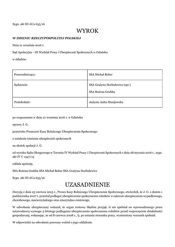 Sygn. akt III AUa 635/16 WYROK W IMIENIU RZECZYPOSPOLITEJ POLSKIEJ Dnia 21 września 2016 r. Sąd Apelacyjny - III Wydział Pracy i Ubezpieczeń Społecznych w Gdańsku w składzie: Przewodniczący: SSA Michał Bober Sędziowie: SSA Grażyna Horbulewicz (spr.) SSA Bożena Grubba Protokolant: stażysta Anita Musijowska po rozpoznaniu w dniu 21 września 2016 r. w Gdańsku sprawy J. G. przeciwko Prezesowi Kasy Rolniczego Ubezpieczenia Społecznego o ustalenie istnienia ubezpieczeń społecznych na skutek apelacji J. G. od wyroku Sądu Okręgowego w Toruniu IV Wydział Pracy i Ubezpieczeń Społecznych z dnia 28 stycznia 2016 r., sygn. akt IV U 1547/15 oddala apelację. SSA Bożena Grubba SSA Michał Bober SSA Grażyna Horbulewicz Sygn. akt III AUa 635/16 UZASADNIENIE Decyzją z dnia 23 czerwca 2015 r., Prezes Kasy Rolniczego Ubezpieczenia Społecznego, stwierdził, że J. G. z dniem 1 października 2007 r. przestał podlegać ubezpieczeniu społecznemu rolników w zakresie ubezpieczenia wypadkowego, chorobowego, macierzyńskiego oraz emerytalno-rentowego. W odwołaniu ubezpieczony wskazał, że organ rentowy błędnie przyjął, iż nie spełniał on wprowadzonego przez ustawodawcę wymogu 3-letniego podlegania ubezpieczeniu społecznemu rolników przed rozpoczęciem działalności gospodarczej, wskazując, że od 8 czerwca 2008 r., tj. po ustaniu stosunku pracy, wymieniony warunek spełniał. W odpowiedzi na odwołanie pozwany wniósł o jego oddalenie. Wyrokiem z dnia 28 stycznia 2016 r. Sąd Okręgowy w Toruniu IV Wydział Pracy i Ubezpieczeń Społecznych oddalił odwołanie. Uzasadniając swoje stanowisko Sąd wskazał, że J. G., począwszy od 31 lipca 2002 r., prowadzi gospodarstwo rolne o pow. 1,76 ha, położone w miejscowości O., gm. C.. W związku z wykonywaną działalnością rolniczą, z dniem rozpoczęcia owej działalności, został on objęty ubezpieczeniem społecznym rolników w zakresie ubezpieczenia wypadkowego, chorobowego, macierzyńskiego oraz emerytalno-rentowego. Począwszy o dnia 1 września 2003 r. ubezpieczony prowadził pozarolniczą działalność gospodarczą – handel obwoźny, pod firmą (...), w związku z czym zmianie uległy warunki jego podlegania ubezpieczeniu społecznemu rolników. J. G. zaprzestał prowadzenia działalności gospodarczej z dniem 29 grudnia 2004 r., w związku z czym zmieniły się zasady podlegania przez niego ubezpieczeniu społecznemu rolników. W dniu 1 września 2005 r. ubezpieczony ponownie rozpoczął prowadzenie działalności gospodarczej. W dniu 3 września 2007 r. J. G. podjął pracę w Firmie Budowlanej (...) w T.. Ubezpieczony był zatrudniony w pełnym wymiarze czasu pracy, na podstawie umowy o pracę do dnia 7 czerwca 2008 r. J. G. aż do dnia wyroku nieprzerwanie prowadził działalność gospodarczą. Istota sporu sprowadzała się do ustalenia, czy J. G. posiada tytuł do ubezpieczenia w ramach ubezpieczenia społecznego rolników, w związku ze świadczeniem przez niego w okresie od 3 września 2007 r. do 7 czerwca 2008 r. pracy, na podstawie umowy o pracę. Powołując się na treść art. 7 ust. 1 oraz art. 16 ust.1 ustawy o ubezpieczeniu społecznym rolników, Sąd podał, że rolniczy model ubezpieczenia społecznego ma charakter subsydiarny. Ubezpieczenia rolnicze, tak emerytalnorentowe, jak i wypadkowe, chorobowe i macierzyńskie, są formą zabezpieczenia społecznego tych tylko osób, które będąc rolnikiem, czy domownikiem rolnika, nie podlegają innemu ubezpieczeniu społecznemu. Wyjątek od powyższej zasady unormowany został w art. 5a ustawy o ubezpieczeniu społecznym rolników, z treści którego wynika, że rolnik lub domownik, który podlegając ubezpieczeniu w pełnym zakresie z mocy ustawy, nieprzerwanie przez co najmniej 3 lata, rozpocznie prowadzenie pozarolniczej działalności gospodarczej lub rozpocznie współpracę przy prowadzeniu tej działalności, podlega nadal temu ubezpieczeniu w okresie prowadzenia pozarolniczej działalności gospodarczej lub współpracy przy prowadzeniu tej działalności, jeżeli spełni łącznie postawione mu, szczegółowo w tym przepisie wymienione, warunki. Regulacja art. 5a ustawy o ubezpieczeniu społecznym rolników ma charakter wyjątkowy i szczególny, co oznacza, że nie może być interpretowana rozszerzająco. Mając na uwadze przedstawioną regulację przy uwzględnieniu poczynionych ustaleń faktycznych Sąd wskazał, że z chwilą podjęcia przez J. G. zatrudnienia na podstawie umowy o pracę i objęcia go w związku z tym powszechnym ubezpieczeniem społecznym, z mocy ustawy przestał on podlegać ubezpieczeniu społecznemu rolników. Restrykcyjny wymiar regulacji zawartej w art. 5a ustawy przejawia się nie tylko w tym, że wystąpienie innego tytułu ubezpieczenia powoduje ustanie ubezpieczenia rolniczego, ale prowadzi jednocześnie do przewartościowania przesłanki posiadania, co najmniej 3-letniego nieprzerwanego okresu ubezpieczenia. Rolnik, aby skorzystać z dobrodziejstwa art. 5a ust. 1 ustawy, musi bowiem ponownie uzbierać trzyletni staż ubezpieczeniowy (tak m.in. Sąd Apelacyjny w Białymstoku w uzasadnieniu wyroku z dnia 21 sierpnia 2013r., wydanego w sprawie III AUa 190/13). W stosunku do ubezpieczonego prowadzącego, już po ustaniu z dniem 7 czerwca 2008 r. stosunku zatrudnienia, w dalszym ciągu założoną w 2005 r. działalność gospodarczą, wymagany przez ustawodawcę 3-letni okres podlegania pełnemu ubezpieczeniu rolniczemu, nie rozpoczął nawet swego biegu. Sytuacja taka zachodziłaby tylko wówczas, gdyby działalność rolnicza była jedyną sferą jego gospodarczej aktywności. W kontekście powyższego, Sąd Okręgowy zaznaczył, że zgodnie z brzmieniem przepisów art. 7 i 16 ustawy o ubezpieczeniu społecznym rolników, podleganie ubezpieczeniu społecznemu rolników warunkowane jest spełnieniem określonych przez ustawodawcę przesłanek, przy czym zaktualizowanie się ich wszystkich powoduje, że prawo ta