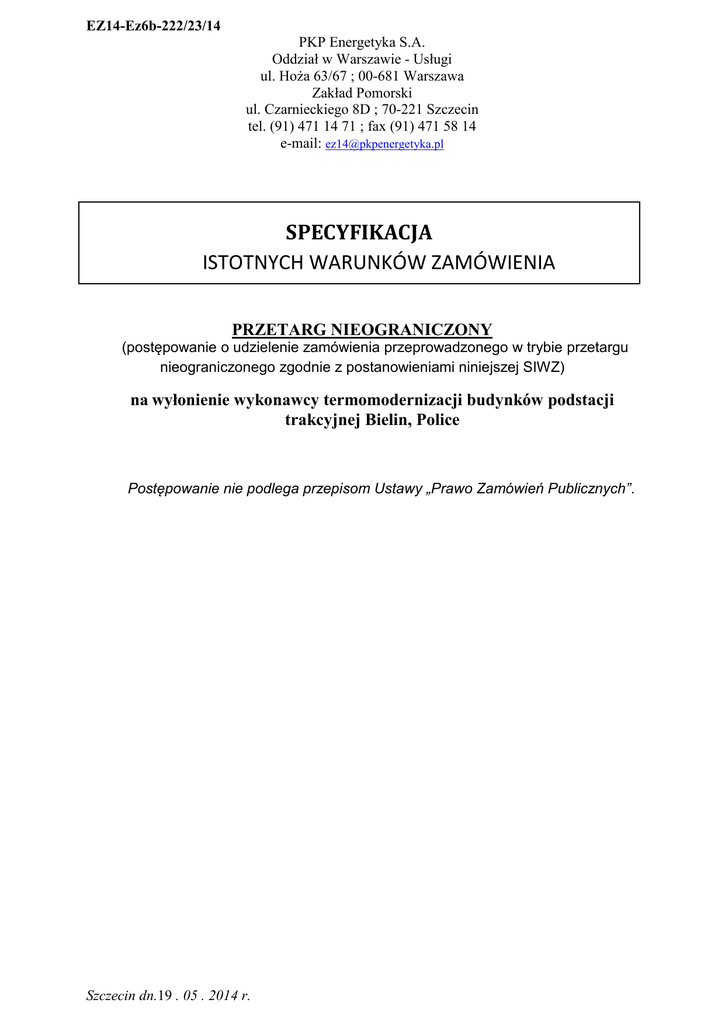 EZ14-Ez6b-222/23/14 PKP Energetyka S.A. Oddział w Warszawie - Usługi ul. Hoża 63/67 ; 00-681 Warszawa Zakład Pomorski ul. Czarnieckiego 8D ; 70-221 Szczecin tel. (91) 471 14 71 ; fax (91) 471 58 14 e-mail: [email protected] SPECYFIKACJA ISTOTNYCH WARUNKÓW ZAMÓWIENIA PRZETARG NIEOGRANICZONY (postępowanie o udzielenie zamówienia przeprowadzonego w trybie przetargu nieograniczonego zgodnie z postanowieniami niniejszej SIWZ) na wyłonienie wykonawcy termomodernizacji budynków podstacji trakcyjnej Bielin, Police Postępowanie nie podlega przepisom Ustawy „Prawo Zamówień Publicznych”. Szczecin dn.19 . 05 . 2014 r. I. INFORMACJE OGÓLNE Zamawiający: PKP Energetyka S.A. Oddział w Warszawie - Usługi ul. Hoża 63/67 ; 00-681 Warszawa Zakład Pomorski ul. Czarnieckiego 8D ; 70-221 Szczecin tel. (091) 471 14 71 ; fax (091) 471 58 14 e-mail: [email protected] Ogłasza postępowanie w trybie przetargu nieograniczonego na wyłonienie wykonawcy termomodernizacji budynków PT Bielin, Police. Postępowanie nie podlega przepisom Ustawy „Prawo Zamówień Publicznych”. II. OPIS PRZEDMIOTU ZAMÓWIENIA 1. Zamówienie obejmuje: Remont budynku Podstacji Trakcyjnej Bielin Remontem objęty jest : 1. Remont elewacji budynku wraz z termomodernizacją, 2. Remont pokrycia dachu wraz z ociepleniem, 3. Remont pomieszczeń socjalnych, biurowych, magazynowych oraz hali, Zakres remontu Elewacja 1. Wykucie okien stalowych i drewnianych, oraz drzwi wejściowych do budynku, 2. Wbudowanie nowej stolarki okiennej PCV, 3. Wbudowanie nowych drzwi wejściowych: zewnętrzne antywłamaniowe ocieplone pełne jednoskrzydłowe bez naświetli ( drzwi muszą mieć możliwość wymiany wkładek i zamków na zamki firmy LOB ), 4. Wbudowanie bramy garażowej – podnoszonej stalowej, segmentowej sterowana przyciskiem, kolor: RAL 3003 ZEWN, RAL 9002 WEWN. 5. Zamurowanie części wykutych okien stalowych, 6. Szpachlowanie oraz pomalowanie płaszczyzn wewnętrznych zabudowy okiennej, 7. Oczyszczenie i zmycie ścian elewacji, gruntowanie , impregnacja grzybobójcza, ocieplenie płytami styropianowymi gr 15 cm mocowanymi na zaprawie oraz dyblami, przyklejenie jednej warstwy siatki , wykonanie wyprawy elewacyjnej cienkowarstwowej z gotowej mieszanki akrylowej barwionej w masie, wykonanie wyprawy elewacyjnej cienkowarstwowej cokołu z suchej mieszanki żywiczno-mineralnej, 8. Naprawa opaski wokół budynku, 9. Wykonanie izolacji przeciwwilgociowej i ocieplenie fundamentów budynku, 10. Skrajnie istniejące okna górne zamurować na całej powierzchni i wykonać ocieplenie, 11. W miejsce pozostałych niezamurowanych przeszkleń zabudować nowe okna zgodnie ze specyfikacją zamówienia, 12. Wszystkie górne okna zabezpieczyć siatką a dolne kratami, 13. Zdemontowanie instalacji uziemiającej przed wykonaniem termomodernizacji budynku 2 Wykonać nowe przewody uziemiające i magistralę uziemiającą okalającą budynek, Magistralę wraz z przewodami uziemiającymi konstrukcje oraz inne elementy przewodzące dostępne poprowadzić w widoczny sposób po zewnętrznej części elewacji po trasach demontowanego uziemienia, Odtworzyć punkty kontrolne magistrali uziemiającej, Wykonać nową instalację odgromową budynku, Przewody odprowadzające instalacji odgromowej prowadzić po zewnętrznej części elewacji, Nową instalację odgromową połączyć z otokiem budynku poprzez nowe złącza kontrolne niezależne od złącz kontrolnych magistrali uziemiającej, Wykonać przepusty przez ściany w miejscach przejść przewodów uziemiających, 14. Przełożenie i zmniejszenie elementu przęsła siatki w ramkach przy transformatorach, 15. Przystosować konstrukcje wsporcze pod odgromniki do nowej elewacji, 16. Wywiezienie gruzu. 17. Naprawa, konserwacja ogrodzenia zewnętrznego. Wymagania dotyczące materiałów: System ocieplenia nierozprzestrzeniający ognia (NRO), Przekrycie dachu nierozprzestrzeniające ognia (NRO) klasyfikowane jako BROOF(t1), Materiały zastosowane do ocieplenia ścian powinny posiadać klasę reakcji na ogień co najmniej E. Nierozprzestrzenianie ognia oraz klasa reakcji na ogień powinny być potwierdzone odpowiednim dokumentem wydanym przez Instytut Techniki Budowlanej. dach 1. Demontaż przewodów instalacji odgromowej oraz montaż nowej instalacji po robotach dekarskich 2. Rozebranie rynien i rur spadowych , rozebranie obróbek blacharskich 3. Usunięcie lub podklejenie luźnych elementów pokrycia dachu, nacięcie i podklejenie pęcherzy, wykonanie wklejek w nierównościach pokrycia dachu. 4. Krycie dachu papą termozgrzewalną z ociepleniem płytą styropianową jednostronnie oklejoną papą podkładową 5. Wykonanie obróbek blacharskich , zamontowanie rynien i rur spadowych 6. Pokrycie dachu wykonać z warstwy styropapy gr. 15 cm wraz z systemową papą termozgrzewalną płyty warstwowe styropapy gr. 15 cm wykonać z płyt styropianowych EPS 100 jednostronnie oklejonych papa podkładową typu PV 60 7. Zamontować kominki wentylacyjne (1 szt. na 40 do 60 m2 powierzchni dachu) 8. Do mocowania termoizolacji ( płyt styropapy) zastosować łączniki składające się z teleskopu, wkrętu oraz kołka rozporowego 9. Papa podkładowa – osnowa z włókniny poliestrowej wzmocniona 180 g/m2 zawartość asfaltu modyfikowanego SBS 2000 g/m2 gr. 3 mm , wytrzymałość na rozciąganie nie mniej niż 600/400 N/50 ( wzdłuż/poprzek) 10. Papa nawierzchniowa asfaltowa zgrzewalna wierzchniego krycia modyfikowana SBS na osnowie włókniny poliestrowej , gramatura osnowy 250 g/m2 , zawartość asfaltu modyfikowanego elastomerem SBS min. 4000 b?m2 , maksymalna siła rozciągu na pasku szer. 5 cm wzdłuż/w poprzek min. 1000/800 N , wzdłużnie przy maksymalnej sile rozciągu wzdłuż/ w poprzek 40/40 % , giętkość w obniżonych temperaturach – 25 º C , grubość 5,6 ± 2 mm c. roboty remontowe wewnętrzne pomieszczeń socjalnych , biurowych , magazynków oraz hali 1. Demontaż obudów z elementów zawierających azb