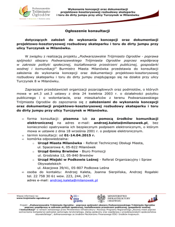 Wykonanie koncepcji oraz dokumentacji projektowo-kosztorysowej rozbudowy skateparku i toru do dirty jumpu przy ulicy Turczynek w Milanówku Ogłoszenie konsultacji dotyczących założeń do wykonania koncepcji oraz dokumentacji projektowo-kosztorysowej rozbudowy skateparku i toru do dirty jumpu przy ulicy Turczynek w Milanówku. W związku z realizacją projektu „Podwarszawskie Trójmiasto Ogrodów - poprawa spójności obszaru Podwarszawskiego Trójmiasta Ogrodów poprzez współpracę w zakresie polityki społecznej, kształtowania przestrzeni publicznej, gospodarki wodnej i komunikacji” Burmistrz Miasta Milanówka przedstawia do konsultacji założenia do wykonania koncepcji oraz dokumentacji projektowo-kosztorysowej rozbudowy skateparku i toru do dirty jumpu znajdującego się na działce przy ulicy Turczynek 8 w Milanówku. Zapraszam przedstawicieli organizacji pozarządowych oraz podmiotów, o których mowa w art.3 ust.3 ustawy z dnia 24 kwietnia 2003 r. o działalności pożytku publicznego i o wolontariacie, oraz mieszkańców z terenu Podwarszawskiego Trójmiasta Ogrodów do zapoznania się z założeniami do wykonania koncepcji oraz dokumentacji projektowo-kosztorysowej rozbudowy skateparku i toru do dirty jumpu przy ulicy Turczynek w Milanówku. • • • • forma konsultacji: pisemna lub za pomocą środków komunikacji elektronicznej na adres e-mail: [email protected], bez konieczności opatrywania ich bezpiecznym podpisem elektronicznym, o którym mowa w ustawie z dnia 18 września 2001 r. o podpisie elektronicznym. termin konsultacji: od 01-14.04.2015 r. komórka odpowiedzialna: o Urząd Miasta Milanówka - Referat Technicznej Obsługi Miasta, ul. Spacerowa 4, 05-822 Milanówek o Urząd Gminy Brwinów - Biuro Promocji ul. Grodziska 12, 05-840 Brwinów o Urząd Miejski w Podkowie Leśnej - Referat Organizacyjny i Spraw Obywatelskich ul. Akacjowa 39/41, 05-807 Podkowa Leśna osoba do kontaktu: Andrzej Kaleta, Joanna Sierpińska, Andrzej Rogalski tel. 22 758 30 61 wew. 223, 244, 247; adres e-mail: [email protected] Więcej informacji na: www.trojmiasto-ogrodow.pl Projekt: „Podwarszawskie Trójmiasto Ogrodów - poprawa spójności obszaru Podwarszawskiego Trójmiasta Ogrodów poprzez współpracę w zakresie polityki społecznej, kształtowania przestrzeni publicznej, gospodarki wodnej i komunikacji” w ramach wdrażanego przez Ministerstwo Infrastruktury i Rozwoju Programu Regionalnego „Rozwój miast poprzez wzmocnienie kompetencji jednostek samorządu terytorialnego, dialog społeczny oraz współpracę z przedstawicielami społeczeństwa obywatelskiego”, dofinansowanego ze środków Mechanizmu Finansowego EOG i środków krajowych. Zapraszam przedstawicieli organizacji pozarządowych i innych podmiotów prowadzących działalność pożytku publicznego oraz mieszkańców z terenu Podwarszawskiego Trójmiasta Ogrodów do wnoszenia uwag i opinii w terminie od 01.04.2015 r. do 14.04.2015 r. za pośrednictwem załączonego formularza opinii. Burmistrz Miasta Milanówka mgr inż. Wiesława Kwiatkowska Strona 2 z 2