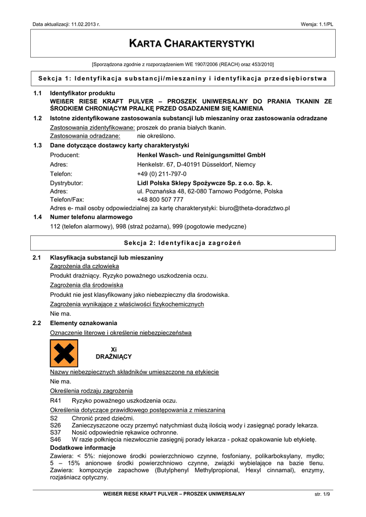 Data aktualizacji: 11.02.2013 r. Wersja: 1.1/PL KARTA CHARAKTERYSTYKI [Sporządzona zgodnie z rozporządzeniem WE 1907/2006 (REACH) oraz 453/2010] Sekcja 1: Identyfikacja substancji/mieszaniny i identyfikacja przedsiębiorstwa 1.1 Identyfikator produktu WEIßER RIESE KRAFT PULVER – PROSZEK UNIWERSALNY DO PRANIA TKANIN ZE ŚRODKIEM CHRONIĄCYM PRALKĘ PRZED OSADZANIEM SIĘ KAMIENIA 1.2 Istotne zidentyfikowane zastosowania substancji lub mieszaniny oraz zastosowania odradzane Zastosowania zidentyfikowane: proszek do prania białych tkanin. Zastosowania odradzane: nie określono. 1.3 1.4 Dane dotyczące dostawcy karty charakterystyki Producent: Henkel Wasch- und Reinigungsmittel GmbH Adres: Henkelstr. 67, D-40191 Düsseldorf, Niemcy Telefon: +49 (0) 211-797-0 Dystrybutor: Lidl Polska Sklepy Spożywcze Sp. z o.o. Sp. k. Adres: ul. Poznańska 48, 62-080 Tarnowo Podgórne, Polska Telefon/Fax: +48 800 507 777 Adres e- mail osoby odpowiedzialnej za kartę charakterystyki: [email protected] Numer telefonu alarmowego 112 (telefon alarmowy), 998 (straż pożarna), 999 (pogotowie medyczne) S ek cj a 2: I d e n t y f i k a c j a z a g r o ż e ń 2.1 Klasyfikacja substancji lub mieszaniny Zagrożenia dla człowieka Produkt drażniący. Ryzyko poważnego uszkodzenia oczu. Zagrożenia dla środowiska Produkt nie jest klasyfikowany jako niebezpieczny dla środowiska. Zagrożenia wynikające z właściwości fizykochemicznych Nie ma. 2.2 Elementy oznakowania Oznaczenie literowe i określenie niebezpieczeństwa Xi DRAŻNIĄCY Nazwy niebezpiecznych składników umieszczone na etykiecie Nie ma. Określenia rodzaju zagrożenia R41 Ryzyko poważnego uszkodzenia oczu. Określenia dotyczące prawidłowego postępowania z mieszaniną S2 Chronić przed dziećmi. S26 Zanieczyszczone oczy przemyć natychmiast dużą ilością wody i zasięgnąć porady lekarza. S37 Nosić odpowiednie rękawice ochronne. S46 W razie połknięcia niezwłocznie zasięgnij porady lekarza - pokaż opakowanie lub etykietę. Dodatkowe informacje Zawiera: < 5%: niejonowe środki powierzchniowo czynne, fosfoniany, polikarboksylany, mydło; 5 – 15% anionowe środki powierzchniowo czynne, związki wybielające na bazie tlenu. Zawiera: kompozycje zapachowe (Butylphenyl Methylpropional, Hexyl cinnamal), enzymy, rozjaśniacz optyczny. WEIßER RIESE KRAFT PULVER – PROSZEK UNIWERSALNY str. 1/9 Data aktualizacji: 11.02.2013 r. Wersja: 1.1/PL KARTA CHARAKTERYSTYKI 2.3 Inne zagrożenia Brak informacji na temat spełnienia kryteriów PBT lub vPvB zgodnie z załącznikiem XIII rozporządzenia REACH. Odpowiednie badania nie były przeprowadzone. Sekcja 3: 3.1 Substancje Nie dotyczy. 3.2 Mieszaniny Skład/informacja o składnikach węglan sodu Zakres stężeń: 20-40% Numer CAS: 497-19-8 Numer WE: 207-838-8 Numer rejestracji właściwej: 01-211-9485498-19-XXXX Klasyfikacja wg 67/548/EWG: Xi R36 Klasyfikacja wg 1272/2008/WE: Eye Irrit 2 H319 kwas benzenosulfonowy, pochodne alkilowe C10-13, sole sodowe Zakres stężeń: 5-10% Numer CAS: 68411-30-3 Numer WE: 270-115-0 Numer rejestracji właściwej: 01-2119489428-22-XXXX Klasyfikacja wg 67/548/EWG: Xn R22; Xi R38-41 Klasyfikacja wg 1272/2008/WE: Acute Tox. 4 H302; Skin Irrit. 2 H315; Eye Dam 1 H318 krzemian sodu Zakres stężeń: 5-10% Numer CAS: 1344-09-8 Numer WE: 215-687-4 Numer rejestracji właściwej: 01-2119448725-31-XXXX Klasyfikacja wg 67/548/EWG: Xi R37/38-41 Klasyfikacja wg 1272/2008/WE: STOT SE. 3 H335; Skin Irrit. 2 H315; Eye Dam 1 H318 nadwęglan sodu Zakres stężeń: 5-10% Numer CAS: 15630-89-4 Numer WE: 239-707-6 Numer rejestracji właściwej: podlega przepisom okresu przejściowego Klasyfikacja wg 67/548/EWG: O R8; Xn R22; Xi R41 Klasyfikacja wg 1272/2008/WE: Ox. Sol. 3 H272; Acute Tox. 4 H302; Eye Dam 1 H318 etoksylowane alkohole tłuszczowe C13-C15 Zakres stężeń: 1-3% Numer CAS: 64425-86-1 Numer WE: Numer rejestracji właściwej: 02-2119548515-35-XXXX Klasyfikacja wg 67/548/EWG: Xn R22; Xi R38 Klasyfikacja wg 1272/2008/WE: Acute Tox. 4 H302; Skin Irrit. 2 H315 Pełen tekst zwrotów R i H przytoczony został w sekcji 16 karty. WEIßER RIESE KRAFT PULVER – PROSZEK UNIWERSALNY str. 2/9 Data aktualizacji: 11.02.2013 r. Wersja: 1.1/PL KARTA CHARAKTERYSTYKI Sekcja 4: 4.1 Środki pierwszej pomocy Opis środków pierwszej pomocy W kontakcie ze skórą: skonsultować się z lekarzem w przypadku wystąpienia podrażnienia. Zdjąć zanieczyszczoną odzież. Narażone partie skóry zmyć dokładnie wodą z mydłem. W kontakcie z oczami: chronić niepodrażnione oko, wyjąć szkła kontaktowe. Zanieczyszczone oczy przepłukiwać dokładnie wodą przez 10-15 min. Unikać silnego strumienia wody - ryzyko uszkodzenia rogówki. Założyć sterylny opatrunek. Natychmiast skonsultować się z lekarzem. W przypadku spożycia: skonsultować się z lekarzem. Wypłukać usta wodą. Nigdy nie podawać niczego do ust osobie nieprzytomnej. Nie wywoływać wymiotów. Po narażeniu drogą oddechową: skonsultować się z lekarzem w razie wystąpienia niepokojących dolegliwości. Wyprowadzić poszkodowanego na świeże powietrze, zapewnić ciepło i spokój. 4.2 4.3 Najważniejsze ostre i opóźnione objawy oraz skutki narażenia W kontakcie ze skórą: w przypadku długotrwałego lub częstego kontaktu z produktem możliwe wysuszenie, zaczerwienienie. W kontakcie z oczami: łzawienie, pieczenie, zaczerwienienie, ryzyko poważnego uszkodzenia oczu. Po połknięciu: możliwe bóle brzucha, mdłości, wymioty. Wskazania dotyczące wszelkiej natychmiastowej pomocy lekarskiej i szczególnego postępowania z poszkodowanym Decyzję o sposobie postępowania ratunkowego podejmuje lekarz po dokładnej ocenie stanu poszkodowanego. Leczenie objawowe. Sekcja 5: 5.1 Postępowanie w przypadku po żaru Środki gaśnicze Odpowiednie środki gaśnicze: CO2, rozpylony strumień wody, proszek gaśniczy. Większy pożar gasić za pomocą rozpylonego strumienia wody lub piany gaśniczej odpornej na alkohole. Niewłaściwe śro