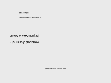 artur piechocki kochański zięba rapala i partnerzy umowy w telekomunikacji – jak uniknąć problemów plnog, warszawa, 4 marca 2014 agenda __________________________________________________________________________________________________________ • • • • • • • • wprowadzenie zagrożenia przygotowanie umowy rynek detaliczny zmiana umowy rynek hurtowy megaustawa telefonia wprowadzenie __________________________________________________________________________________________________________ • • • • • autoprezentacja rynek regulowany obowiązki cywilnoprawne obowiązki administracyjnoprawne uke, uokik, sądy polubowne, sądy powszechne, sokik zagrożenia - konsument __________________________________________________________________________________________________________ • konsument (art. 221 Kc): „za konsumenta uważa się osobę fizyczną dokonującą czynności prawnej niezwiązanej bezpośrednio z jej działalnością gospodarczą lub zawodową.” • niedozwolone klauzule umowne: - sprzeczność z dobrymi obyczajami - rażące naruszenie interesów konsumenta - główne świadczenia stron sformułowane jednoznacznie - indywidualnie uzgodnione - otwarta lista typowych klauzul (385(3)) • brak związania zagrożenia - konsument ii __________________________________________________________________________________________________________ • • • • • tryb kwestionowania legitymacja procesowa czynna kontrola abstrakcyjna lista klauzul abuzywnych uokik umowy zawierane na odległość - zgoda konsumenta - odstąpienie 10 (14) dni z wyjątkami - zakaz opłaty z góry • naruszenie zbiorowych interesów konsumentów zagrożenia pozostałe __________________________________________________________________________________________________________ • • • konkurencja ze strony innych przedsiębiorców telekomunikacyjnych, zmiany umów / regulaminów, kontrole Prezesa UKE – najczęściej weryfikowane elementy działalności; przygotowanie umowy / detal __________________________________________________________________________________________________________ • obowiązki cywilnoprawne: a) wzorzec umowy (art. 384 i nast. Kc) - wzorzec = treść umowy - doręczenie - udostępnienie, utrwalenie elektronicznego - interpretacja contra proferentem - sprzeczność z umową b) wzorzec vs. umowa c) forma umowy przygotowanie umowy ii / detal __________________________________________________________________________________________________________ • zakres modyfikacji wobec kc - forma umowy / forma zmiany umowy - treść umowy: okres obowiązywania i rozwiązanie, jakość usługi, reklamacje, odpowiedzialność, informacje (rozwiązywanie sporów, cennik, zagrożenia, reklamacje, funkcjonalność usługi) – kontrola uke - konsument max. 24 miesiące / min. <12 miesięcy - potwierdzenie zmiany usługi i konsekwencja braku potwierdzenia (3 m-ce) - przystąpienie do wykonywania usługi wg zmienionych warunków • możliwość uzależnienia zawarcia umowy od: - dokumenty potwierdzające możliwość wykonania / wiarygodność finansowa - zakaz: dodatkowych informacji, uzależnienia od niezawierania z innym dostawcą przygotowanie umowy iii / detal __________________________________________________________________________________________________________ • odpowiedzialność - odpowiedzialność przedsiębiorcy 1/15 + 1/30 za dzień - art. 57 ust. 6 – wysokość roszczenia • • • reklamacja, później sąd przedawnienie mediacja, sąd polubowny przy uke przygotowanie umowy iv / detal __________________________________________________________________________________________________________ • regulamin - dopuszczalny zakres regulacji poza umową - sytuacje braku umowy - publikacja • cennik: - opusty, pakiety cenowe - publikacja i doręczenie przygotowanie umowy v __________________________________________________________________________________________________________ • świadczenie usług drogą elektroniczną, - informacja: adres poczty elektronicznej, nazwa, siedziba, zezwolenia, uprawnienia, zagrożenia / funkcja i cel oprogramowania (cookies) - regulamin - bezpieczeństwo transakcji - rozpoczęcie – zakończenie - informacja handlowa a spam - odpowiedzialność stopniowana - ochrona danych osobowych przygotowanie umowy vi __________________________________________________________________________________________________________ • • ochrona danych osobowych, cookies: miejsce regulacji, rodzaje: trwałe / sesyjne; operator strony / os. trzecia; zgoda / brak zgody; obowiązki informacyjne; zgoda a ustawienia urządzenia / usługi; sposób obrony; konsekwencje; zmiana umowy __________________________________________________________________________________________________________ • • wypowiedzenie umowy w razie jej zmiany zagrożenie - wyłączenie art. 57 ust. 6, chyba że zmiana prawa / usunięcie klauzuli abuzywnej / decyzja uke rynek hurtowy __________________________________________________________________________________________________________ • • pozycja rynkowa analiza: - rynek właściwy - pozycja znacząca = dominacja - wyznaczenie przedsiębiorcy - nałożenie obowiązków regulacyjnych • decyzja prezesa uke - opinia uokik rynek hurtowy ii __________________________________________________________________________________________________________ • dostęp - obowiązek negocjacji: połączenie / dostęp - wniosek o zakończenie max. 90 dni - decyzja nt. warunków współpracy / rozstrzygnięcia sporu - specyfikacja zakończenia sieci / interfejsu • inne obowiązki w decyzjach uke: - informacja - równe traktowanie - rachunkowość regulacyjna - kalkulacja kosztów - oferta ramowa - rozdział funkcjonalny megaustawa __________________________________________________________________________________________________________ • • • uprawnienia podmiotów publicznych współkorzystanie z infrastruktury w umowie dostęp - 