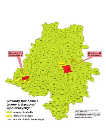 12 13 2 14 1 15 4 17 3 16 5 8 21 19 20 7 18 49 9 6 23 10 22 11 24 31 51 52 30 50 25 32 26 55 34 54 33 28 Obwód nr 115 Goświnowice Obwód nr 44 Falmirowice 37 56 57 70 35 36 58 69 72 Jezioro Turawskie 41 60 38 40 59 39 71 Miasto Opole 74 80 46 73 77 61 62 79 112 94 96 120 95 97 68 118 116 98 92 99 107 121 102 108 122 89 91 103 117 110 123 106 124 100 105 104 126 128 109 131 129 136 Obwody łowieckie i tereny wyłączone* Opolszczyzny** - obwody łowieckie - tereny wyłączone - numer obwodu łowieckiego 130 134 142 143 125 127 132 135 143 84 90 113 114 119 85 115 Jezioro Nyskie 88 101 111 Jezioro Otmuchowskie 81 86 93 48 67 66 82 87 47 63 75 78 43 44 45 64 76 83 133 138 141 139 140 144 146 145 147 149 148 * - na mapie zobrazowano tylko duże tereny wyłączone **- mapa obejmuje obwody nadzorowane przez Zarząd Okręgowy PZŁ w Opolu co nie jest równoznaczne z granicami województwa opolskiego
