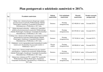 Plan postępowań o udzielenie zamówień w 2017r. Przedmiot zamówienia Rodzaj zamówienia Tryb udzielania zamówienia Wartość zamówienia Termin wszczęcia postępowania Zakup wraz z dostawą kruszywa drogowego i piasku przeznaczonych na potrzeby Wolbromskiego Zakładu Wodociągów, Kanalizacji, Gospodarki Komunalnej i Mieszkaniowej w Wolbromiu w 2017 roku Dostawa Przetarg nieograniczony 423 400,00 zł / netto I kwartał 2017r. Zakup mieszanek mineralno – asfaltowych i materiałów asfaltowych przeznaczonych na potrzeby Wolbromskiego Zakładu Wodociągów, Kanalizacji, Gospodarki Komunalnej i Mieszkaniowej w Wolbromiu w 2017 roku Dostawa Przetarg nieograniczony 663 895,00 zł / netto I kwartał 2017r. 3 Zakup wraz z dostawą kostki brukowej i pozostałych wyrobów betoniarskich na potrzeby Wolbromskiego Zakładu Wodociągów, Kanalizacji, Gospodarki Komunalnej i Mieszkaniowej w Wolbromiu w 2017 roku Dostawa Przetarg nieograniczony 170 745,00 zł / netto I kwartał 2017r. 4 „ Załadunek, wywóz zagospodarowanie komunalnych osadów ściekowych z Komunalnej Oczyszczalni ścieków w Wolbromiu w 2017 r.” Wywóz osadów Przetarg nieograniczony 160 000,00 zł / netto I kwartał 2017r. Zakup wraz z dostawą studni betonowych oraz wpustów krawężnikowo - jezdniowych na potrzeby Wolbromskiego Zakładu Wodociągów, Kanalizacji, Gospodarki Komunalnej i Mieszkaniowej w Wolbromiu w 2017 roku Dostawa Przetarg nieograniczony 109 785,00 zł / netto I-II kwartał 2017r. Zakup wraz z dostawą rur PVC i studni PVC na potrzeby Wolbromskiego Zakładu Wodociągów, Kanalizacji, Gospodarki Komunalnej i Mieszkaniowej w Wolbromiu w 2017 roku Dostawa Przetarg nieograniczony 180 140,39zł / netto I-II kwartał 2017r. Lp. 1 2 5 6 7 8 9 10 Zakup wraz z dostawą rur PE, złączy i kształtek przeznaczonych na potrzeby Wolbromskiego Zakładu Wodociągów, Kanalizacji, Gospodarki Komunalnej i Mieszkaniowej w Wolbromiu w 2017 roku Dostawa Przetarg nieograniczony 240 000,00 zł / netto I-II kwartał 2017r. Zakup wraz z dostawą wodomierzy przeznaczonych na potrzeby Wolbromskiego Zakładu Wodociągów, Kanalizacji, Gospodarki Komunalnej i Mieszkaniowej w Wolbromiu w 2017 roku Dostawa Przetarg nieograniczony 120 000,00 zł / netto II-III kwartał 2017r. Zakup energii elektrycznej na potrzeby Wolbromskiego Zakładu Wodociągów, Kanalizacji, Gospodarki Komunalnej i Mieszkaniowej w Wolbromiu w 2018 roku Dostawa Przetarg nieograniczony 554 599,27 zł / netto IV kwartał 2017r Usługa dystrybucji energii elektrycznej na potrzeby Wolbromskiego Zakładu Wodociągów, Kanalizacji, Gospodarki Komunalnej i Mieszkaniowej w Wolbromiu w 2018 roku Usługa Zamówienie z wolnej ręki 311 616,66 zł / netto IV kwartał 2017r Dostawa Przetarg nieograniczony Część WZWKGKiM: 347 121,95 zł / netto IV kwartał 2017r 11 Dostawa paliw płynnych dla potrzeb Gminy Wolbrom oraz jej jednostek organizacyjnych i Samorządowej Instytucji Kultury w 2018 roku