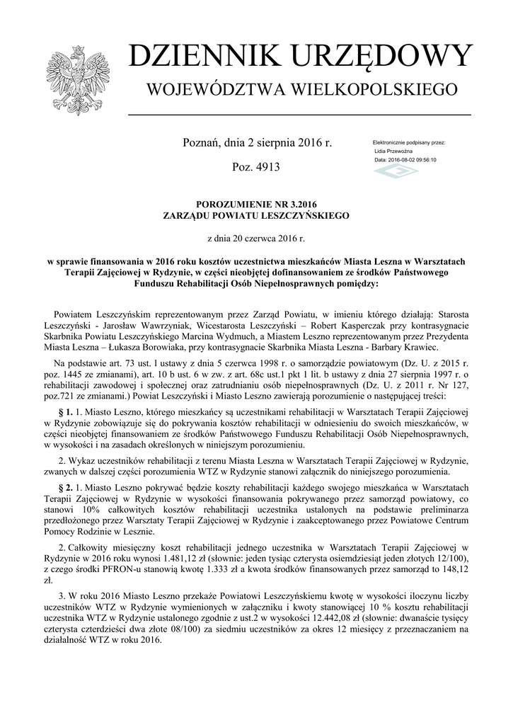 DZIENNIK URZĘDOWY WOJEWÓDZTWA WIELKOPOLSKIEGO Poznań, dnia 2 sierpnia 2016 r. Elektronicznie podpisany przez: Lidia Przewoźna Poz. 4913 Data: 2016-08-02 09:56:10 POROZUMIENIE NR 3.2016 ZARZĄDU POWIATU LESZCZYŃSKIEGO z dnia 20 czerwca 2016 r. w sprawie finansowania w 2016 roku kosztów uczestnictwa mieszkańców Miasta Leszna w Warsztatach Terapii Zajęciowej w Rydzynie, w części nieobjętej dofinansowaniem ze środków Państwowego Funduszu Rehabilitacji Osób Niepełnosprawnych pomiędzy: Powiatem Leszczyńskim reprezentowanym przez Zarząd Powiatu, w imieniu którego działają: Starosta Leszczyński - Jarosław Wawrzyniak, Wicestarosta Leszczyński – Robert Kasperczak przy kontrasygnacie Skarbnika Powiatu Leszczyńskiego Marcina Wydmuch, a Miastem Leszno reprezentowanym przez Prezydenta Miasta Leszna – Łukasza Borowiaka, przy kontrasygnacie Skarbnika Miasta Leszna - Barbary Krawiec. Na podstawie art. 73 ust. l ustawy z dnia 5 czerwca 1998 r. o samorządzie powiatowym (Dz. U. z 2015 r. poz. 1445 ze zmianami), art. 10 b ust. 6 w zw. z art. 68c ust.1 pkt 1 lit. b ustawy z dnia 27 sierpnia 1997 r. o rehabilitacji zawodowej i społecznej oraz zatrudnianiu osób niepełnosprawnych (Dz. U. z 2011 r. Nr 127, poz.721 ze zmianami.) Powiat Leszczyński i Miasto Leszno zawierają porozumienie o następującej treści: § 1. 1. Miasto Leszno, którego mieszkańcy są uczestnikami rehabilitacji w Warsztatach Terapii Zajęciowej w Rydzynie zobowiązuje się do pokrywania kosztów rehabilitacji w odniesieniu do swoich mieszkańców, w części nieobjętej finansowaniem ze środków Państwowego Funduszu Rehabilitacji Osób Niepełnosprawnych, w wysokości i na zasadach określonych w niniejszym porozumieniu. 2. Wykaz uczestników rehabilitacji z terenu Miasta Leszna w Warsztatach Terapii Zajęciowej w Rydzynie, zwanych w dalszej części porozumienia WTZ w Rydzynie stanowi załącznik do niniejszego porozumienia. § 2. 1. Miasto Leszno pokrywać będzie koszty rehabilitacji każdego swojego mieszkańca w Warsztatach Terapii Zajęciowej w Rydzynie w wysokości finansowania pokrywanego przez samorząd powiatowy, co stanowi 10% całkowitych kosztów rehabilitacji uczestnika ustalonych na podstawie preliminarza przedłożonego przez Warsztaty Terapii Zajęciowej w Rydzynie i zaakceptowanego przez Powiatowe Centrum Pomocy Rodzinie w Lesznie. 2. Całkowity miesięczny koszt rehabilitacji jednego uczestnika w Warsztatach Terapii Zajęciowej w Rydzynie w 2016 roku wynosi 1.481,12 zł (słownie: jeden tysiąc czterysta osiemdziesiąt jeden złotych 12/100), z czego środki PFRON-u stanowią kwotę 1.333 zł a kwota środków finansowanych przez samorząd to 148,12 zł. 3. W roku 2016 Miasto Leszno przekaże Powiatowi Leszczyńskiemu kwotę w wysokości iloczynu liczby uczestników WTZ w Rydzynie wymienionych w załączniku i kwoty stanowiącej 10 % kosztu rehabilitacji uczestnika WTZ w Rydzynie ustalonego zgodnie z ust.2 w wysokości 12.442,08 zł (słownie: dwanaście tysięcy czterysta czterdzieści dwa złote 08/100) za siedmiu uczestników za okres 12 miesięcy z przeznaczaniem na działalność WTZ w roku 2016. Dziennik Urzędowy Województwa Wielkopolskiego –2– Poz. 4913 4. Miasto Leszno kwotę ustaloną zgodnie z ust. 3 przekaże w dwóch transzach: I transza w kwocie 6.221,08 zł płatna w terminie do dnia 31 lipca 2016 roku. II transza w kwocie 6.221,00 zł płatna w terminie do dnia 30 września 2016 roku. 5. W przypadku zmiany liczby uczestników rehabilitacji w WTZ w Rydzynie z terenu Miasta Leszna w trakcie roku strony porozumienia zobowiązują się do odpowiedniego rozliczenia środków z uwzględnieniem czasu faktycznego uczestnictwa w rehabilitacji w WTZ w Rydzynie w terminie trzydziestu dni od daty otrzymania informacji o przyjęciu nowego uczestnika lub skreślenia z listy uczestników WTZ w Rydzynie, zgodnie z zasadą określoną w ust. 3. § 3. 1. Miasto Leszno zobowiązuje się do przekazania kwoty, o której mowa w § 2 ust. 3 na konto Powiatu Leszczyńskiego: Getin Bank nr r-ku: 17 1560 0013 2537 1021 4084 0001. 2. Termin wydatkowania dotacji nie może być dłuższy niż do 31 grudnia 2016 r. 3. Rozliczenie dotacji celowej, o której mowa w § 2 oraz zwrot niewykorzystanej dotacji celowej dokonane zostaną do dnia 31 stycznia 2017 r. na wskazany rachunek bankowy Miasta Leszna. 4. Dotacja, o której mowa w § 2 nie może być przekazywana na inny cel niż wskazany w porozumieniu. Udzielona dotacja wykorzystana niezgodnie z przeznaczeniem, pobrana nienależnie lub w nadmiernej wysokości podlega zwrotowi wraz z odsetkami w wysokości określonej jak dla zaległości podatkowych w terminie do 15 dni od daty stwierdzenia tych okoliczności. § 4. Współpracę merytoryczną w zakresie realizacji porozumienia ze strony Powiatu Leszczyńskiego prowadzić będzie Powiatowe Centrum Pomocy Rodzinie w Lesznie, a ze strony Miasta Leszna – Miejski Ośrodek Pomocy Rodzinie w Lesznie. § 5. Wszelkie zmiany niniejszego porozumienia wymagają pod rygorem nieważności zawarcia aneksu w formie pisemnej. § 6. Porozumienie wchodzi w życie z dniem podpisania, z mocą od dnia 1 stycznia 2016 r. do dnia 31 grudnia 2016r. § 7. Porozumienie sporządzono w czterech jednobrzmiących egzemplarzach, po dwa dla każdej ze stron porozumienia. § 8. Porozumienie niniejsze podlega opublikowaniu w Wojewódzkim Dzienniku Urzędowym zgodnie z art. 13 pkt 6 lit. a ustawy z dnia 20 lipca 2000 r. o ogłaszaniu aktów normatywnych i niektórych innych aktów prawnych ( Dz. U. z 2011 r. Nr 197, poz.1172 ze zmianami). § 9. W kwestiach nieuregulowanych w niniejszym porozumieniu znajdą odpowiednio zastosowanie przepisy ustawy z dnia 27 sierpnia 1997 r. o rehabilitacji zawodowej i społecznej oraz zatrudnianiu osób niepełnosprawnych (Dz. U. z 2011 r. Nr 127, poz.721 ze zmianami) oraz ustawy z dnia 27 sierpnia 2009 r. o finansach publicznych (Dz. U. z 2013 roku, poz. 885 ze zmianami). Starosta (-) Jaros