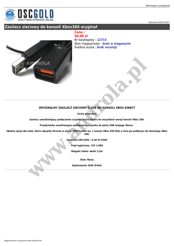 Informacje o produkcie Utworzono 08-03-2017 Zasilacz sieciowy do konsoli Xbox360 oryginał Cena : 50,00 zł ro la .p l Nr katalogowy : 12715 Stan magazynowy : brak w magazynie Średnia ocena : brak recenzji ORYGINALNY ZASILACZ SIECIOWY Z USB DO KONSOLI XBOX KINECT nd Cechy produktu: Zasilacz umożliwiający podłączenie czujnika ruchu Kinect do wszystkich wersji konsoli XBox 360. Przejściówka umożliwiająca podłączenie czujnika do portu USB twojego Xboxa . w .a Idealna opcja dla osób, które zakupiły Kinecta w wersji OEM/bundle np. z nowym XBox 360 Slim a chcą go podłączyć do starszego XBox 360. Zasilanie:100-240V , 0.3A 47-63Hz Prąd wyjściowy: 12V 1.08A w w Długość kabla: około 2,2m Wygenerowano w programie www.oscGold.com Stan: Nowy Opakowanie: Bulk (Folia)