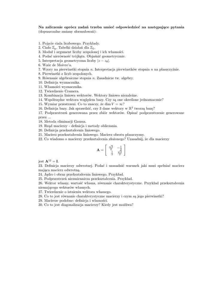 Na zaliczenie oprócz zadań trzeba umieć odpowiedzieć na następujące pytania (dopuszczalne zmiany sformułowań): 1. Pojęcie ciała liczbowego. Przykłady. 2. Ciało Zp . Tabelki działań dla Z5 . 3. Moduł i argument liczby zespolonej i ich własności. 4. Podać nierówność trójkąta. Objaśnić geometrycznie. 5. Interpretacja geometryczna liczby |z − z0 |. 6. Wzór de Moivre’a. 7. Wzory na pierwiastki stopnia n. Interpretacja pierwiastków stopnia n na płaszczyźnie. 8. Pierwiastki z liczb zespolonych. 9. Równanie algebraiczne stopnia n. Zasadnicze tw. algebry. 10. Definicja wyznacznika. 11. Własności wyznacznika. 12. Twierdzenie Cramera. 13. Kombinacja liniowa wektorów. Wektory liniowo niezależne. 14. Współrzędne wektora względem bazy. Czy są one określone jednoznacznie? 15. Wymiar przestrzeni. Co to znaczy, że dim V = ∞? 16. Definicja bazy. Jak sprawdzić, czy 3 dane wektory w R3 tworzą bazę? 17. Podprzestrzeń generowana przez zbiór wektorów. Opisać podprzestrzenie generowane przez ... 18. Metoda eliminacji Gaussa. 19. Rząd macierzy - definicja i metody obliczania. 20. Definicja przekształcenia liniowego. 21. Macierz przekształcenia liniowego. Macierz obrotu płaszczyzny. 22. Co wiadomo o macierzy przekształcenia złożonego? Uzasadnij, że dla macierzy # " √ 3 1 − 2 √2 A= 1 3 2 2 jest A12 = I. 23. Definicja macierzy odwrotnej. Podać i uzasadnić warunek jaki musi spełniać macierz mająca macierz odwrotną. 24. Jądro i obraz przekształcenia liniowego. Przykład. 25. Podprzestrzeń niezmiennicza przekształcenia. Przykład. 26. Wektor własny, wartość własna, równanie charakterystyczne. Przykład przekształcenia niemającego wektorów własnych. 27. Twierdzenie o istnieniu wektora własnego. 28. Co to jest równanie charakterystyczne macierzy i czym są jego pierwiastki? 29. Macierze podobne: definicja i własności. 30. Co to jest diagonalizacja macierzy? Kiedy jest możliwa?