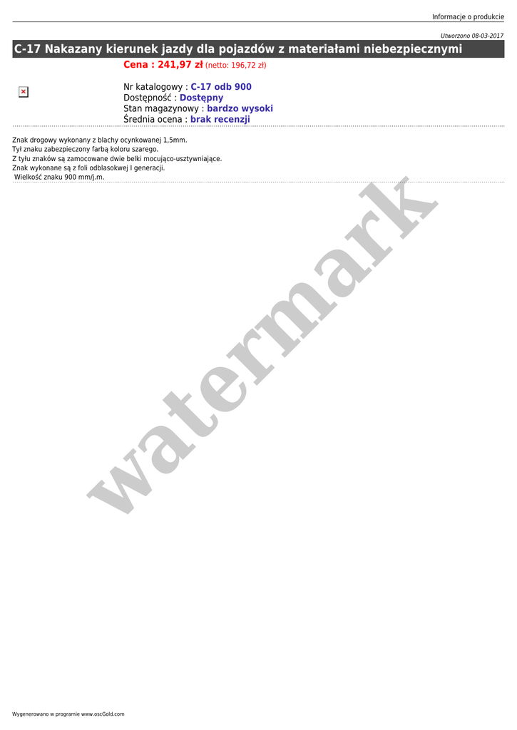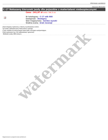 Informacje o produkcie Utworzono 08-03-2017 C-17 Nakazany kierunek jazdy dla pojazdów z materiałami niebezpiecznymi Cena : 241,97 zł (netto: 196,72 zł) Nr katalogowy : C-17 odb 900 Dostępność : Dostępny Stan magazynowy : bardzo wysoki Średnia ocena : brak recenzji w at er m ar k Znak drogowy wykonany z blachy ocynkowanej 1,5mm. Tył znaku zabezpieczony farbą koloru szarego. Z tyłu znaków są zamocowane dwie belki mocująco-usztywniające. Znak wykonane są z foli odblasokwej I generacji. Wielkość znaku 900 mm/j.m. Wygenerowano w programie www.oscGold.com