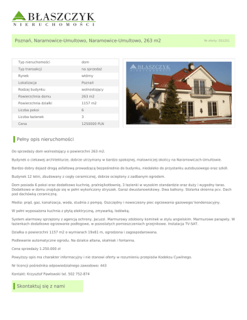 Poznań, Naramowice-Umultowo, Naramowice-Umultowo, 263 m2 Typ nieruchomości dom Typ transakcji na sprzedaż Rynek wtórny Lokalizacja Poznań Rodzaj budynku wolnostojący Powierzchnia domu 263 m2 Powierzchnia działki 1157 m2 Liczba pokoi 6 Liczba łazienek 3 Cena 1250000 PLN Nr oferty: DS1251 Pełny opis nieruchomości Do sprzedaży dom wolnostojący o powierzchni 263 m2. Bydynek o ciekawej architekturze, dobrze utrzymany w bardzo spokojnej, malowniczej okolicy na Naramowicach-Umultowie. Bardzo dobry dojazd drogą asfaltową prowadzącą bezpośrednio do budynku, niedaleko do przystanku autobusowego oraz szkół. Budynek 12 letni, zbudowany z cegły ceramicznej, dobrze ocieplony z zadbanym ogrodem. Dom posiada 6 pokoi oraz dodatkowo kuchnię, pralnię/kotłownię, 3 łazienki w wysokim standardzie oraz duży i wygodny taras. Dodatkowo w domu znajduje się w pełni wykończony stryszek. Garaż dwustanowiskowy. Dwa balkony. Stolarka okienna pcv. Dach pod dachówką ceramiczną. Media: prąd, gaz, kanalizacja, woda, studnia z pompą. Oszczędny i nowoczesny piec ogrzewania gazowego/ kondensacyjny. W pełni wyposażona kuchnia z płytą elektryczną, zmywarką, lodówką. System alarmowy sprzężony z agencją ochrony. Jacuzzi. Marmurowy zdobiony kominek w stylu angielskim. Marmurowe parapety. W łazienkach dodatkowe ogrzewanie podłogowe, w pozostałych pomieszczeniach grzejnikowe. Instalacja TV-SAT. Działka o powierzchni 1157 m2 o wymiarach 19x61 m, ogrodzona i zagospodarowana. Podlewanie automatyczne ogrodu. Na działce altana, skalniak i fontanna. Cena sprzedaży 1.250.000 zł Powyższy opis ma charakter informacyjny i nie stanowi oferty w rozumieniu przepisów Kodeksu Cywilnego. Nr licencji pośrednika odpowiedzialnego zawodowo: 443 Kontakt: Krzysztof Pawłowski tel. 502 752-874 Skontaktuj się z nami Krzysztof Pawłowski Numer licencji: 443 e-mail: [email protected] tel: 502 752 874 tel: 61 852 68 66 fax: 61 852 52 51 ul. Młyńska 3, 61-729 Poznań tel. 61 852 68 66 | fax. 61 851 52 51 e-mail: [email protected] www.blaszczyk.com.pl