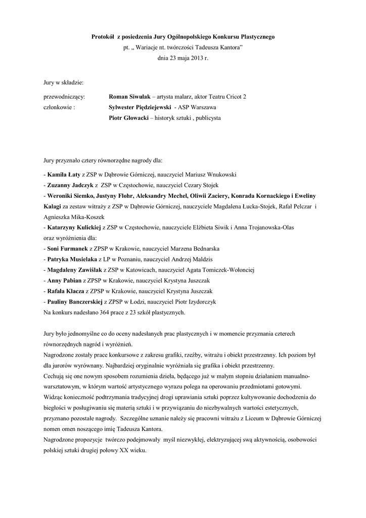 Protokół z posiedzenia Jury Ogólnopolskiego Konkursu Plastycznego pt. „ Wariacje nt. twórczości Tadeusza Kantora” dnia 23 maja 2013 r. Jury w składzie: przewodniczący: Roman Siwulak – artysta malarz, aktor Teatru Cricot 2 członkowie : Sylwester Piędziejewski - ASP Warszawa Piotr Głowacki – historyk sztuki , publicysta Jury przyznało cztery równorzędne nagrody dla: - Kamila Łaty z ZSP w Dąbrowie Górniczej, nauczyciel Mariusz Wnukowski - Zuzanny Jadczyk z ZSP w Częstochowie, nauczyciel Cezary Stojek - Weroniki Siemko, Justyny Flohr, Aleksandry Mechel, Oliwii Zaciery, Konrada Kornackiego i Eweliny Kalagi za zestaw witraży z ZSP w Dąbrowie Górniczej, nauczyciele Magdalena Łucka-Stojek, Rafał Pelczar i Agnieszka Mika-Koszek - Katarzyny Kulickiej z ZSP w Częstochowie, nauczyciele Elżbieta Siwik i Anna Trojanowska-Olas oraz wyróżnienia dla: - Soni Furmanek z ZPSP w Krakowie, nauczyciel Marzena Bednarska - Patryka Musielaka z LP w Poznaniu, nauczyciel Andrzej Maldzis - Magdaleny Zawiślak z ZSP w Katowicach, nauczyciel Agata Tomiczek-Wołonciej - Anny Pabian z ZPSP w Krakowie, nauczyciel Krystyna Juszczak - Rafała Klacza z ZPSP w Krakowie, nauczyciel Krystyna Juszczak - Pauliny Banczerskiej z ZPSP w Łodzi, nauczyciel Piotr Izydorczyk Na konkurs nadesłano 364 prace z 23 szkół plastycznych. Jury było jednomyślne co do oceny nadesłanych prac plastycznych i w momencie przyznania czterech równorzędnych nagród i wyróżnień. Nagrodzone zostały prace konkursowe z zakresu grafiki, rzeźby, witrażu i obiekt przestrzenny. Ich poziom był dla jurorów wyrównany. Najbardziej oryginalnie wyróżniała się grafika i obiekt przestrzenny. Cechują się one nowym sposobem rozumienia dzieła, będącego już w małym stopniu działaniem manualnowarsztatowym, w którym wartość artystycznego wyrazu polega na operowaniu przedmiotami gotowymi. Widząc konieczność podtrzymania tradycyjnej drogi uprawiania sztuki poprzez kultywowanie dochodzenia do biegłości w posługiwaniu się materią sztuki i w przywiązaniu do niezbywalnych wartości estetycznych, przyznano pozostałe nagrody. Szczególne uznanie należy się pracowni witrażu z Liceum w Dąbrowie Górniczej nomen omen noszącego imię Tadeusza Kantora. Nagrodzone propozycje twórczo podejmowały myśl niezwykłej, elektryzującej swą aktywnością, osobowości polskiej sztuki drugiej połowy XX wieku. Malarstwo zasługiwało niestety jedynie na wyróżnienie. Może to być dowód odchodzenia od refleksji i pracy warsztatowej na rzecz ulegania pewnej notoryczności natłoku obrazów totalnie władających percepcją, ale jednak ograniczającego drogę do samodzielnego rozwoju duchowego. Jury wyraża uznanie kierownictwu i kadrze ZSP im. Jacka Malczewskiego w Częstochowie za wysiłek i właściwy sposób w jaki środowisko to organizuje ogólnopolskie konkursy, stające się umiejętnym narzędziem artystycznej edukacji młodzieży polskiej.