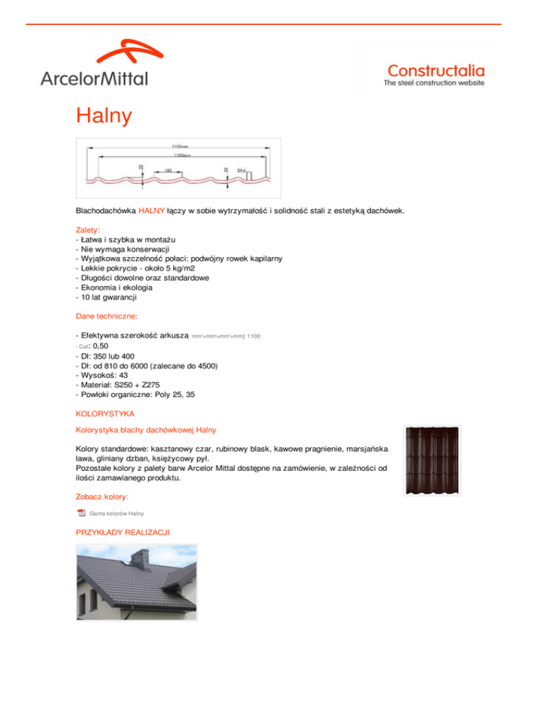 Halny Blachodachówka HALNY łączy w sobie wytrzymałość i solidność stali z estetyką dachówek. Zalety: - Łatwa i szybka w montażu - Nie wymaga konserwacji - Wyjątkowa szczelność połaci: podwójny rowek kapilarny - Lekkie pokrycie - około 5 kg/m2 - Długości dowolne oraz standardowe - Ekonomia i ekologia - 10 lat gwarancji Dane techniczne: - Efektywna szerokość arkusza mm'>mm'>mm'>mm]: 1100 - Cał : 0,50 - Dł: 350 lub 400 - Dł: od 810 do 6000 (zalecane do 4500) - Wysokoś: 43 - Materiał: S250 + Z275 - Powłoki organiczne: Poly 25, 35 KOLORYSTYKA Kolorystyka blachy dachówkowej Halny Kolory standardowe: kasztanowy czar, rubinowy blask, kawowe pragnienie, marsjańska lawa, gliniany dzban, księżycowy pył. Pozostałe kolory z palety barw Arcelor Mittal dostępne na zamówienie, w zależności od ilości zamawianego produktu. Zobacz kolory: Gama kolorów Halny PRZYKŁADY REALIZACJI Copyright © 2014 Constructalia. All rights reserved