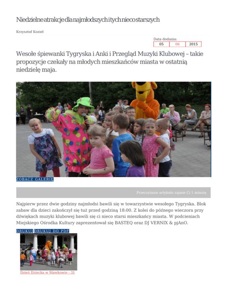 Niedzielneatrakcjedlanajmłodszychitychniecostarszych Krzysztof Kozieł Data dodania: 05 06 2015 Wesołe śpiewanki Tygryska i Anki i Przegląd Muzyki Klubowej – takie propozycje czekały na młodych mieszkańców miasta w ostatnią niedzielę maja. Z O BACZ GALE R IĘ Przeczytanie artykułu zajmie Ci 1 minutę Najpierw przez dwie godziny najmłodsi bawili się w towarzystwie wesołego Tygryska. Blok zabaw dla dzieci zakończył się tuż przed godziną 18:00. Z kolei do późnego wieczora przy dźwiękach muzyki klubowej bawili się ci nieco starsi mieszkańcy miasta. W podcieniach Miejskiego Ośrodka Kultury zaprezentował się BASTEQ oraz DJ VERNIX & pjAnO. D R U KUJ D RUKUJ DO PDF Dzień Dziecka w Sławkowie - 31 maja http://www.um.slawkow.pl/print.php?pdf=true&unique=niedzielne-atrakcje-dla-najmlodszych-i-tych-nieco-starszy ch&lang=us