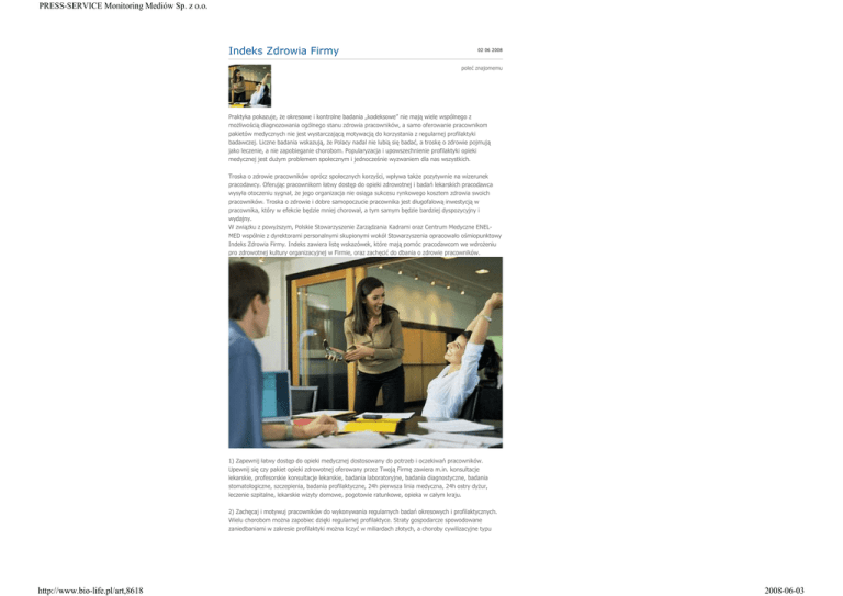 PRESS-SERVICE Monitoring Mediów Sp. z o.o. Indeks Zdrowia Firmy 02 06 2008 poleć znajomemu Praktyka pokazuje, Ŝe okresowe i kontrolne badania „kodeksowe” nie mają wiele wspólnego z moŜliwością diagnozowania ogólnego stanu zdrowia pracowników, a samo oferowanie pracownikom pakietów medycznych nie jest wystarczającą motywacją do korzystania z regularnej profilaktyki badawczej. Liczne badania wskazują, Ŝe Polacy nadal nie lubią się badać, a troskę o zdrowie pojmują jako leczenie, a nie zapobieganie chorobom. Popularyzacja i upowszechnienie profilaktyki opieki medycznej jest duŜym problemem społecznym i jednocześnie wyzwaniem dla nas wszystkich. Troska o zdrowie pracowników oprócz społecznych korzyści, wpływa takŜe pozytywnie na wizerunek pracodawcy. Oferując pracownikom łatwy dostęp do opieki zdrowotnej i badań lekarskich pracodawca wysyła otoczeniu sygnał, Ŝe jego organizacja nie osiąga sukcesu rynkowego kosztem zdrowia swoich pracowników. Troska o zdrowie i dobre samopoczucie pracownika jest długofalową inwestycją w pracownika, który w efekcie będzie mniej chorował, a tym samym będzie bardziej dyspozycyjny i wydajny. W związku z powyŜszym, Polskie Stowarzyszenie Zarządzania Kadrami oraz Centrum Medyczne ENELMED wspólnie z dyrektorami personalnymi skupionymi wokół Stowarzyszenia opracowało ośmiopunktowy Indeks Zdrowia Firmy. Indeks zawiera listę wskazówek, które mają pomóc pracodawcom we wdroŜeniu pro zdrowotnej kultury organizacyjnej w Firmie, oraz zachęcić do dbania o zdrowie pracowników. 1) Zapewnij łatwy dostęp do opieki medycznej dostosowany do potrzeb i oczekiwań pracowników. Upewnij się czy pakiet opieki zdrowotnej oferowany przez Twoją Firmę zawiera m.in. konsultacje lekarskie, profesorskie konsultacje lekarskie, badania laboratoryjne, badania diagnostyczne, badania stomatologiczne, szczepienia, badania profilaktyczne, 24h pierwsza linia medyczna, 24h ostry dyŜur, leczenie szpitalne, lekarskie wizyty domowe, pogotowie ratunkowe, opieka w całym kraju. 2) Zachęcaj i motywuj pracowników do wykonywania regularnych badań okresowych i profilaktycznych. Wielu chorobom moŜna zapobiec dzięki regularnej profilaktyce. Straty gospodarcze spowodowane zaniedbaniami w zakresie profilaktyki moŜna liczyć w miliardach złotych, a choroby cywilizacyjne typu http://www.bio-life.pl/art,8618 2008-06-03 PRESS-SERVICE Monitoring Mediów Sp. z o.o. cukrzyca czy schorzenia kręgosłupa to większe zagroŜenie dla ekonomii globalnej, niŜ strajki czy powaŜna recesja. 3) Zapewnij pracownikom przerwy na posiłki i odpoczynek podczas pracy zgodnie z Kodeksem Pracy. Pamiętaj, Ŝe większość błędów popełnianych przez pracowników, a takŜe wiele konfliktów w miejscu pracy jest skutkiem przemęczenia. 4) Daj moŜliwość wykorzystania całego przysługującego urlopu wypoczynkowego kaŜdemu pracownikowi wg zasad obowiązujących w Kodeksie Pracy. Badania przeprowadzone przez PSZK i Centrum Medyczne ENEL-MED pokazują, Ŝe tylko połowa ankietowanych w ciągu ostatnich 12 miesięcy wykorzystała cały przysługujący urlop wypoczynkowy, a 65% badanych podczas urlopu wypoczynkowego zdarzyło się wykonywać swoje obowiązki zawodowe. 5) Zapewnij komfortowe i nieszkodliwe dla zdrowia warunki pracy. Upewnij się czy w Twojej Firmie zachowane są wszystkie obowiązujące przepisy i środki ostroŜności dotyczące pracy z urządzeniami mechanicznymi, odpowiedniej wentylacji, oświetlenia itp. Inwestycja w zdrowe miejsce pracy jest nie tylko inwestycją w dobre samopoczucie pracownika, ale przede wszystkim w jego wydajność i efektywność w pracy. 6) Zorganizuj tryb pracy w taki sposób, aby pozostawiał czas na Ŝycie prywatne i rodzinne. Według badań PSZK i Centrum Medycznego ENEL-MED co czwarty ankietowany najbardziej ceni w swojej pracy moŜliwość pogodzenia Ŝycia zawodowego z prywatnym. Nie zmuszaj pracowników do pracy w nadgodzinach. W miarę moŜliwości dostosuj warunki pracy do potrzeb zatrudnionych w Twojej Firmie kobiet w ciąŜy i młodych matek. Pamiętaj, Ŝe zrównowaŜony rozwój pracowników zapewnia zrównowaŜony rozwój Twojego przedsiębiorstwa. 7) Monitoruj na bieŜąco potrzeby swoich pracowników. Wspieraj inicjatywy mające na celu poprawę zdrowia fizycznego i psychicznego pracowników tj. programy profilaktyczne, inicjatywy promujące zdrowy tryb Ŝycia, konsultacje psychologiczne lub inne świadczenia dostosowane do potrzeb pracowników. 8) Zapewnij swoim pracownikom szkolenia, warsztaty lub inne działania, które mają na celu podniesienie świadomości zdrowego stylu Ŝycia, walki ze szkodliwymi nałogami, rozwijanie umiejętności radzenia sobie ze stresem itp. Zdrowy i zadowolony pracownik jest najbardziej wiarygodną wizytówką Twojej firmy. http://www.bio-life.pl/art,8618 2008-06-03