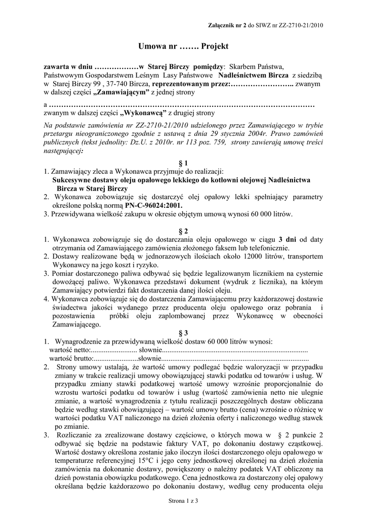 Załącznik nr 2 do SIWZ nr ZZ-2710-21/2010 Umowa nr ……. Projekt zawarta w dniu ………………w Starej Birczy pomiędzy: Skarbem Państwa, Państwowym Gospodarstwem Leśnym Lasy Państwowe Nadleśnictwem Bircza z siedzibą w Starej Birczy 99 , 37-740 Bircza, reprezentowanym przez:…………………….. zwanym w dalszej części „Zamawiającym” z jednej strony a ……………………………………………………………………………………………… zwanym w dalszej części ,,Wykonawcą” z drugiej strony Na podstawie zamówienia nr ZZ-2710-21/2010 udzielonego przez Zamawiającego w trybie przetargu nieograniczonego zgodnie z ustawą z dnia 29 stycznia 2004r. Prawo zamówień publicznych (tekst jednolity: Dz.U. z 2010r. nr 113 poz. 759, strony zawierają umowę treści następującej: §1 1. Zamawiający zleca a Wykonawca przyjmuje do realizacji: Sukcesywne dostawy oleju opałowego lekkiego do kotłowni olejowej Nadleśnictwa Bircza w Starej Birczy 2. Wykonawca zobowiązuje się dostarczyć olej opałowy lekki spełniający parametry określone polską normą PN-C-96024:2001. 3. Przewidywana wielkość zakupu w okresie objętym umową wynosi 60 000 litrów. §2 1. Wykonawca zobowiązuje się do dostarczania oleju opałowego w ciągu 3 dni od daty otrzymania od Zamawiającego zamówienia złożonego faksem lub telefonicznie. 2. Dostawy realizowane będą w jednorazowych ilościach około 12000 litrów, transportem Wykonawcy na jego koszt i ryzyko. 3. Pomiar dostarczonego paliwa odbywać się będzie legalizowanym licznikiem na cysternie dowożącej paliwo. Wykonawca przedstawi dokument (wydruk z licznika), na którym Zamawiający potwierdzi fakt dostarczenia danej ilości oleju. 4. Wykonawca zobowiązuje się do dostarczenia Zamawiającemu przy każdorazowej dostawie świadectwa jakości wydanego przez producenta oleju opałowego oraz pobrania i pozostawienia próbki oleju zaplombowanej przez Wykonawcę w obecności Zamawiającego. §3 1. Wynagrodzenie za przewidywaną wielkość dostaw 60 000 litrów wynosi: wartość netto:......................... słownie............................................................................... wartość brutto:........................słownie................................................................................ 2. Strony umowy ustalają, że wartość umowy podlegać będzie waloryzacji w przypadku zmiany w trakcie realizacji umowy obowiązującej stawki podatku od towarów i usług. W przypadku zmiany stawki podatkowej wartość umowy wzrośnie proporcjonalnie do wzrostu wartości podatku od towarów i usług (wartość zamówienia netto nie ulegnie zmianie, a wartość wynagrodzenia z tytułu realizacji poszczególnych dostaw obliczana będzie według stawki obowiązującej – wartość umowy brutto (cena) wzrośnie o różnicę w wartości podatku VAT naliczonego na dzień złożenia oferty i naliczonego według stawek po zmianie. 3. Rozliczanie za zrealizowane dostawy częściowe, o których mowa w § 2 punkcie 2 odbywać się będzie na podstawie faktury VAT, po dokonaniu dostawy cząstkowej. Wartość dostawy określona zostanie jako iloczyn ilości dostarczonego oleju opałowego w temperaturze referencyjnej 15°C i jego ceny jednostkowej określonej na dzień złożenia zamówienia na dokonanie dostawy, powiększony o należny podatek VAT obliczony na dzień powstania obowiązku podatkowego. Cena jednostkowa za dostarczony olej opałowy określana będzie każdorazowo po dokonaniu dostawy, według ceny producenta oleju Strona 1 z 3 Załącznik nr 2 do SIWZ nr ZZ-2710-21/2010 4. 1. 2. 3. wskazanego w ofercie (obowiązującej na dzień złożenia zamówienia na dostawę) pomniejszonej o podany w ofercie rabat cenowy (ewentualnie powiększonej o marżę). Strony umowy ustalają, że dopuszczają możliwość redukcji wielkości dostaw wymienionych w § 1 punkt 3. W takim przypadku Wykonawcy nie przysługują żadne dodatkowe roszczenia. §4 Zamawiający zobowiązuje się do zapłaty należności za zrealizowane dostawy oleju opałowego w terminie 21 dni od daty otrzymania faktury, przelewem na konto Wykonawcy, podane na fakturze. Podstawą wystawienia faktury jest potwierdzony przez Zamawiającego dokument, o którym mowa w § 2 punkt 3 niniejszej umowy, potwierdzający faktyczną ilość dostawy. Za zwłokę w zapłacie faktury przekraczającą termin określony w punkcie 1 Wykonawca może naliczyć odsetki ustawowe §5 1. W przypadku nie dotrzymania umówionego terminu dostawy oleju, o którym mowa w § 2 Zamawiający uprawniony jest do zakupu oleju z innego źródła. W takim przypadku kosztami dostawy obciąży Wykonawcę. Ponadto Wykonawca zobowiązany będzie do pokrycia wszelkich ewentualnych szkód związanych z uszkodzeniem urządzeń lub niedogrzaniem pomieszczeń. 2. Przekroczenie terminu dostawy, o którym mowa w § 2 upoważnia Zamawiającego do naliczenia odsetek karnych w wysokości 0,1 % wartości umowy za każdy dzień zwłoki. Strony ustalają, iż przekroczenie terminu o jeden dzień nie stanowi podstawy do naliczenia kar umownych. 3. W przypadku, gdy dojdzie do awarii lub zanieczyszczeń pieców i urządzeń w kotłowni spowodowanych złą jakością oleju (potwierdzona negatywną oceną próbek o których mowa w § 2 punkt 4) naprawa urządzeń nastąpi na koszt Wykonawcy. 4. W przypadku rozwiązania umowy z winy Wykonawcy lub Zamawiającego, stronom umowy przysługuje odszkodowanie w wysokości 5% wartości umowy. 5. Zamawiającemu i Wykonawcy przysługuje prawo dochodzenia odszkodowania na zasadach ogólnych kodeksu cywilnego §6 1. Umowa niniejsza została zawarta na czas określony od dnia ….01.2010 do 31.12.2011 r. 2. Strony umowy ustalają możliwość przedłużenia okresu obowiązywania umowy w przypadku, gdy w okresie podanym w punkcie 1 zaistnieją okoliczności, które uniemożliwią Zamawiającemu przyjęcie ostatniej dostawy (np. brak miejsca w zbiornikach) b