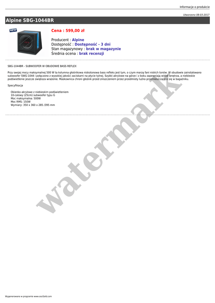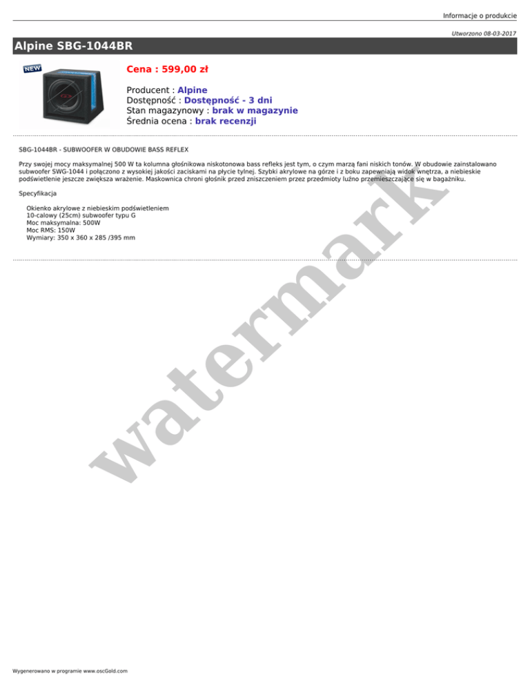 Informacje o produkcie Utworzono 08-03-2017 Alpine SBG-1044BR Cena : 599,00 zł Producent : Alpine Dostępność : Dostępność - 3 dni Stan magazynowy : brak w magazynie Średnia ocena : brak recenzji SBG-1044BR - SUBWOOFER W OBUDOWIE BASS REFLEX Przy swojej mocy maksymalnej 500 W ta kolumna głośnikowa niskotonowa bass refleks jest tym, o czym marzą fani niskich tonów. W obudowie zainstalowano subwoofer SWG-1044 i połączono z wysokiej jakości zaciskami na płycie tylnej. Szybki akrylowe na górze i z boku zapewniają widok wnętrza, a niebieskie podświetlenie jeszcze zwiększa wrażenie. Maskownica chroni głośnik przed zniszczeniem przez przedmioty luźno przemieszczające się w bagażniku. er m ar k Specyfikacja w at Okienko akrylowe z niebieskim podświetleniem 10-calowy (25cm) subwoofer typu G Moc maksymalna: 500W Moc RMS: 150W Wymiary: 350 x 360 x 285 /395 mm Wygenerowano w programie www.oscGold.com