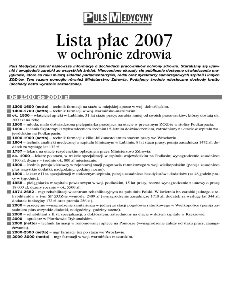 Lista p∏ac 2007 w ochronie zdrowia Puls Medycyny zebra∏ najnowsze informacje o dochodach pracowników ochrony zdrowia. StaraliÊmy si´ ujawniç i uwzgl´dniç zarobki ze wszystkich êróde∏. Nieocenione okaza∏y si´ publicznie dost´pne oÊwiadczenia majàtkowe, które co roku muszà sk∏adaç parlamentarzyÊci, radni oraz dyrektorzy samorzàdowych szpitali i innych ZOZ-ów. Tym razem pomog∏o równie˝ Ministerstwo Zdrowia. Podajemy Êrednie miesi´czne dochody brutto (dochody netto wyraênie zaznaczone). Od 1500 do 2000 z∏ n 1300-1600 (netto) – technik farmacji na sta˝u w miejskiej aptece w woj. dolnoÊlàskim. n 1400-1700 (netto) – technik farmacji w woj. warmiƒsko-mazurskim. n ok. 1500 – w∏aÊciciel apteki w Lublinie, 31 lat sta˝u pracy; zarabia mniej od swoich pracowników, którzy dostajà ok. 2000 z∏ na r´k´. n 1500 – m∏oda, ma∏o doÊwiadczona piel´gniarka pracujàca na etacie w prywatnym ZOZ-ie w stolicy Podkarpacia. n 1600 – technik fizjoterapii z wykszta∏ceniem Êrednim i 5-letnim doÊwiadczeniem, zatrudniony na etacie w szpitalu wojewódzkim na Podkarpaciu. n 1600-1900 (netto) – technik farmacji z kilku-kilkunastoletnim sta˝em pracy we Wroc∏awiu. n 1604 – technik analityki medycznej w szpitalu klinicznym w Lublinie, 8 lat sta˝u pracy, pensja zasadnicza 1472 z∏, dodatek za wys∏ug´ lat 132 z∏. n 1757 – lekarz na etacie rezydenckim op∏acanym przez Ministerstwo Zdrowia. n ok. 1900 – lekarz po sta˝u, w trakcie specjalizacji w szpitalu wojewódzkim na Podlasiu; wynagrodzenie zasadnicze 1100 z∏, dy˝ury – Êrednio ok. 800 z∏ miesi´cznie. n 1900 – Êrednia pensja kierowcy w rejonowej stacji pogotowia ratunkowego w woj. wielkopolskim (pensja zasadnicza plus wszystkie dodatki, nadgodziny, godziny nocne). n 1900 – lekarz z II st. specjalizacji w sto∏ecznym szpitalu, pensja zasadnicza bez dy˝urów i dodatków (za 48 godzin pracy w tygodniu). n 1958 – piel´gniarka w szpitalu powiatowym w woj. podlaskim, 15 lat pracy, roczne wynagrodzenie z umowy o prac´ 18 000 z∏, dy˝ury rocznie – ok. 5500 z∏. n 1971-2682 – mgr rehabilitacji w centrum rehabilitacyjnym na po∏udniu Polski. W kwietniu br. zarobki jednego z rehabilitantów w tym SP ZOZ-ie wynios∏y: 2489 z∏ (wynagrodzenie zasadnicze 1718 z∏, dodatek za wys∏ug´ lat 344 z∏, dodatek funkcyjny 172 z∏ oraz premia 256 z∏). n 2000 – przeci´tne wynagrodzenie sanitariusza w jednej ze stacji pogotowia ratunkowego w Wielkopolsce (pensja zasadnicza plus wszystkie dodatki, nadgodziny, godziny nocne). n 2000 – rehabilitant z II st. specjalizacji, z doktoratem, zatrudniony na etacie w du˝ym szpitalu w Rzeszowie. n 2000 – aptekarz w Piotrkowie Trybunalskim. n 2000 (netto) – technik farmacji w renomowanej aptece na Pomorzu (wynagrodzenie zale˝y od sta˝u pracy, zaanga˝owania). n 2000-2500 (netto) – mgr farmacji tu˝ po sta˝u we Wroc∏awiu. n 2000-3000 (netto) – mgr farmacji w woj. warmiƒsko-mazurskim.