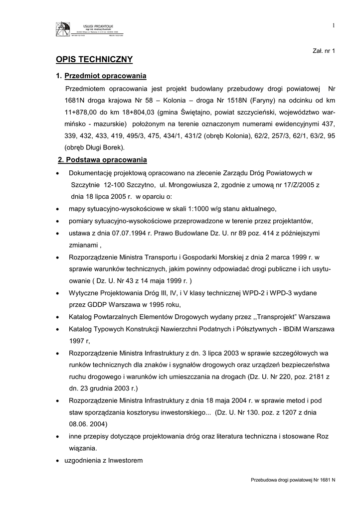 1 mgr inż. Andrzej Dusiński 06-500 M³awa ul. Radosna 2 m 43 tel. 023/654 4498 NIP 569-102-19-05 REGON 130231285 Zał. nr 1 OPIS TECHNICZNY 1. Przedmiot opracowania Przedmiotem opracowania jest projekt budowlany przebudowy drogi powiatowej Nr 1681N droga krajowa Nr 58 – Kolonia – droga Nr 1518N (Faryny) na odcinku od km 11+878,00 do km 18+804,03 (gmina Świętajno, powiat szczycieński, województwo warmińsko - mazurskie) położonym na terenie oznaczonym numerami ewidencyjnymi 437, 339, 432, 433, 419, 495/3, 475, 434/1, 431/2 (obręb Kolonia), 62/2, 257/3, 62/1, 63/2, 95 (obręb Długi Borek). 2. Podstawa opracowania Dokumentację projektową opracowano na zlecenie Zarządu Dróg Powiatowych w Szczytnie 12-100 Szczytno, ul. Mrongowiusza 2, zgodnie z umową nr 17/Z/2005 z dnia 18 lipca 2005 r. w oparciu o: mapy sytuacyjno-wysokościowe w skali 1:1000 w/g stanu aktualnego, pomiary sytuacyjno-wysokościowe przeprowadzone w terenie przez projektantów, ustawa z dnia 07.07.1994 r. Prawo Budowlane Dz. U. nr 89 poz. 414 z późniejszymi zmianami , Rozporządzenie Ministra Transportu i Gospodarki Morskiej z dnia 2 marca 1999 r. w sprawie warunków technicznych, jakim powinny odpowiadać drogi publiczne i ich usytuowanie ( Dz. U. Nr 43 z 14 maja 1999 r. ) Wytyczne Projektowania Dróg III, IV, i V klasy technicznej WPD-2 i WPD-3 wydane przez GDDP Warszawa w 1995 roku, Katalog Powtarzalnych Elementów Drogowych wydany przez ,,Transprojekt” Warszawa Katalog Typowych Konstrukcji Nawierzchni Podatnych i Półsztywnych - IBDiM Warszawa 1997 r, Rozporządzenie Ministra Infrastruktury z dn. 3 lipca 2003 w sprawie szczegółowych wa runków technicznych dla znaków i sygnałów drogowych oraz urządzeń bezpieczeństwa ruchu drogowego i warunków ich umieszczania na drogach (Dz. U. Nr 220, poz. 2181 z dn. 23 grudnia 2003 r.) Rozporządzenie Ministra Infrastruktury z dnia 18 maja 2004 r. w sprawie metod i pod staw sporządzania kosztorysu inwestorskiego... (Dz. U. Nr 130. poz. z 1207 z dnia 08.06. 2004) inne przepisy dotyczące projektowania dróg oraz literatura techniczna i stosowane Roz wiązania. uzgodnienia z Inwestorem Przebudowa drogi powiatowej Nr 1681 N 2 mgr inż. Andrzej Dusiński 06-500 M³awa ul. Radosna 2 m 43 tel. 023/654 4498 NIP 569-102-19-05 REGON 130231285 3. Cel i zakres opracowania Celem opracowania jest wykonanie dokumentacji budowlanej przebudowy drogi powiatowej nr 1681N droga krajowa Nr 58 – Kolonia – droga Nr 1518N (Faryny) na odcinku od km 11+878,00 do km 18+804,03. Początek przebudowywanego odcinka przyjęto w km 11+878 na skrzyżowaniu z drogą Spychowo – Świętajno (oś drogi). Koniec znajduje się w km 18,804,03 na skrzyżowaniu z drogą Kolonia – Faryny. Roboty przy przebudowie tego odcinka będą polegały na wykonaniu robót ziemnych przy poszerzeniu konstrukcji jezdni i wykonaniu rowów drogowych, wykonaniu podbudowy na poszerzeniu z kruszywa łamanego, podbudowy z mieszanki MCE, podbudowy z kruszywa stabilizowanego cementem, wykonaniu dwuwarstwowej nawierzchni asfaltowej, wykonaniu chodników, wjazdów i zjazdów, uzupełnienia odwodnienia o przepusty i ścieki podchodnikowe oraz wykonanie poboczy i oznakowania. Wykonanie zakresu projektowanego wymaga oprócz wykorzystania terenu zajmowanego przez drogę obecnie, także wejście na trzy działki będące własnością prywatnych właścicieli. To wejście w działki prywatne dotyczy kolektora deszczowego, którego budowa obejmuje oddzielne opracowanie. Zmodernizowana droga poprawi zdecydowanie warunki poruszania się po niej wszystkim użytkownikom. Trwała i bezpieczna droga, przejezdna przez cały rok dla wszelkich pojazdów, zapewni rolnikom lepszy dostęp do środków produkcji i umożliwi sprawny wywóz wytworzonych produktów. Budowa chodników poprawi bezpieczeństwo pieszych, którzy obecnie poruszają się poboczem drogi i na krótkich odcinkach zniszczonym chodnikiem. Obniżone zostaną koszty utrzymania drogi, które przy istniejącej obecnie zniszczonej nawierzchni z betonu smołowego są znaczne a wiążą się z kilkakrotnymi w ciągu roku zabiegami remontów cząstkowych, wypełniania wybojów, uszczelniania spękań i krawędzi i uzupełniania poboczy kruszywem, które służą przy wąskiej nawierzchni jako pas ruchu. Przebudowana droga poprawi też możliwość korzystania z komunikacji zbiorowej. Zmodernizowana droga podniesie walory miejscowości Kolonia i Długi Borek oraz terenów przyległych do drogi, które z uwagi na swoje położenie (tereny zalesione, bliskie sąsiedztwo jezior) mogą stać się miejscem do rozwoju agroturystyki lub nowych osiedleń. 4. Opis stanu istniejącego Początek odcinka znajduje się na skrzyżowaniu z drogą o nawierzchni szerokości 5,80 m. Droga powiatowa Nr 1681N na przebudowywanym odcinku posiada przekrój półuliczny na odcinku od km 11+878,00 do km 12+232 z chodnikiem prawostronnym z płyt chodnikowych betonowych 50x50x7 cm i 35x35x5 cm. Chodnik znajduje się w poziomie jezdni lub jest wyniesiony ponad nawierzchnię na wysokość do 5 cm. Szerokość chodnika jest zmienna od 1,00 do 1,70 m. Wjazdy do przyległych posesji posiadają nawierzchnię gruntową. Krawężnik ciężki na odcinku od 11+878 do km 12+070 o łącznej długości 192 m i dalej do km 12+232 Przebudowa drogi powiatowej Nr 1681 N 3 mgr inż. Andrzej Dusiński 06-500 M³awa ul. Radosna 2 m 43 tel. 023/654 4498 NIP 569-102-19-05 REGON 130231285 krawężnik lekki o łącznej długości 145 m. Od km 12+109 do km 12+134 przerwa w chodniku i tu znajduje się pobocze gruntowe. Po stronie lewej bez chodnika z poboczem gruntowym. Istniejąca nawierzchnia z betonu smołowego powierzchniowo utrwalonego bitumem i grysami grubości do 5 cm ułożona jest na bruku na odcinku od km 11+878 do km 12+396 do skrzyżowania z linią kolejowa jednotorową. Szerokość nawierzchni wynosi 4,0- 4,1 m. Szerokość pasa drogowego na odcinku w miejscowości Kolonia o obustronnej zwartej zabudowie (do 