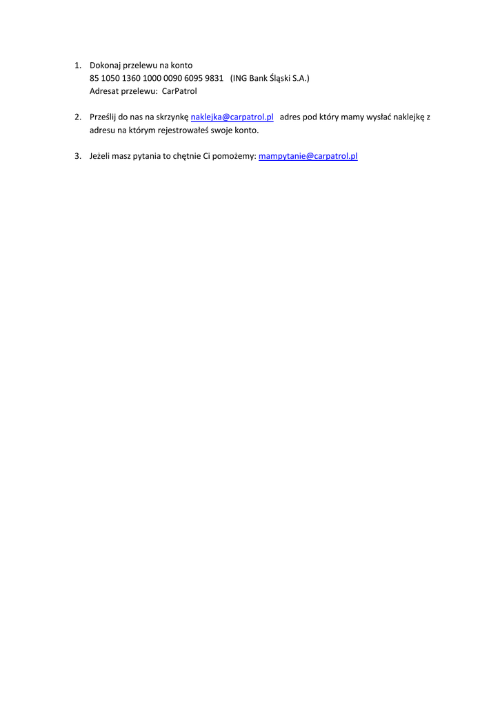 1. Dokonaj przelewu na konto 85 1050 1360 1000 0090 6095 9831 (ING Bank Śląski S.A.) Adresat przelewu: CarPatrol 2. Prześlij do nas na skrzynkę [email protected] adres pod który mamy wysłać naklejkę z adresu na którym rejestrowałeś swoje konto. 3. Jeżeli masz pytania to chętnie Ci pomożemy: [email protected]