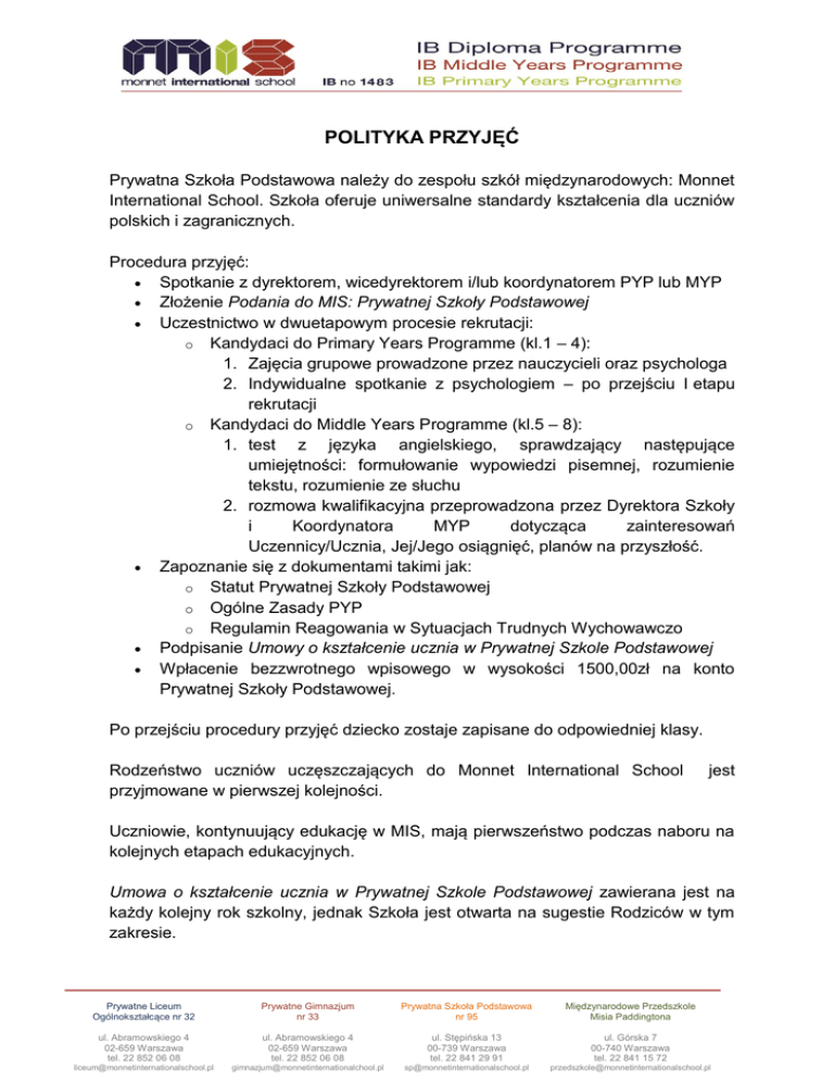 POLITYKA PRZYJĘĆ Prywatna Szkoła Podstawowa należy do zespołu szkół międzynarodowych: Monnet International School. Szkoła oferuje uniwersalne standardy kształcenia dla uczniów polskich i zagranicznych. Procedura przyjęć: Spotkanie z dyrektorem, wicedyrektorem i/lub koordynatorem PYP lub MYP Złożenie Podania do MIS: Prywatnej Szkoły Podstawowej Uczestnictwo w dwuetapowym procesie rekrutacji: o Kandydaci do Primary Years Programme (kl.1 – 4): 1. Zajęcia grupowe prowadzone przez nauczycieli oraz psychologa 2. Indywidualne spotkanie z psychologiem – po przejściu I etapu rekrutacji o Kandydaci do Middle Years Programme (kl.5 – 8): 1. test z języka angielskiego, sprawdzający następujące umiejętności: formułowanie wypowiedzi pisemnej, rozumienie tekstu, rozumienie ze słuchu 2. rozmowa kwalifikacyjna przeprowadzona przez Dyrektora Szkoły i Koordynatora MYP dotycząca zainteresowań Uczennicy/Ucznia, Jej/Jego osiągnięć, planów na przyszłość. Zapoznanie się z dokumentami takimi jak: o Statut Prywatnej Szkoły Podstawowej o Ogólne Zasady PYP o Regulamin Reagowania w Sytuacjach Trudnych Wychowawczo Podpisanie Umowy o kształcenie ucznia w Prywatnej Szkole Podstawowej Wpłacenie bezzwrotnego wpisowego w wysokości 1500,00zł na konto Prywatnej Szkoły Podstawowej. Po przejściu procedury przyjęć dziecko zostaje zapisane do odpowiedniej klasy. Rodzeństwo uczniów uczęszczających do Monnet International School przyjmowane w pierwszej kolejności. jest Uczniowie, kontynuujący edukację w MIS, mają pierwszeństwo podczas naboru na kolejnych etapach edukacyjnych. Umowa o kształcenie ucznia w Prywatnej Szkole Podstawowej zawierana jest na każdy kolejny rok szkolny, jednak Szkoła jest otwarta na sugestie Rodziców w tym zakresie. Prywatne Liceum Ogólnokształcące nr 32 Prywatne Gimnazjum nr 33 Prywatna Szkoła Podstawowa nr 95 Międzynarodowe Przedszkole Misia Paddingtona ul. Abramowskiego 4 02-659 Warszawa tel. 22 852 06 08 ul. Abramowskiego 4 02-659 Warszawa tel. 22 852 06 08 ul. Stępińska 13 00-739 Warszawa tel. 22 841 29 91 ul. Górska 7 00-740 Warszawa tel. 22 841 15 72 [email protected] [email protected] [email protected] [email protected]