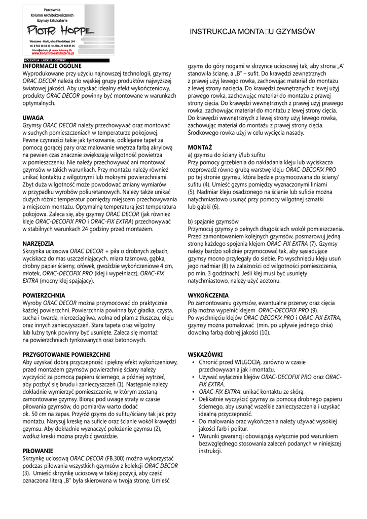 INSTRUKCJA MONTAŻU GZYMSÓW www.kolumny-sztukateria.pl INFORMACJE OGÓLNE Wyprodukowane przy użyciu najnowszej technologii, gzymsy ORAC DECOR należą do wąskiej grupy produktów najwyższej światowej jakości. Aby uzyskać idealny efekt wykończeniowy, produkty ORAC DECOR powinny być montowane w warunkach optymalnych. UWAGA Gzymsy ORAC DECOR należy przechowywać oraz montować w suchych pomieszczeniach w temperaturze pokojowej. Pewne czynności takie jak tynkowanie, odklejanie tapet za pomocą gorącej pary oraz malowanie wnętrza farbą akrylową na pewien czas znacznie zwiększają wilgotność powietrza w pomieszczeniu. Nie należy przechowywać ani montować gzymsów w takich warunkach. Przy montażu należy również unikać kontaktu z wilgotnymi lub mokrymi powierzchniami. Zbyt duża wilgotność może powodować zmiany wymiarów w przypadku wyrobów poliuretanowych. Należy także unikać dużych różnic temperatur pomiędzy miejscem przechowywania a miejscem montażu. Optymalną temperaturą jest temperatura pokojowa. Zaleca się, aby gzymsy ORAC DECOR (jak również kleje ORAC-DECOFIX PRO i ORAC-FIX EXTRA) przechowywać w stabilnych warunkach 24 godziny przed montażem. NARZĘDZIA Skrzynka uciosowa ORAC DECOR + piła o drobnych zębach, wyciskacz do mas uszczelniających, miara taśmowa, gąbka, drobny papier ścierny, ołówek, gwoździe wykończeniowe 4 cm, młotek, ORAC-DECOFIX PRO (klej i wypełniacz), ORAC-FIX EXTRA (mocny klej spajający). gzyms do góry nogami w skrzynce uciosowej tak, aby strona „A” stanowiła ścianę, a „B” – sufit. Do krawędzi zewnętrznych z prawej użyj lewego rowka, zachowując materiał do montażu z lewej strony nacięcia. Do krawędzi zewnętrznych z lewej użyj prawego rowka, zachowując materiał do montażu z prawej strony cięcia. Do krawędzi wewnętrznych z prawej użyj prawego rowka, zachowując materiał do montażu z lewej strony cięcia. Do krawędzi wewnętrznych z lewej strony użyj lewego rowka, zachowując materiał do montażu z prawej strony cięcia. Środkowego rowka użyj w celu wycięcia nasady. MONTAŻ a) gzymsu do ściany i/lub sufitu Przy pomocy grzebienia do nakładania kleju lub wyciskacza rozprowadź równo grubą warstwę kleju ORAC-DECOFIX PRO po tej stronie gzymsu, która będzie przymocowana do ściany/ sufitu (4). Umieść gzyms pomiędzy wyznaczonymi liniami (5). Nadmiar kleju osadzonego na ścianie lub suficie można natychmiastowo usunąć przy pomocy wilgotnej szmatki lub gąbki (6). b) spajanie gzymsów Przymocuj gzymsy o pełnych długościach wokół pomieszczenia. Przed zamontowaniem kolejnych gzymsów, posmarowuj jedną stronę każdego spojenia klejem ORAC-FIX EXTRA (7). Gzymsy należy bardzo solidnie przymocować tak, aby sąsiadujące gzymsy mocno przylegały do siebie. Po wyschnięciu kleju usuń jego nadmiar (8) (w zależności od wilgotności pomieszczenia, po min. 3 godzinach). Jeśli klej musi być usunięty natychmiastowo, należy użyć acetonu. POWIERZCHNIA Wyroby ORAC DECOR można przymocować do praktycznie każdej powierzchni. Powierzchnia powinna być gładka, czysta, sucha i twarda, nierozciągliwa, wolna od plam z tłuszczu, oleju oraz innych zanieczyszczeń. Stara tapeta oraz wilgotny lub luźny tynk powinny być usunięte. Zaleca się montaż na powierzchniach tynkowanych oraz betonowych. WYKOŃCZENIA Po zamontowaniu gzymsów, ewentualne przerwy oraz cięcia piłą można wypełnić klejem ORAC-DECOFIX PRO (9). Po wyschnięciu klejów ORAC-DECOFIX PRO i ORAC-FIX EXTRA, gzymsy można pomalować (min. po upływie jednego dnia) dowolną farbą dobrej jakości (10). PRZYGOTOWANIE POWIERZCHNI Aby uzyskać dobrą przyczepność i piękny efekt wykończeniowy, przed montażem gzymsów powierzchnię ściany należy wyczyścić za pomocą papieru ściernego, a później wytrzeć, aby pozbyć się brudu i zanieczyszczeń (1). Następnie należy dokładnie wymierzyć pomieszczenie, w którym zostaną zamontowane gzymsy. Biorąc pod uwagę straty w czasie piłowania gzymsów, do pomiarów warto dodać ok. 50 cm na zapas. Przyłóż gzyms do sufitu/ściany tak jak przy montażu. Narysuj kreskę na suficie oraz ścianie wokół krawędzi gzymsu. Aby dokładnie wyznaczyć położenie gzymsu (2), wzdłuż kreski można przybić gwoździe. WSKAZÓWKI • Chronić przed WILGOCIĄ, zarówno w czasie przechowywania jak i montażu. • Używać wyłącznie klejów ORAC-DECOFIX PRO oraz ORACFIX EXTRA. • ORAC-FIX EXTRA: unikać kontaktu ze skórą. • Delikatnie wyczyścić gzymsy za pomocą drobnego papieru ściernego, aby usunąć wszelkie zanieczyszczenia i uzyskać idealną przyczepność. • Do malowania oraz wykończenia należy używać wysokiej jakości farb i politur. • Warunki gwarancji obowiązują wyłącznie pod warunkiem bezwzględnego stosowania zaleceń podanych w niniejszej instrukcji. PIŁOWANIE Skrzynkę uciosową ORAC DECOR (FB.300) można wykorzystać podczas piłowania wszystkich gzymsów z kolekcji ORAC DECOR (3). Umieść skrzynkę uciosową w takiej pozycji, aby część oznaczona literą „B” była skierowana w twoją stronę. Umieść