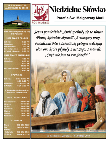 111 S. HUBBARD ST. ALGONQUIN, IL 60102 Niedzielne Słówko Parafia Św. Małgorzaty Marii www.saintmargaretmary.org PO POLSKU MSZE ŚW. PO POLSKU Sobota: Niedziela: Poniedziałek: Dni świąteczne: I Piątek Miesiąca: 6:30 1:00 7:00 7:30 7:30 PM PM PM PM PM MSZE ŚW. PO ANGIELSKU Sobota: Niedziela: Dni powszednie: 4:30 7:00 9:00 11:00 7:00 8:30 Jezus powiedział: „Dziś spełniły się te słowa Pisma, któreście słyszeli”. A wszyscy przyświadczali Mu i dziwili się pełnym wdzięku słowom, które płynęły z ust Jego. I mówili: „Czyż nie jest to syn Józefa?”. PM AM AM AM AM AM SPOWIEDŹ Sobota: Niedziela: I Piątek: 9:00-10:30 AM 6:00-6:30 PM 12:30-1:00 PM 6:30-7:30 PM W innym terminie prosimy o kontakt telefoniczny BIURO PARAFIALNE Poniedziałek: Wtorek: Środa: Czwartek: Piątek: Sobota: Niedziela: 9:00-5:00 9:00-5:00 9:00-5:00 9:00-5:00 9:00-5:00 11:00-1:00 1:00-3:00 KONTAKTY Biuro Fax Szkoły: -Katolicka -Polska 847-658 7625 847-658 7882 847-658 5313 224-436 0320 IV NIEDZIELA ZWYKŁA - 3 LUTEGO 2013 Niedzielne Słówko Refleksja Przyznaj, że potrzebujesz pomocy Przyznać się do potrzeby uzdrowienia jest niezmiernie trudno, gdyż to oznacza utratę dumnej maski kogoś, kto sobie świetnie radzi. Żydzi w synagodze byli nastawieni na piękne kazanie o wszystkim i o niczym. Tymczasem Jezus przychodzi z uzdrowieniem, ale żeby doznać uzdrowienia, trzeba w sobie uznać chorobę. Wcale nie jest łatwo powiedzieć o sobie, że się jest chorym wewnętrznie. Dlatego Jezus przypomina im wdowę z Sarepty, kobietę, która, co prawda z ogromnym trudem, ale w końcu przyznała się Eliaszowi, że ma ukryty grzech, gdy jej syn W Nazarecie w synagodze, po czytaniu z proumarł. Nie jest przyjemnie przyznawać się do słabości. Ewangelia według św. Łukasza 4,21-30 Wdowa, cudzoziemiec, sierota - należeli do najbardziej potrzebujących pomocy w starożytnym społeczeństwie. Wdowy były zobowiązywane do milczenia, stąd związek między słowem ILMENA - wdowa i ILLAM - niemy. Symbolicznie więc wdową jest ten, kto nic nie chce mówić, odczuwa paraliż lęku i wstydu, również ktoś, kto milczy, bo nie chce mówić o sobie prawdy. Dlaczego lękamy się odzywać? Ponieważ boimy się upokorzenia. Ludzie milczą, gdy się wstydzą samych siebie i żądają milczenia od innych, gdy lękają się poznać prawdę o sobie. A gdy się im przypomni, kim są naprawdę, wybuchają eksplozją wściekłości. Życie niejednego z nas upokorzyło i okaleczyło. Jak wielu z nas wzrastało w otoczeniu, które nas wykorzystało, a my nie potrafiliśmy się obronić i nie zdołaliśmy stworzyć granic bezpieczeństwa. Dziecko jest zbyt słabe, by skutecznie się bronić, i każde cierpienie jest dla niego zbyt duże. A gdy dorasta, może się okazać, że samo też potrafi ranić, więc się wycofuje, zamyka, jeszcze bardziej wstydzi, już nie tylko tego, co inni mu zrobili, ale też tego, czego samo się dopuściło. Dlatego buduje MURY, by ochronić siebie samego przed upokorzeniami. Mury, które wydają się chronić, zamykają, izolują i tworzą wielką smutną samotność. Wdowa z Sarepty zbierała drewno poza murami. To ma wymiar symboliczny: szuka opału, szuka ciepła, ale zaledwie poza murami, tuż za bramą. roctwa Izajasza, Jezus powiedział: „Dziś spełniły się te słowa Pisma, któreście słyszeli”. A wszyscy przyświadczali Mu i dziwili się pełnym wdzięku słowom, które płynęły z ust Jego. I mówili: „Czyż nie jest to syn Józefa?”. Wtedy rzekł do nich „Z pewnością powiecie mi to przysłowie: „Lekarzu, ulecz samego siebie; dokonajże i tu, w swojej ojczyźnie, tego, co wydarzyło się, jak słyszeliśmy, w Kafarnaum«”. I dodał: „Zaprawdę powiadam wam: Żaden prorok nie jest mile widziany w swojej ojczyźnie. Naprawdę mówię wam: Wiele wdów było w Izraelu za czasów Eliasza, kiedy niebo pozostawało zamknięte przez trzy lata i sześć miesięcy, tak że wielki głód panował w całym kraju; a Eliasz do żadnej z nich nie został posłany, tylko do owej wdowy w Sarepcie Sydońskiej. I wielu trędowatych było w Izraelu za proroka Elizeusza, a żaden z nich nie został oczyszczony, tylko Syryjczyk Naaman”. Na te słowa wszyscy w synagodze unieśli się gniewem. Porwali się z miejsca, wyrzucili Go z miasta i wyprowadzili aż na stok góry, na której ich miasto było zbudowane, aby Go strącić. On jednak przeszedłszy pośród nich, oddalił się. Wystarczy otworzyć się choć trochę na tego, którego posyła Bóg, by zaczęło się uzdrowienie. A posyła nam już nie Eliasza, ale samego Chrystusa! Mury Sarepty to mury gniewu, lęku, buntu, użalania się nad sobą, zwątpienia w siebie i w poprawę swojego losu, utraty wartości i godności. Mury zasłaniające głód: wdowa ma już tylko garść oliwy i mąki. Głód ciepła i miłości bardziej niż zwykły głód. Człowiek zraniony nie chce nic od nikogo, nawet od Jezusa. Bóg potrafi się pochylić jak Eliasz nad umarłym dzieckiem wdowy i wskrzesić w nas nowe życie. Bliskość Boga jest dla nas szansą na wskrzeszenie do nowego życia. Bóg może uczynić z nas zupełnie innego człowieka, jeśli ukażemy Mu siebie w prawdzie. Czy nie potrzebujesz bezwarunkowej miłości Boga, Jego przytulenia, Jego pochylenia, szacunku, dowartościowania, uleczenia i przebaczenia? Czy nie potrzebujesz już wreszcie przestać żyć w ukryciu, w lęku i złości, dumie udawania? Augustyn Pelanowski OSPPE Niedzielne Słówko Ogłoszenia W najbliższy poniedziałek 4-go lutego zapraszamy na Mszę Świętą o 7 wieczorem i adorację Najświętszego Sakramentu. W ramach trwającego Roku Wiary, zapraszamy na piątkowe spotkania z Katechizmem Kościoła Katolickiego dla dorosłych. Spotkania odbywają się w piątki o godzinie 5:30 PM w sali Nazaret w holu kościoła. Serdecznie dziękujemy za złożone w ostatni weekend ofiary na spłacenie długu naszej parafii. Bóg zapłać za Waszą szczodroś