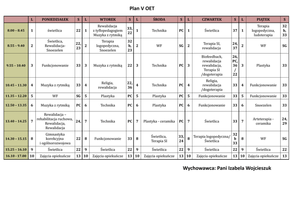Plan V OET Wychowawca: Pani Izabela Wojcieszuk
