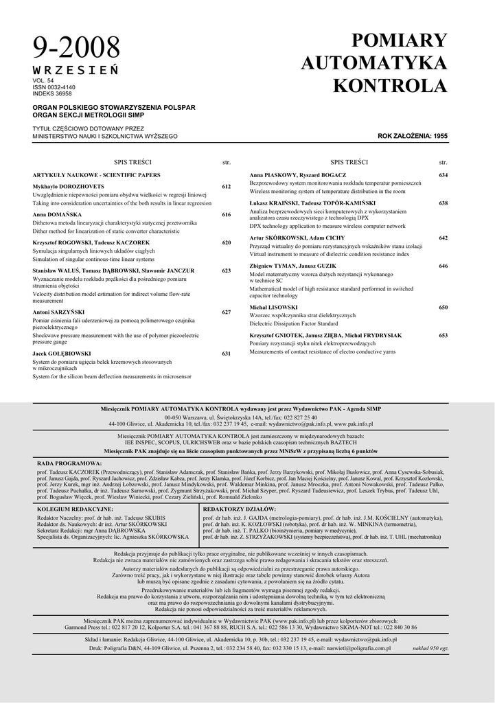 9-2 0 0 8 POMIARY AU T OMAT YK A K ON T ROL A WRZESI EŃ VOL. 54 I S S N 003 2 -41 40 I N D E K S 3 6 9 58 ORGAN POLSKIEGO STOWARZYSZENIA POLSPAR ORGAN SEKC J I M ETROLOGII SIM P T Y T U Ł C Z Ę Ś C I OW O D OT OW A N Y P R Z E Z M I N I S T E R S T W O N A U K I I S Z K OLN I C T W A W Y Ż S Z E G O ROK ZAŁ OŻ ENIA: 1 9 5 5 S P IS T R E Ś C I s tr. ARTYKUŁY NAUKOWE - S C I ENTI F I C P AP ERS M y k h a y l o D OROZ H OV ETS Uwzględnienie niepewności pomiaru obydwu wielkości w regresji liniowej T aking int o considerat ion uncert aint ies of t h e bot h result s in linear regreesion 6 1 2 An n a D OM AŃ S KA D it h erowa met oda linearyzacji ch arakt eryst yki st at ycznej przet wornika D it h er met h od f or linearizat ion of st at ic conv ert er ch aract erist ic 6 1 6 S t a n i s ł a w WAL UŚ , To m a s z D Ą B ROWS KI , S ł a w o m i r J ANC Z UR Wyznaczanie modelu rozkł adu prędkości dla pośredniego pomiaru st rumienia objęt ości V elocit y dist ribut ion model est imat ion f or indirect v olume f low-rat e measurement 6 2 3 Kr z y s z t o f ROG OWS KI , Ta d e u s z KAC Z OREK Symulacja singularnych liniowych ukł adó w cią gł ych Simulat ion of singular cont inous-t ime linear syst ems S P IS T R E Ś C I 6 2 0 An t o n i S ARZ YŃ S KI P omiar ciśnienia f ali uderzeniowej za pomocą polimerowego czujnika piezoelekt rycznego Sh ockwav e pressure measurement wit h t h e use of polymer piezoelect ric pressure gauge 6 2 7 J a c e k G OŁĘ B I OWS KI Syst em do pomiaru ugięcia belek krzemowych st osowanych w mikroczujnikach Syst em f or t h e silicon beam def lect ion measurement s in microsensor 6 3 1 s tr. An n a P I AS KOWY, Ry s z a r d B OG AC Z B ezprzewodowy syst em monit orowania rozkł adu t emperat ur pomieszczeń Wireless monit oring syst em of t emperat ure dist ribut ion in t h e room 6 3 4 Ar t u r S KÓ RKOWS KI , Ad a m C I C H Y P rzyrzą d wirt ualny do pomiaru rezyst ancyjnych wskaź nikó w st anu izolacji V irt ual inst rument t o measure of dielect ric condit ion resist ance index 6 4 2 M i c h a ł L I S OWS KI Wzorzec wspó ł czynnika st rat dielekt rycznych D ielect ric D issipat ion F act or St andard 6 5 0 Łu k a s z KRAI Ń S KI , Ta d e u s z TOP Ó R-KAM I Ń S KI A naliza bezprzewodowych sieci komput erowych z wykorzyst aniem analizat ora czasu rzeczywist ego z t ech nologią D P X D P X t ech nology applicat ion t o measure wireless comput er net work 6 3 8 Z b i g n i e w TYM AN, J a n u s z G UZ I K M odel mat emat yczny wzorca duż ych rezyst ancji wykonanego w t ech nice SC M at h emat ical model of h igh resist ance st andard perf ormed in swit ch ed capacit or t ech nology 6 4 6 Kr z y s z t o f G NI OTEK, J a n u s z Z I Ę B A, M i c h a ł F RYD RYS I AK P omiary rezyst ancji st yku nit ek elekt roprzewodzą cych M easurement s of cont act resist ance of elect ro conduct iv e yarns 6 5 3 M i e s i ę c z n i k P OM I ARY AUTOM ATYKA KONTROL A w y d a w a n y j e s t p r z e z Wy d a w n i c t w o P AK - Ag e n d a S I M P 0 0 -0 5 0 Warszawa, ul. Ś więt okrzyska 1 4 A , t el. / f ax : 0 2 2 8 2 7 2 5 4 0 4 4 -1 0 0 G liwice, ul. A kademicka 1 0 , t el. / f ax : 0 3 2 2 3 7 1 9 4 5 , e-mail: wydawnict wo@ pak. inf o. pl, www. pak. inf o. pl M iesięcznik P O M IA R Y A UT O M A T Y K A K O N T R O L A jest zamieszczony w międzynarodowych bazach : IE E IN SP E C , SC O P US, UL R IC H SWE B oraz w bazie polskich czasopism t ech nicznych B A Z T E C H RAD A P ROG RAM OWA: prof . prof . prof . prof . prof . M i e s i ę c z n i k P AK z n a j d u j e s i ę n a l i ś c i e c z a s o p i s m p u n k t o w a n y c h p r z e z M Ni S z W z p r z y p i s a n ą l i c z b ą 6 p u n k t ó w T adeusz K A C Z O R E K ( P rzewodniczą cy), prof . St anisł aw A damczak, prof . St anisł aw B ań ka, prof . J erzy B arzykowski, prof . M ikoł aj B usł owicz, prof . A nna C ysewska-Sobusiak, J anusz G ajda, prof . R yszard J ach owicz, prof . Z dzisł aw K abza, prof . J erzy K lamka, prof . J ó zef K orbicz, prof . J an M aciej K ościelny, prof . J anusz K owal, prof . K rzyszt of K ozł owski, J erzy K urek, mgr inż . A ndrzej Ł obzowski, prof . J anusz M indykowski, prof . Waldemar M inkina, prof . J anusz M roczka, prof . A nt oni N owakowski, prof . T adeusz P ał ko, T adeusz P uch ał ka, dr inż . T adeusz Sarnowski, prof . Z ygmunt St rzyż akowski, prof . M ich ał Szyper, prof . R yszard T adeusiewicz, prof . L eszek T rybus, prof . T adeusz Uh l, B ogusł aw Więcek, prof . Wiesł aw Winiecki, prof . C ezary Z ieliń ski, prof . R omuald Z ielonko KOL EG I UM RED AKC YJ NE: R edakt or N aczelny: prof . dr h ab. inż . T adeusz SK UB IS R edakt or ds. N aukowych : dr inż . A rt ur SK Ó R K O WSK I Sekret arz R edakcji: mgr A nna D Ą B R O WSK A Specjalist a ds. O rganizacyjnych : lic. A gnieszka SK Ó R K O WSK A RED AKTORZ Y D Z I AŁÓ W: prof . dr h ab. inż . J prof . dr h ab. inż . K prof . dr h ab. inż . T prof . dr h ab. inż . Z . . G . K . P ST A J O Z A Ł R Z D A Ł O K O Y Ż ( met rologia-pomiary), prof . dr h ab. inż . J . M . K O Ś C IE L N Y ( aut omat yka), WSK I ( robot yka), prof . dr h ab. inż . W. M IN K IN A ( t ermomet ria), ( bioinż ynieria, pomiary w medycynie), A K O WSK I ( syst emy bezpieczeń st wa), prof . dr h ab. inż . T . UH L ( mech at ronika) R edakcja przyjmuje do publikacji t ylko prace oryginalne, nie publikowane wcześniej w innych czasopismach . R edakcja nie zwraca mat eriał ó w nie zamó wionych oraz zast rzega sobie prawo redagowania i skracania t ekst ó w oraz st reszczeń . A ut orzy mat eriał ó w nadesł anych do publikacji są odpowiedzialni za przest rzeganie prawa aut orskiego. Z aró wno t reść pracy, jak i wykorzyst ane w niej ilust racje oraz t abele powinny st anowić dorobek wł asny A ut ora lub muszą być opisane zgodnie z zasadami cyt owania, z powoł aniem się na ź ró dł o cyt at u. P rzedrukowywanie mat eriał ó w lub ich f ra