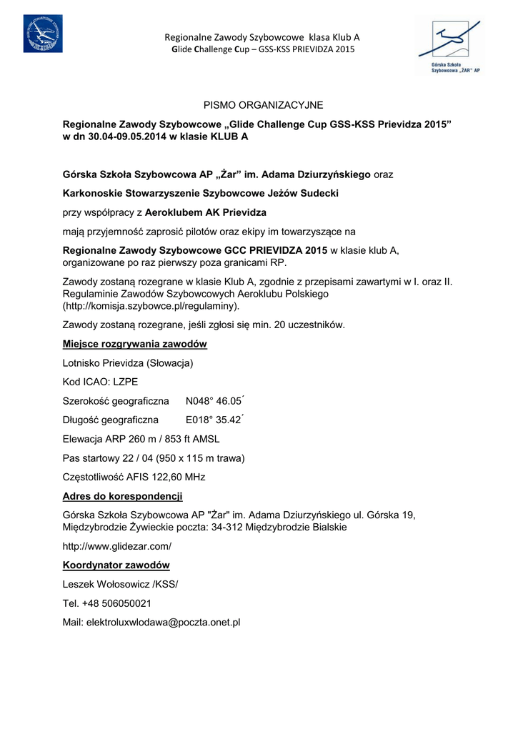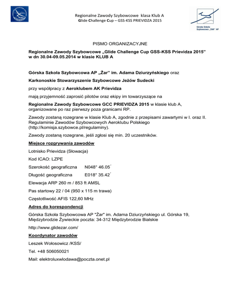 Regionalne Zawody Szybowcowe klasa Klub A Glide Challenge Cup – GSS-KSS PRIEVIDZA 2015 PISMO ORGANIZACYJNE Regionalne Zawody Szybowcowe „Glide Challenge Cup GSS-KSS Prievidza 2015” w dn 30.04-09.05.2014 w klasie KLUB A Górska Szkoła Szybowcowa AP „Żar” im. Adama Dziurzyńskiego oraz Karkonoskie Stowarzyszenie Szybowcowe Jeżów Sudecki przy współpracy z Aeroklubem AK Prievidza mają przyjemność zaprosić pilotów oraz ekipy im towarzyszące na Regionalne Zawody Szybowcowe GCC PRIEVIDZA 2015 w klasie klub A, organizowane po raz pierwszy poza granicami RP. Zawody zostaną rozegrane w klasie Klub A, zgodnie z przepisami zawartymi w I. oraz II. Regulaminie Zawodów Szybowcowych Aeroklubu Polskiego (http://komisja.szybowce.pl/regulaminy). Zawody zostaną rozegrane, jeśli zgłosi się min. 20 uczestników. Miejsce rozgrywania zawodów Lotnisko Prievidza (Słowacja) Kod ICAO: LZPE Szerokość geograficzna N048° 46.05 ́ Długość geograficzna E018° 35.42 ́ Elewacja ARP 260 m / 853 ft AMSL Pas startowy 22 / 04 (950 x 115 m trawa) Częstotliwość AFIS 122,60 MHz Adres do korespondencji Górska Szkoła Szybowcowa AP "Żar" im. Adama Dziurzyńskiego ul. Górska 19, Międzybrodzie Żywieckie poczta: 34-312 Międzybrodzie Bialskie http://www.glidezar.com/ Koordynator zawodów Leszek Wołosowicz /KSS/ Tel. +48 506050021 Mail: [email protected] Regionalne Zawody Szybowcowe klasa Klub A Glide Challenge Cup – GSS-KSS PRIEVIDZA 2015 Harmonogram imprezy Koniec zgłoszeń: 28 lutego 2015 lub po osiągnięciu maksymalnej liczby zawodników zakwalifikowanych zgodnie z limitem 50 szybowców oraz zasadami podanymi w niniejszym Piśmie Organizacyjnym. Obowiązkowy trening: 28-29 kwietnia 2015 Rejestracja zawodników: 29 kwietnia 2015 – godz. 17:00 – 22:00 Odprawa bezpieczeństwa: 29 kwietnia 2015 godz. 20:00 w hangarze Pierwsza odprawa otwierająca zawody: 30 kwietnia 2015 godz. 8:00 w hangarze Otwarcie zawodów: 30 kwietnia 2015 godz. 10:00 Czas trwania zawodów: 30 kwietnia – 9 maja 2015 Ogłoszenie wyników i wręczenie nagród: 9 maja 2015 Impreza pożegnalna: 9 maja 2015 godz 21:00 Dzień rezerwowy: 10 maja 2015 Kierownictwo zawodów Dyrektor zawodów: Przemysław Łośko - GSS Kierownik sportowy – będzie podane później Sędzia główny - będzie podane później Meteorolog - będzie podane później Kierownik lotów, AFIS - będzie podane później Komisja bezpieczeństwa - 3 członków – dyrektor zawodów, 2 zawodników Regulamin Lokalny Regulamin Lokalny będzie ogłoszony na stronie zawodów www.gcc2015.pl najpóźniej do dnia 30 stycznia 2015r. Rejestracja Piloci mogą zgłaszać swoje uczestnictwo poprzez użycie formularza rejestracyjnego na stronie zawodów http://gcc2015.pl/rejestracja/ . Rejestracja rozpocznie się do 7dni od zatwierdzenia Pisma Organizacyjnego przez Komisję Szybowcową AP. Kwalifikowanie do zawodów Kwalifikowanie do zawodów odbędzie się na następujących zasadach: a) 20 miejsc dla osób z najwyższym rankingiem IGC z opłaconym wpisowym, b) 20 miejsc dla osób według kolejności wpłacenia wpisowego, bez względu na ranking IGC, c) 10 miejsc w dyspozycji organizatorów tj. GSS i KSS. Regionalne Zawody Szybowcowe klasa Klub A Glide Challenge Cup – GSS-KSS PRIEVIDZA 2015 Dla zawodników nie zakwalifikowanych zostanie sporządzona lista rezerwowa według kolejności wpływu wpisowego. Liczba uczestników Maksymalna liczba uczestników - 50 szybowców. W razie wypełnienia limitu startujących, organizator zastrzega sobie prawo wyboru uczestników zawodów w oparciu o następujące warunki z zastrzeżeniem kryteriów wymienionych w części „Kwalifikowanie do zawodów”: Data wpływu opłaty wpisowej jest rozumiana jako data wpływu sumy określonej w części „Wpisowe oraz cennik” na rachunek organizatora. Wymagania formalne Pilot biorący udział w Regionalnych Zawodach Szybowcowych GCC 2015 winien spełnić warunki zgodnie z I. oraz II. Regulaminem Zawodów Szybowcowych Aeroklubu Polskiego, a w szczególności posiadać: ważną do końca zawodów licencję pilota szybowcowego, ważne do końca zawodów orzeczenie lotniczo-lekarskie, książkę pilota szybowcowego, Srebrną Odznakę Szybowcową FAI ważną do końca zawodow Licencję Sportową FAI, ważne do końca zawodow świadectwo radiooperatora Nalot dowódczy na szybowcach min. 150 godzin Przeleciane min. 3000 km Warunek dotyczący Srebrnej Odznaki Szybowcowej może być zmieniony do czasu zawodów przez komisję Szybowcową Aeroklubu Polskiego. Numery startowe Numery startowe winny być zgodne z p. 4.3 II. Regulaminu Zawodów Szybowcowych AP. W razie wystąpienia identycznych znaków rozpoznawczych, lub takich, które mogą być łatwo pomylone (np. „India,India” i „One,One”) zawodnicy będą proszeni o ich zmianę w ramach wzajemnego porozumienia. W razie niedostosowania się do tego wymagania, szybowce o znakach identycznych, lub łatwych do pomylenia nie będą dopuszczone do startu. Wymagania techniczne Zgodnie z p. 4 II. Regulaminu Zawodów Szybowcowych. Zalecamy posiadanie urządzeń antykolizyjnych FLARM Regionalne Zawody Szybowcowe klasa Klub A Glide Challenge Cup – GSS-KSS PRIEVIDZA 2015 Ubezpieczenie obowiązkowe -Ubezpieczenie OC szybowca -Ubezpieczenie kosztów leczenia za granicą, transportu do kraju oraz następstw nieszczęśliwych wypadków osób uczestniczących w kulturze fizycznej (np. „PZU SPORT”). Obszar zawodów oraz procedury Obszar zawodów i strefy będą przedmiotem ustaleń Aeroklubu Prievidza z władzami słowackimi i zostaną podane do wiadomości uczestnikom w momencie ich ustalenia, najpóźniej na spotkaniu informacyjnym w dn. 29 kwietnia 2015r. Celem organizatorów będzie zapewnienie obszaru z dostępem do przestrzeni powietrznych Słowacji, Polski, Czech i Węgier. Wysokości maksymalne oraz strefy będą podawane każdorazowo na odprawie przed konkurencją. Punkty zwrotne Punkty zwrotne w głównych formatach zostaną og