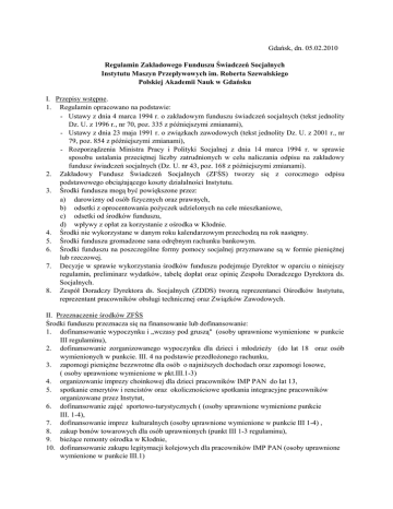 Gdańsk, dn. 05.02.2010 Regulamin Zakładowego Funduszu Świadczeń Socjalnych Instytutu Maszyn Przepływowych im. Roberta Szewalskiego Polskiej Akademii Nauk w Gdańsku I. Przepisy wstępne. 1. Regulamin opracowano na podstawie: - Ustawy z dnia 4 marca 1994 r. o zakładowym funduszu świadczeń socjalnych (tekst jednolity Dz. U. z 1996 r., nr 70, poz. 335 z późniejszymi zmianami), - Ustawy z dnia 23 maja 1991 r. o związkach zawodowych (tekst jednolity Dz. U. z 2001 r., nr 79, poz. 854 z późniejszymi zmianami), - Rozporządzenia Ministra Pracy i Polityki Socjalnej z dnia 14 marca 1994 r. w sprawie sposobu ustalania przeciętnej liczby zatrudnionych w celu naliczania odpisu na zakładowy fundusz świadczeń socjalnych (Dz. U. nr 43, poz. 168 z późniejszymi zmianami). 2. Zakładowy Fundusz Świadczeń Socjalnych (ZFŚS) tworzy się z corocznego odpisu podstawowego obciążającego koszty działalności Instytutu. 3. Środki funduszu mogą być powiększone przez: a) darowizny od osób fizycznych oraz prawnych, b) odsetki z oprocentowania pożyczek udzielonych na cele mieszkaniowe, c) odsetki od środków funduszu, d) wpływy z opłat za korzystanie z ośrodka w Kłodnie. 4. Środki nie wykorzystane w danym roku kalendarzowym przechodzą na rok następny. 5. Środki funduszu gromadzone sana odrębnym rachunku bankowym. 6. Środki funduszu na poszczególne formy pomocy socjalnej przyznawane są w formie pieniężnej lub rzeczowej. 7. Decyzje w sprawie wykorzystania środków funduszu podejmuje Dyrektor w oparciu o niniejszy regulamin, preliminarz wydatków, tabelę dopłat oraz opinię Zespołu Doradczego Dyrektora ds. Socjalnych. 8. Zespół Doradczy Dyrektora ds. Socjalnych (ZDDS) tworzą reprezentanci Ośrodków Instytutu, reprezentant pracowników obsługi technicznej oraz Związków Zawodowych. II. Przeznaczenie środków ZFŚS Środki funduszu przeznacza się na finansowanie lub dofinansowanie: 1. dofinansowanie wypoczynku i „wczasy pod gruszą" (osoby uprawnione wymienione w punkcie III regulaminu), 2. dofinansowanie zorganizowanego wypoczynku dla dzieci i młodzieży (do lat 18 oraz osób wymienionych w punkcie. III. 4 na podstawie przedłożonego rachunku, 3. zapomogi pieniężne bezzwrotne dla osób o najniższych dochodach oraz zapomogi losowe, ( osoby uprawnione wymienione w pkt.III.1-3) 4. organizowanie imprezy choinkowej dla dzieci pracowników IMP PAN do lat 13, 5. spotkanie emerytów i rencistów oraz okolicznościowe spotkania integracyjne pracowników organizowane przez Instytut, 6. dofinansowanie zajęć sportowo-turystycznych ( (osoby uprawnione wymienione punkcie III. 1-4), 7. dofinansowanie imprez kulturalnych (osoby uprawnione wymienione w punkcie III 1-4) , 8. zakup bonów towarowych dla osób uprawnionych (punkt III 1-3 regulaminu), 9. bieżące remonty ośrodka w Kłodnie, 10. dofinansowanie zakupu legitymacji kolejowych dla pracowników IMP PAN (osoby uprawnione wymienione w punkcie III.1) 11. dofinansowanie zakupu okresowych biletów komunikacji miejskiej na dojazdy do pracy ( osoby uprawnione wymienione w pkt.III.1) 12. pożyczki zwrotne na cele mieszkaniowe. Wydatki z poz. 1 - 1 1 pokrywane są z części socjalnej funduszu (ZFS), zaś poz. 12 z części mieszkaniowej funduszu (ZFM). Podział określa coroczny preliminarz. III. Osoby uprawnione do korzystania z ZFSS Osobami uprawnionymi do korzystania ze środków funduszu są: 1. pracownicy Instytutu, 2. pracownicy przebywający na urlopach wychowawczych, 3. emeryci i renciści, dla których Instytut jest ostatnim miejscem pracy, 4. członkowie rodzin osób wymienionych w punktach 1 - 3 . Za członków rodzin, o których mowa w punkcie 4, uważa się: a) dzieci własne, dzieci przysposobione oraz przyjęte na wychowanie w ramach rodziny zastępczej i dzieci współmałżonka, o ile nie ukończyły 18 lat, a jeżeli kształcą się w szkole - do czasu ukończenia nauki, nie dłużej niż do ukończenia 25 lat, b) osoby wymienione w punkcie (a), będące inwalidami I i II grupy bez względu na wiek, c) żony pozostające na wyłącznym utrzymaniu pracowników, d) inne osoby, którym Instytut przyzna prawo do korzystania z ZFŚS. IV. Zasady i warunki przyznawania świadczeń socjalnych 1. Corocznie Dział Ekonomiczno-Organizacyjny opracowuje: a) sprawozdanie finansowe ZFSS za rok ubiegły, zgodnie z Załącznikiem nr 3. b) preliminarz wydatków z ZFŚS w roku bieżącym, Załącznik nr 4. 2. Preliminarz wydatków oraz Tabela dopłat (Załącznik nr 1) uzgadniany jest corocznie z ZDDS przy udziale Związków Zawodowych. Związki Zawodowe opiniują, sprawozdanie finansowe ZFSS za rok ubiegły oraz preliminarz w terminie dwóch tygodni od jego przedłożenia. 3. Przyznanie i wysokość świadczenia ze środków ZFSS zależy od sytuacji życiowej, rodzinnej i materialnej uprawnionego. 3.1. Miernikiem sytuacji materialnej są dane z oświadczenia o dochodach (patrz pkt.V.l oraz Załącznik nr 2). 3.2. O sytuacji życiowej i rodzinnej decyduje odpowiednie pisemne oświadczenie osoby uprawnionej, weryfikowane przez Dział Ekonomiczno-Organizacyjny przy współudziale ZDDS. 3.3. Dofinansowanie zakupu biletów komunikacji miejskiej na dojazdy do pracy będzie możliwe na podstawie oświadczenia o poniesionych kosztach rocznych...Termin składanie oświadczeń ustala się na dzień 30.11. każdego roku. 3.4. Osoby wykorzystujące legitymacje kolejowe do celów prywatnych (dojazdy do pracy, wyjazdy na urlop) dokonują wpłaty własnej w wysokości 1/3, ½ ,lub 2/3 kosztów legitymacji oraz występują o dofinansowanie z ZFŚS w wysokości 2/3, ½ , lub 1/3 kosztów stosownie do osiąganych dochodów. 3.5. Łączna kwota dofinansowania na imprezy kulturalne i sportowe wynosi 380,- zł. na pracownika. V. Zasady korzystania z części socjalnej funduszu (ZFS) 1. Osoby uprawnione (dotyczy pkt. III 1 -3), pragnące korzystać z ZFS, składają oświadczenie o wysokości dochodów przypadających w roku ubiegłym na jedne