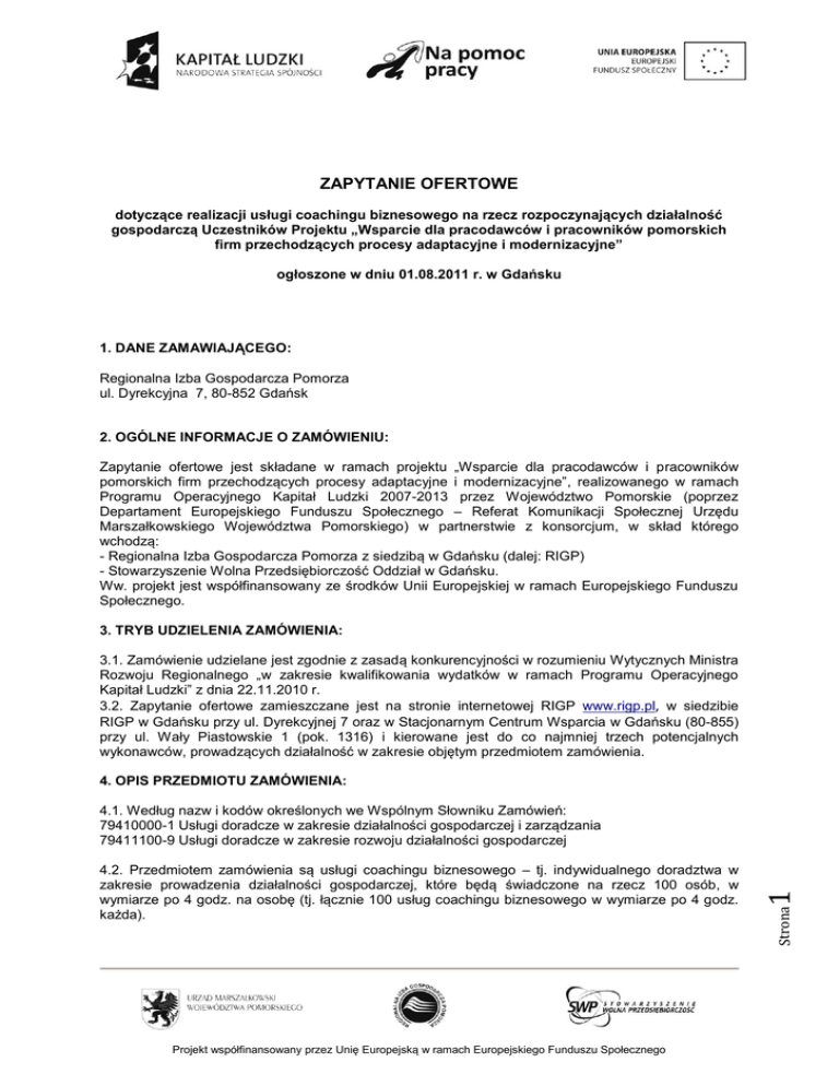 ZAPYTANIE OFERTOWE dotyczące realizacji usługi coachingu biznesowego na rzecz rozpoczynających działalność gospodarczą Uczestników Projektu „Wsparcie dla pracodawców i pracowników pomorskich firm przechodzących procesy adaptacyjne i modernizacyjne” ogłoszone w dniu 01.08.2011 r. w Gdańsku 1. DANE ZAMAWIAJĄCEGO: Regionalna Izba Gospodarcza Pomorza ul. Dyrekcyjna 7, 80-852 Gdańsk 2. OGÓLNE INFORMACJE O ZAMÓWIENIU: Zapytanie ofertowe jest składane w ramach projektu „Wsparcie dla pracodawców i pracowników pomorskich firm przechodzących procesy adaptacyjne i modernizacyjne”, realizowanego w ramach Programu Operacyjnego Kapitał Ludzki 2007-2013 przez Województwo Pomorskie (poprzez Departament Europejskiego Funduszu Społecznego – Referat Komunikacji Społecznej Urzędu Marszałkowskiego Województwa Pomorskiego) w partnerstwie z konsorcjum, w skład którego wchodzą: - Regionalna Izba Gospodarcza Pomorza z siedzibą w Gdańsku (dalej: RIGP) - Stowarzyszenie Wolna Przedsiębiorczość Oddział w Gdańsku. Ww. projekt jest współfinansowany ze środków Unii Europejskiej w ramach Europejskiego Funduszu Społecznego. 3. TRYB UDZIELENIA ZAMÓWIENIA: 3.1. Zamówienie udzielane jest zgodnie z zasadą konkurencyjności w rozumieniu Wytycznych Ministra Rozwoju Regionalnego „w zakresie kwalifikowania wydatków w ramach Programu Operacyjnego Kapitał Ludzki” z dnia 22.11.2010 r. 3.2. Zapytanie ofertowe zamieszczane jest na stronie internetowej RIGP www.rigp.pl, w siedzibie RIGP w Gdańsku przy ul. Dyrekcyjnej 7 oraz w Stacjonarnym Centrum Wsparcia w Gdańsku (80-855) przy ul. Wały Piastowskie 1 (pok. 1316) i kierowane jest do co najmniej trzech potencjalnych wykonawców, prowadzących działalność w zakresie objętym przedmiotem zamówienia. 4. OPIS PRZEDMIOTU ZAMÓWIENIA: Projekt współfinansowany przez Unię Europejską w ramach Europejskiego Funduszu Społecznego Strona 4.2. Przedmiotem zamówienia są usługi coachingu biznesowego – tj. indywidualnego doradztwa w zakresie prowadzenia działalności gospodarczej, które będą świadczone na rzecz 100 osób, w wymiarze po 4 godz. na osobę (tj. łącznie 100 usług coachingu biznesowego w wymiarze po 4 godz. każda). 1 4.1. Według nazw i kodów określonych we Wspólnym Słowniku Zamówień: 79410000-1 Usługi doradcze w zakresie działalności gospodarczej i zarządzania 79411100-9 Usługi doradcze w zakresie rozwoju działalności gospodarczej Zamawiający planuje zawarcie umów na wykonanie przedmiotu zamówienia z co najmniej 5 (pięcioma Wykonawcami), którzy złożą najkorzystniejsze oferty, przy czym przedmiotem umowy z jednym Wykonawcą będzie realizacja przez niego do 20 usług będących przedmiotem niniejszego zapytania. Usługi będą świadczone na rzecz osób (Uczestników Projektu), które w ramach Projektu „wsparcie dla pracodawców i pracowników pomorskich firm przechodzących procesy adaptacyjne i modernizacyjne” uruchomiły działalność gospodarczą i zawarły z Zamawiającym umowę o udzieleniu wsparcia Uczestnikowi Projektu rozpoczynającemu działalność gospodarczą. Celem przedmiotowego coachingu/doradztwa powinno być wsparcie w rozwiązaniu i/lub przedstawienie propozycji rozwiązania konkretnych problemów związanych z uruchomieniem i prowadzeniem działalności gospodarczej, w tym również w zakresie efektywnego wykorzystania dotacji otrzymanej w ramach ww. Projektu, zaś jego efektem powinno być opracowanie i/lub wdrożenie określonych usprawnień i działań w obszarze objętym usługą doradztwa. 1 usługa na rzecz 1 Uczestnika będzie obejmować co najmniej 2 spotkania Wykonawcy z Uczestnikiem Projektu (w wypadku dwóch spotkań każde spotkanie będzie trwało 2 godziny). Usługi doradcze będą realizowane na terenie województwa pomorskiego, przynajmniej raz w siedzibie Uczestnika Projektu lub w miejscu prowadzenia przez niego działalności gospodarczej. W pozostałych wypadkach w siedzibie prowadzonego przez Zamawiającego Stacjonarnego Centrum Wsparcia (Gdańsk, ul. Wały Piastowskie 1 pok.1316) lub w lokalu zapewnionym przez Wykonawcę. Wykonawca powinien realizować usługę coachingu biznesowego w terminach dogodnych dla Uczestnika Projektu. Dowodem potwierdzającym zrealizowanie usługi będzie „Karta coachingu biznesowego” podpisana przez Wykonawcę oraz Uczestnika Projektu, zawierająca m.in.: a) dane identyfikujące Uczestnika Projektu b) opis udzielonego wsparcia – cel, przedmiot i efekt doradztwa, c) miejsce, termin/terminy i czas trwania doradztwa. Wzór dokumentu zostanie przekazany Wykonawcy w terminie do 5 dni roboczych od daty podpisania umowy na realizację przedmiotu zamówienia. 5. TERMIN WYKONANIA ZAMÓWIENIA: Ostateczny termin wykonania zamówienia przez Wykonawcę to: 17.12.2011 6. OPIS WARUNKÓW UDZIAŁU W POSTĘPOWANIU ORAZ OPIS SPOSOBU DOKONYWANIA OCENY SPEŁNIANIA TYCH WARUNKÓW: O udzielenie zamówienia mogą ubiegać się Wykonawcy, którzy posiadają: a. udokumentowane doświadczenie w prowadzeniu działalności gospodarczej przez co najmniej 2 lata b. kwalifikacje trenera; konsultanta/coacha c. min.3.-letnie doświadczenie w udzielaniu doradztwa/konsultacji/coachingu dla osób prowadzących lub planujących prowadzić działalność gospodarczą. Projekt współfinansowany przez Unię Europejską w ramach Europejskiego Funduszu Społecznego Strona W celu wykazania spełnienia warunków udziału w postępowaniu każdy z wykonawców powinien przedstawić wraz z ofertą następujące dokumenty: a. zaświadczenie z ewidencji działalności gospodarczej potwierdzające prowadzenie działalności gospodarczej przez co najmniej 2 lata, b. dokument (świadectwo) potwierdzający posiadanie kwalifikacji trenera/coacha, konsultanta w zakresie przedsiębiorczości, c. wykaz szkoleń/warsztatów/doradztwa w zakresie prowadzenia działalności gospodarczej przeprowadzonych w okresie 4 lat poprzedzających termin składania ofert – s