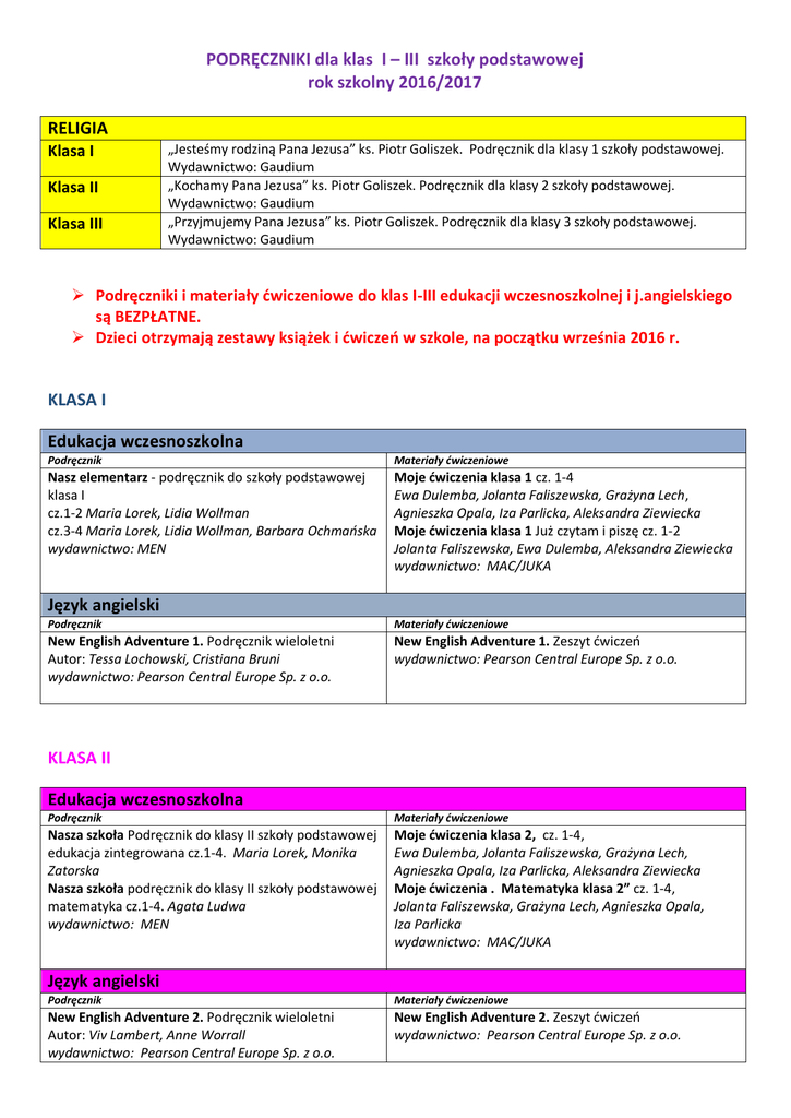 PODRĘCZNIKI dla klas I – III szkoły podstawowej rok szkolny 2016/2017 RELIGIA Klasa I Klasa II Klasa III „Jesteśmy rodziną Pana Jezusa” ks. Piotr Goliszek. Podręcznik dla klasy 1 szkoły podstawowej. Wydawnictwo: Gaudium „Kochamy Pana Jezusa” ks. Piotr Goliszek. Podręcznik dla klasy 2 szkoły podstawowej. Wydawnictwo: Gaudium „Przyjmujemy Pana Jezusa” ks. Piotr Goliszek. Podręcznik dla klasy 3 szkoły podstawowej. Wydawnictwo: Gaudium Podręczniki i materiały ćwiczeniowe do klas I-III edukacji wczesnoszkolnej i j.angielskiego są BEZPŁATNE. Dzieci otrzymają zestawy książek i ćwiczeń w szkole, na początku września 2016 r. KLASA I Edukacja wczesnoszkolna Podręcznik Materiały ćwiczeniowe Nasz elementarz - podręcznik do szkoły podstawowej klasa I cz.1-2 Maria Lorek, Lidia Wollman cz.3-4 Maria Lorek, Lidia Wollman, Barbara Ochmańska wydawnictwo: MEN Moje ćwiczenia klasa 1 cz. 1-4 Ewa Dulemba, Jolanta Faliszewska, Grażyna Lech, Agnieszka Opala, Iza Parlicka, Aleksandra Ziewiecka Moje ćwiczenia klasa 1 Już czytam i piszę cz. 1-2 Jolanta Faliszewska, Ewa Dulemba, Aleksandra Ziewiecka wydawnictwo: MAC/JUKA Język angielski Podręcznik Materiały ćwiczeniowe New English Adventure 1. Podręcznik wieloletni Autor: Tessa Lochowski, Cristiana Bruni wydawnictwo: Pearson Central Europe Sp. z o.o. New English Adventure 1. Zeszyt ćwiczeń wydawnictwo: Pearson Central Europe Sp. z o.o. KLASA II Edukacja wczesnoszkolna Podręcznik Materiały ćwiczeniowe Nasza szkoła Podręcznik do klasy II szkoły podstawowej edukacja zintegrowana cz.1-4. Maria Lorek, Monika Zatorska Nasza szkoła podręcznik do klasy II szkoły podstawowej matematyka cz.1-4. Agata Ludwa wydawnictwo: MEN Moje ćwiczenia klasa 2, cz. 1-4, Ewa Dulemba, Jolanta Faliszewska, Grażyna Lech, Agnieszka Opala, Iza Parlicka, Aleksandra Ziewiecka Moje ćwiczenia . Matematyka klasa 2” cz. 1-4, Jolanta Faliszewska, Grażyna Lech, Agnieszka Opala, Iza Parlicka wydawnictwo: MAC/JUKA Język angielski Podręcznik Materiały ćwiczeniowe New English Adventure 2. Podręcznik wieloletni Autor: Viv Lambert, Anne Worrall wydawnictwo: Pearson Central Europe Sp. z o.o. New English Adventure 2. Zeszyt ćwiczeń wydawnictwo: Pearson Central Europe Sp. z o.o. KLASA III Edukacja wczesnoszkolna Podręcznik Materiały ćwiczeniowe Nasza szkoła. Podręcznik do szkoły podstawowej klasa 3, część 1a,1b, 2 Maria Lorek, Monika Zatorska Nasza szkoła Matematyka. Podręcznik do szkoły podstawowej klasa 3, część 1-2 Agata Ludwa, współpraca Maria Lorek wydawnictwo: MEN Ćwiczenia z pomysłem. Klasa 3. Część 1-4. Jolanta Filipowicz, Katarzyna Harmak, Kamila Izbińska, Ewa Kłos, Wawrzyniec Kofta Ćwiczenia z pomysłem. Matematyka. Klasa 3. Część 1-4. Jadwiga Hanisz, Jolanta Brzózka, Anna Jasiocha, Aniela Chankowska wydawnictwo: WSiP Język angielski Podręcznik Materiały ćwiczeniowe New English Adventure 3. Podręcznik wieloletni Autor: Tessa Lochowski, Anne Worall wydawnictwo: Pearson Central Europe Sp. z o.o. New English Adventure 3. Materiał ćwiczeniowy . Autor: Tessa Lachowski, Anne Worrall wydawnictwo: Pearson Central Europe Sp. z o.o.