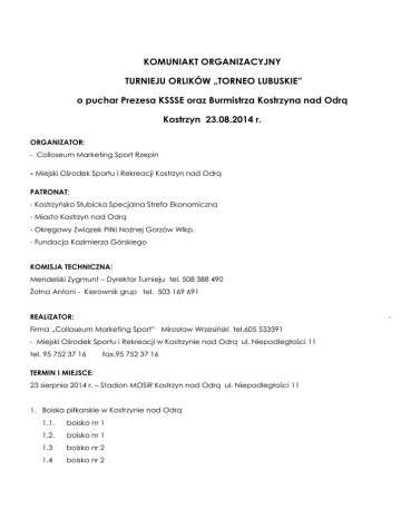 KOMUNIAKT ORGANIZACYJNY TURNIEJU ORLIKÓW „TORNEO LUBUSKIE” o puchar Prezesa KSSSE oraz Burmistrza Kostrzyna nad Odrą Kostrzyn 23.08.2014 r. ORGANIZATOR: - Colloseum Marketing Sport Rzepin - Miejski Ośrodek Sportu i Rekreacji Kostrzyn nad Odrą PATRONAT: - Kostrzyńsko Słubicka Specjalna Strefa Ekonomiczna - Miasto Kostrzyn nad Odrą - Okręgowy Związek Piłki Nożnej Gorzów Wlkp. - Fundacja Kazimierza Górskiego KOMISJA TECHNICZNA: Mendelski Zygmunt – Dyrektor Turnieju tel. 508 388 490 Żołna Antoni - Kierownik grup tel. 503 169 691 REALIZATOR: - Firma „Colloseum Marketing Sport” Mirosław Wrzesiński tel.605 533391 - Miejski Ośrodek Sportu i Rekreacji w Kostrzynie nad Odrą ul, Niepodległości 11 tel. 95 752 37 16 fax.95 752 37 16 TERMIN I MIEJSCE: 23 sierpnia 2014 r. – Stadion MOSiR Kostrzyn nad Odrą ul. Niepodległości 11 1. Boiska piłkarskie w Kostrzynie nad Odrą 1.1. boisko nr 1 1.2. boisko nr 1 1.3 boisko nr 2 1.4 boisko nr 2 WYŻYWIENIE: Dla zawodników i kadry trenerskiej przewidziane wyżywienie – dwa posiłki zupa grochówka oraz kiełbaska z grilla. Dla kibiców i rodziców przewidziano stanowiska gastronomiczne WPISOWE: Wpisowe od drużyny w kwocie 200 zł płatne przelewem na podstawie wystawionej faktury VAT w terminie poprzedzającym termin turnieju ODPRAWA TECHNICZNA: Odprawy techniczne o godzinie 9.30 na stadionie miejskim w Kostrzynie nad Odrą. UCZESTNICY: DRUZYNY UCZESTNICZĄCE W TURNIEJU „TORNEO LUBUSKIE” 2014 GRUPA „A” BOISKO NR 1 GRUPA „B” BOISKO NR 2 A1 ZORZA KOWALÓW B1 ŁUCZNIK STRZELCE KRAJEŃSKIE A2 BARLINECKA AKADEMIA FUTBOLU B2 POLONIA SŁUBICE A3 ODRA GÓRZYCA B3 PROGRES 2005 GORZÓW WLKP. A 4 ILANKA STEINPOL RZEPIN B4 SANTOS ŚWIEBODZIN GRUPA „C” BOISKO NR 3 GRUPA „D” BOISKO NR 4 C1 PROGRES 2004 GORZÓW WLKP. D1 SPÓJNIA OŚNO LUBUSKIE C2 ABC FUTBOLU DĘBNO D2 UKS LIPIANY C3 PERŁA CYBINKA D3 ZJEDNOCZENI PRZYTOCZNA C 4 ORZEŁ MIĘDZYRZECZ D4 STILON GORZÓW PROGRAM TURNIEJU: 23.08.2014 08.30 – 09.15 09.30 – 10.00 10 .00 –10.30 10.30 - 13.00 13.00 - 14.00 14.30 - 16.30 16.30 – 17.00 17.00 – 18.00 18.00 Sobota Przyjazd ekip Odprawa techniczna Oficjalne otwarcie turnieju Mecze eliminacyjne w grupach Posiłek dla zawodników i kadry trenerskiej Mecze finałowe w grupach Oficjalne zakończenie turnieju Grill dla zawodników i kadry trenerskiej oraz sponsorów i zaproszonych gości Wyjazd ekip ZASADY: Rozgrywki w roku 2014 odbywają się zgodnie z Regulaminem Turnieju oraz zgodnie przepisami gry w piłkę nożną Polskiego Związku Piłki Nożnej NAGRODY Puchary dla wszystkich drużyn uczestniczących w turnieju w tym za: I miejsce - Puchar Prezesa KSSSE II miejsce – Puchar Burmistrza Kostrzyna nad Odrą III miejsce - Puchar Dyrektora MOSiR Kostrzyn nad Odrą IV miejsce – Puchar Prezesa OZPN Gorzów Wlkp. Medale dla zespołów z miejsc I – III Nagrody rzeczowe dla zespołów z miejsc I – VIII w tym I miejsce – nagroda Prezesa KSSSE II miejsce - nagroda Burmistrza Kostrzyna nad Odrą III miejsce – nagroda Prezesa OZPN Gorzów IV miejsce – nagroda Dyrektora MOSiR Kostrzyn nad Odrą V-VIII miejsce – nagrody sponsorów Statuetki i nagrody indywidualne dla najlepszego zawodnika, bramkarza i króla strzelców – nagrody sponsorów DYREKTOR TURNIEJU Zygmunt Mendelski