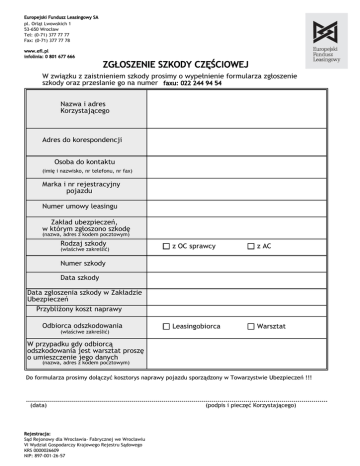 Europejski Fundusz Leasingowy SA pl. Orląt Lwowskich 1 53-650 Wrocław Tel: (0-71) 377 77 77 Fax: (0-71) 377 77 78 www.efl.pl infolinia: 0 801 677 666 ZGŁOSZENIE SZKODY CZĘŚCIOWEJ W związku z zaistnieniem szkody prosimy o wypełnienie formularza zgłoszenie szkody oraz przesłanie go na numer faxu: 022 244 94 54 Nazwa i adres Korzystającego Adres do korespondencji Osoba do kontaktu (imię i nazwisko, nr telefonu, nr fax) Marka i nr rejestracyjny pojazdu Numer umowy leasingu Zakład ubezpieczeń, w którym zgłoszono szkodę (nazwa, adres z kodem pocztowym) Rodzaj szkody (właściwe zakreślić) z OC sprawcy z AC Leasingobiorca Warsztat Numer szkody Data szkody Data zgłoszenia szkody w Zakładzie Ubezpieczeń Przybliżony koszt naprawy Odbiorca odszkodowania (właściwe zakreślić) W przypadku gdy odbiorcą odszkodowania jest warsztat proszę o umieszczenie jego danych (nazwa, adres z kodem pocztowym) Do formularza prosimy dołączyć kosztorys naprawy pojazdu sporządzony w Towarzystwie Ubezpieczeń !!! ....................................................................................................................................................... (data) Rejestracja: Sąd Rejonowy dla Wrocławia- Fabrycznej we Wrocławiu VI Wydział Gospodarczy Krajowego Rejestru Sądowego KRS 0000026609 NIP: 897-001-26-57 (podpis i pieczęć Korzystającego) Europejski Fundusz Leasingowy SA pl. Orląt Lwowskich 1 53-650 Wrocław Tel: (0-71) 377 77 77 Fax: (0-71) 377 77 78 www.efl.pl infolinia: 0 801 677 666 ZASADY LIKWIDACJI SZKÓD CZĘŚCIOWYCH: 1. Szkodę należy zgłosić niezwłocznie do zakładu ubezpieczeń: • zgodnie z warunkami ubezpieczenia, (w przypadku PZU S.A. w ciągu 7 dni) do najbliższej jednostki terenowej zakładu ubezpieczeń, w którym przedmiot leasingu jest ubezpieczony. 2. Do naprawy należy przystąpić po dokonaniu oględzin przez rzeczoznawcę z zakładu ubezpieczeń. Nie przedstawienie pojazdu do oględzin skutkuje odmową wypłaty odszkodowania. 3. ODBIÓR odszkodowania jest możliwy po przedstawieniu w zakładzie ubezpieczeń tylko i wyłącznie FAKTUR za dokonaną naprawę. 4. W celu otrzymania zgody od Finansującego do odbioru odszkodowania należy wypełnić formularz „Zgłoszenie szkody częściowej”. 5. W przypadku szkód powyżej 2.000 zł powstaje obowiązek przeprowadzenia aktualnego badania technicznego 6. W przypadku wpływu odszkodowania na konto Europejskiego Funduszu Leasingowego S.A. (np. z uwagi na nieterminową likwidację szkody) zwrot odszkodowania nastąpi po przesłaniu przez Korzystającego kopii faktury potwierdzającej poniesione koszty naprawy. Obowiązek przeprowadzenia badania dot. szkód likwidowanych z OC sprawcy i polis AUTOCASCO powstałych od 01-01-2004r. Rejestracja: Sąd Rejonowy dla Wrocławia- Fabrycznej we Wrocławiu VI Wydział Gospodarczy Krajowego Rejestru Sądowego KRS 0000026609 NIP: 897-001-26-57