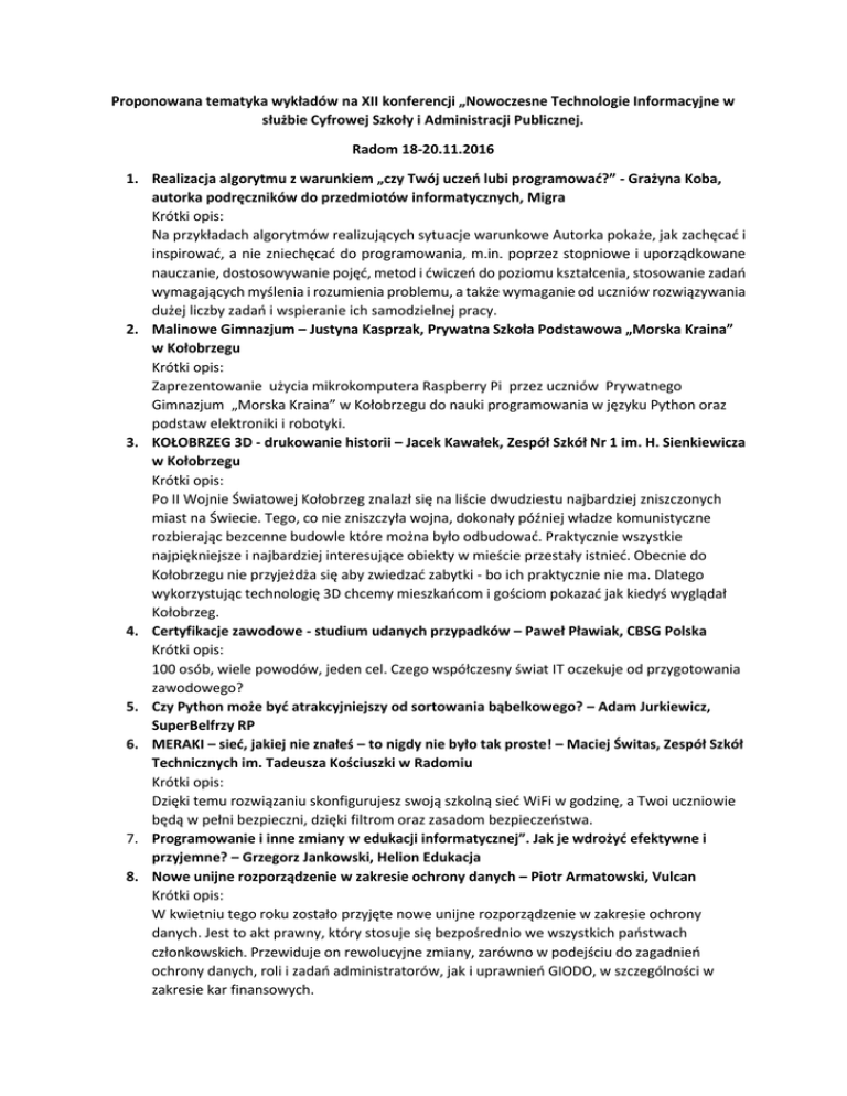 Proponowana tematyka wykładów na XII konferencji „Nowoczesne Technologie Informacyjne w służbie Cyfrowej Szkoły i Administracji Publicznej. Radom 18-20.11.2016 1. Realizacja algorytmu z warunkiem „czy Twój uczeń lubi programować?” - Grażyna Koba, autorka podręczników do przedmiotów informatycznych, Migra Krótki opis: Na przykładach algorytmów realizujących sytuacje warunkowe Autorka pokaże, jak zachęcać i inspirować, a nie zniechęcać do programowania, m.in. poprzez stopniowe i uporządkowane nauczanie, dostosowywanie pojęć, metod i ćwiczeń do poziomu kształcenia, stosowanie zadań wymagających myślenia i rozumienia problemu, a także wymaganie od uczniów rozwiązywania dużej liczby zadań i wspieranie ich samodzielnej pracy. 2. Malinowe Gimnazjum – Justyna Kasprzak, Prywatna Szkoła Podstawowa „Morska Kraina” w Kołobrzegu Krótki opis: Zaprezentowanie użycia mikrokomputera Raspberry Pi przez uczniów Prywatnego Gimnazjum „Morska Kraina” w Kołobrzegu do nauki programowania w języku Python oraz podstaw elektroniki i robotyki. 3. KOŁOBRZEG 3D - drukowanie historii – Jacek Kawałek, Zespół Szkół Nr 1 im. H. Sienkiewicza w Kołobrzegu Krótki opis: Po II Wojnie Światowej Kołobrzeg znalazł się na liście dwudziestu najbardziej zniszczonych miast na Świecie. Tego, co nie zniszczyła wojna, dokonały później władze komunistyczne rozbierając bezcenne budowle które można było odbudować. Praktycznie wszystkie najpiękniejsze i najbardziej interesujące obiekty w mieście przestały istnieć. Obecnie do Kołobrzegu nie przyjeżdża się aby zwiedzać zabytki - bo ich praktycznie nie ma. Dlatego wykorzystując technologię 3D chcemy mieszkańcom i gościom pokazać jak kiedyś wyglądał Kołobrzeg. 4. Certyfikacje zawodowe - studium udanych przypadków – Paweł Pławiak, CBSG Polska Krótki opis: 100 osób, wiele powodów, jeden cel. Czego współczesny świat IT oczekuje od przygotowania zawodowego? 5. Czy Python może być atrakcyjniejszy od sortowania bąbelkowego? – Adam Jurkiewicz, SuperBelfrzy RP 6. MERAKI – sieć, jakiej nie znałeś – to nigdy nie było tak proste! – Maciej Świtas, Zespół Szkół Technicznych im. Tadeusza Kościuszki w Radomiu Krótki opis: Dzięki temu rozwiązaniu skonfigurujesz swoją szkolną sieć WiFi w godzinę, a Twoi uczniowie będą w pełni bezpieczni, dzięki filtrom oraz zasadom bezpieczeństwa. 7. Programowanie i inne zmiany w edukacji informatycznej”. Jak je wdrożyć efektywne i przyjemne? – Grzegorz Jankowski, Helion Edukacja 8. Nowe unijne rozporządzenie w zakresie ochrony danych – Piotr Armatowski, Vulcan Krótki opis: W kwietniu tego roku zostało przyjęte nowe unijne rozporządzenie w zakresie ochrony danych. Jest to akt prawny, który stosuje się bezpośrednio we wszystkich państwach członkowskich. Przewiduje on rewolucyjne zmiany, zarówno w podejściu do zagadnień ochrony danych, roli i zadań administratorów, jak i uprawnień GIODO, w szczególności w zakresie kar finansowych. 9. 10. 11. 12. 13. 14. 15. Okres przygotowania się na wejście w życie tego rozporządzenia zbiega się z dużymi zmianami w systemie oświaty w Polsce, co stanowi dodatkowe wyzwanie dla dyrektorów szkół. W trakcie tego wystąpienia uczestnicy w zwięzłej formie otrzymają informacje o kluczowych zmianach wprowadzanych nowymi przepisami oraz wskazówki kiedy i w jaki sposób się do nich przygotować. Bezprzewodowa tablica interaktywna z użyciem tabletu WACOM – Mariusz Utkowski, Łukasz Gierek, Wacom Krótki opis: Tablet WACOM jako narzędzie wspomagające zajęcia ogólnokształcące na przykładzie języka angielskiego. Szkolna sieć Wi-Fi – zastosowanie, korzyści, koszty – Robert Gawroński, TP-LINK Krótki opis: Podczas prelekcji przedstawimy jak powinna wyglądać sieć spełniająca wymogi nowoczesnej szkoły: wydajna – by obsłużyć wszystkie pomoce dydaktyczne, zarówno te wykorzystywane przez nauczycieli jak i przez uczniów; bezpieczna – by zagwarantować, że wrażliwe dane przesyłane przez administrację szkoły i nauczycieli nie dostaną się w niepowołane ręce; prostą w konfiguracji i zarządzaniu – by ograniczyć uczniom dostęp do treści odwracających uwagę. Zaprezentujemy przykładową konfigurację dla małej, średniej i dużej szkoły wraz z przykładowym kosztorysem. Omówimy też możliwości finansowania ze środków UE. Otwarte lekcje – Barbara Halska – Zespół Szkół nr 6 im. Króla Jana III Sobieskiego w Jastrzębiu-Zdroju, SuperBelfrzy RP Krótki opis: Celem tego wystąpienie jest wykorzystanie otwartych zasobów na przykładzie projektu realizowanego przez polskich nauczycieli na platformie iTunesU. Budowanie świadomości użytkowników systemu zarządzania bezpieczeństwem informacji – Michał Grześlak – Administrator Systemów Informatycznych Ośrodek Edukacji Komputerowej i Zastosowań Komputerów w Warszawie Szkolne laboratorium w tornistrze – Barbara Stasiak, Agraf Krótki opis: Biologia, Przyroda, Chemia czy Fizyka to przedmioty obrazujące otaczający nas świat. To środowisko, które uczniowie poznają od pierwszych klas, a nawet od przedszkola. Jak przybliżyć uczniom zjawiska, które trudno „dotknąć”, a jeszcze trudniej zrozumieć? Jak przeprowadzić doświadczenie, zarejestrować pomiary, omówić wyniki, a jednocześnie zdążyć zrobić to na jednej lekcji? Jest takie laboratorium, które zmieści się w szkolnym tornistrze i umożliwia sprawne przeprowadzanie nawet kilku doświadczeń na jednej lekcji. Niezależnie od komputera czy tabletu ale również połączone przez Bluetooth, w dowolnym miejscu w szkole i w terenie, wszędzie tam gdzie można zbadać ciekawe zjawiska. Jakie to proste i jak można takie laboratorium wykorzystać na każdym etapie nauczania przedstawię podczas swojego krótkiego wykładu. Nowoczesne rozwiązania w nauczaniu – Edukacja STEM/STEAM – Multimedia w Szkol