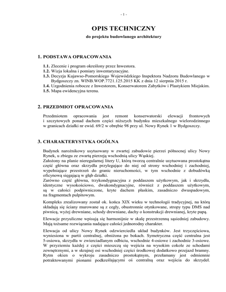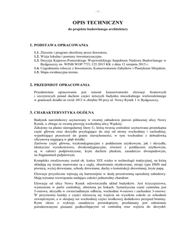 -1- OPIS TECHNICZNY do projektu budowlanego architektury 1. PODSTAWA OPRACOWANIA 1.1. Zlecenie i program określony przez Inwestora. 1.2. Wizja lokalna i pomiary inwentaryzacyjne. 1.3. Decyzja Kujawso-Pomorskiego Wojewódzkiego Inspektora Nadzoru Budowlanego w Bydgoszczy zn. WINB.WOP.7721.125.2015 KK z dnia 12 sierpnia 2015 r. 1.4. Uzgodnienia robocze z Inwestorem, Konserwatorem Zabytków i Plastykiem Miejskim. 1.5. Mapa ewidencyjna terenu. 2. PRZEDMIOT OPRACOWANIA Przedmiotem opracowania jest remont konserwatorski elewacji frontowych i szczytowych ponad dachem części niższych budynku mieszkalnego wielorodzinnego w granicach działki nr ewid. 69/2 w obrębie 98 przy ul. Nowy Rynek 1 w Bydgoszczy. 3. CHARAKTERYSTYKA OGÓLNA Budynek narożnikowy usytuowany w zwartej zabudowie pierzei północnej ulicy Nowy Rynek, u zbiegu ze zwartą pierzeją wschodnią ulicy Wąskiej. Założony na planie nieregularnej litery U, którą tworzą centralnie usytuowana prostokątna część główna oraz skrzydła przylegające do niej od strony wschodniej i zachodniej, wypełniające przestrzeń do granic nieruchomości, w tym wschodnie z dobudówką oficynową sięgającą w głąb działki. Zarówno część główna, trzykondygnacyjna z poddaszem użytkowym, jak i skrzydła, identyczne wysokościowo, dwukondygnacyjne, również z poddaszem użytkowym, są w całości podpiwniczone, kryte dachem płaskim, zasadniczo dwuspadowym, na fragmentach pulpitowym. Kompleks zrealizowany został ok. końca XIX wieku w technologii tradycyjnej, na którą składają się ściany murowane są z cegły, obustronnie otynkowane, stropy typu DMS nad piwnicą, wyżej drewniane, schody drewniane, dachy o konstrukcji drewnianej, kryte papą. Elewacje przyuliczne wpisują się harmonijnie w skalę przestrzenną sąsiedniej zabudowy. Mają tożsame rozwiązania nadające całości jednorodny charakter. Elewacja od ulicy Nowy Rynek odzwierciedla układ budynków. Jest trzyczęściowa, wyniesiona w partii centralnej, obniżona po bokach. Symetryczna część centralna jest 5-osiowa, skrzydła w zwierciadlanym odbiciu, wschodnie 4-osiowe i zachodnie 3-osiowe. W przyziemiu każdej z części mieszczą się wejścia na wysokim cokole ze schodami zewnętrznymi, a w skrajnej osi wschodniej części środkowej dodatkowo przejazd bramny. Rytm okien o wykroju zasadniczo prostokątnym, przełamany jest odmiennie potraktowanymi pionami podkreślającymi oś centralną oraz wejścia do skrzydeł. -2- W poziomie I piętra części centralnej rozwiązany jest balkon wsparty na wydatnych, bogato dekorowanych konsolach, obwiedziony balustradą ażurową stalową. Całości kompozycji dopełniają liczne i bogate elementy detalu, na które składają się: − − − − − − − − − − − − wysunięty cokół, boniowanie partii międzygzymsowych parteru, I i II piętra imitujące bloki kamienne, gzyms kordonowy między parterem, a I piętrem, gzymsy parapetowe odrębne pod oknami części głównej parteru oraz ciągle pod oknami pozostałymi, gzyms podokapowe, w tym ząbkowany w części głównej wydatne gzymsy okapowe skrzynkowe wsparte na konsolach, oprawa okien osi centralnej budynku w formie: • żłobkowanych pilastrów z głowicami kompozytowymi w poziomie I piętra spiętych gzymsem prostym dźwigającym na skrajach sterczyny na postumentach, • w poziomie II piętra pilastrów z przewiązkami połączonych łukiem biforyjnym, nad którym rozbudowany wydatny gzyms trójkątny, oprawy okien I piętra nad wejściami do części bocznych budynku w formie pilastrów zdobionych płycinami, spiętych belką prostą i żłobkowaną łukową, z tłem między belkami dekorowanym płycinami i główką oprawy pozostałych otworów parteru, I i II piętra w formie: • opasek prostych wokół otworów okiennych i drzwiowych parteru, • opasek prostych podwójnych w poziomie I piętra z płycinami nadokiennymi i gzymsami prostymi wspartymi na konsolkach dekorowanych główkami, • opasek prostych wokół okien II piętra z płycinami nadokiennymi i gzymsami prostymi, pas między gzymsem kordonowym i parapetowym w poziomie I piętra dekorowany pilastrami na przedłużeniu opasek okiennych i płycinami podokiennymi, pas żłobkowanych pilastrów płycin między oknami poddasza w częściach bocznych budynku, pas płycin dekorowanych girlandami między oknami poddasza części głównej. Elewacja od ulicy Wąskiej 6-osiowa stanowi na całej długości kontynuację frontu (w tym detalu) części niższej zachodniej. Elewacje szczytowe części głównej ponad dachami skrzydeł są proste i gładkie, bez detalu. Obecny stan techniczny elementów zewnętrznych obiektu jest nierównomierny i ogólnie niezadowalający. Elewacje są zniszczone. Stwierdzono zawilgocenie ścian cokołowych, pęknięcia ścian i nadproży, zły stan tynków, zły stan blacharki, wykończeń i akcesoriów elewacyjnych oraz bardzo zły stan oryginalnej stolarki okiennej. Niezależnie od stwierdzonych wad, stan techniczny elewacji pozwala na przeprowadzenie projektowanego zakresu robót remontowych i dociepleniowych. 4. STAN PRAWNY Nieruchomość stanowi własność „Wspólnoty Mieszkaniowej NOWY RYNEK 1”. -3- 5. ZAKRES OGÓLNY PRAC PROJEKTOWYCH • remont konserwatorski elewacji frontowych (południowo-zachodniej i zachodniej) uwzględniający odtworzenie częściowo zatraconych detali architektonicznych, • remont konserwatorski elewacji szczytowych wschodnich wyższej i niższej ponad dachami własnym oraz sąsiada oraz elewacji szczytowej zachodniej ponad dachem, • remont balkonu od strony południowo-zachodniej, • wymiana okien piwnicznych, • wszelkie prace uzupełniające wynikające z zakresu remontu, jak przełożenie rozprowadzeń instalacyjnych, wymiana blacharki, konserwacja elementów drewnianych i stalowych, wymiana akcesoriów elewacyjnych, itp. 6. WARUNKI OCHRONY PRZECIWPOŻAROWEJ Obiekt kwalifikuje się do kategorii ZLIV zagrożenia 