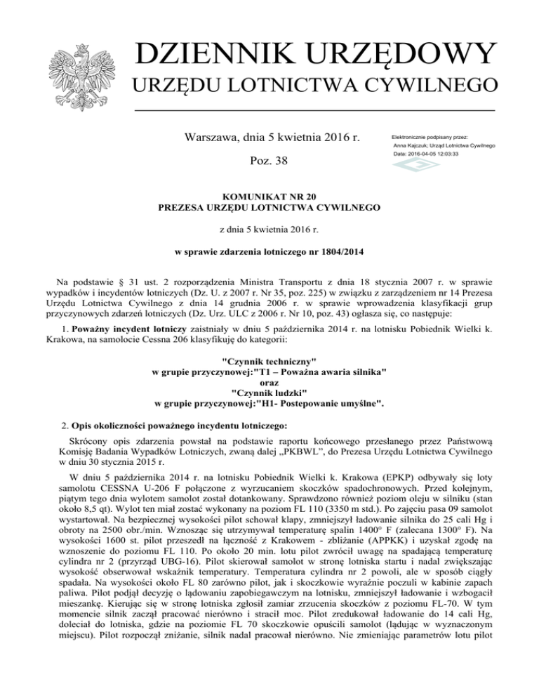 DZIENNIK URZĘDOWY URZĘDU LOTNICTWA CYWILNEGO Warszawa, dnia 5 kwietnia 2016 r. Elektronicznie podpisany przez: Anna Kajczuk; Urząd Lotnictwa Cywilnego Poz. 38 Data: 2016-04-05 12:03:33 KOMUNIKAT NR 20 PREZESA URZĘDU LOTNICTWA CYWILNEGO z dnia 5 kwietnia 2016 r. w sprawie zdarzenia lotniczego nr 1804/2014 Na podstawie § 31 ust. 2 rozporządzenia Ministra Transportu z dnia 18 stycznia 2007 r. w sprawie wypadków i incydentów lotniczych (Dz. U. z 2007 r. Nr 35, poz. 225) w związku z zarządzeniem nr 14 Prezesa Urzędu Lotnictwa Cywilnego z dnia 14 grudnia 2006 r. w sprawie wprowadzenia klasyfikacji grup przyczynowych zdarzeń lotniczych (Dz. Urz. ULC z 2006 r. Nr 10, poz. 43) ogłasza się, co następuje: 1. Poważny incydent lotniczy zaistniały w dniu 5 października 2014 r. na lotnisku Pobiednik Wielki k. Krakowa, na samolocie Cessna 206 klasyfikuję do kategorii: "Czynnik techniczny" w grupie przyczynowej:"T1 – Poważna awaria silnika" oraz "Czynnik ludzki" w grupie przyczynowej:"H1- Postepowanie umyślne". 2. Opis okoliczności poważnego incydentu lotniczego: Skrócony opis zdarzenia powstał na podstawie raportu końcowego przesłanego przez Państwową Komisję Badania Wypadków Lotniczych, zwaną dalej „PKBWL”, do Prezesa Urzędu Lotnictwa Cywilnego w dniu 30 stycznia 2015 r. W dniu 5 października 2014 r. na lotnisku Pobiednik Wielki k. Krakowa (EPKP) odbywały się loty samolotu CESSNA U-206 F połączone z wyrzucaniem skoczków spadochronowych. Przed kolejnym, piątym tego dnia wylotem samolot został dotankowany. Sprawdzono również poziom oleju w silniku (stan około 8,5 qt). Wylot ten miał zostać wykonany na poziom FL 110 (3350 m std.). Po zajęciu pasa 09 samolot wystartował. Na bezpiecznej wysokości pilot schował klapy, zmniejszył ładowanie silnika do 25 cali Hg i obroty na 2500 obr./min. Wznosząc się utrzymywał temperaturę spalin 1400° F (zalecana 1300° F). Na wysokości 1600 st. pilot przeszedł na łączność z Krakowem - zbliżanie (APPKK) i uzyskał zgodę na wznoszenie do poziomu FL 110. Po około 20 min. lotu pilot zwrócił uwagę na spadającą temperaturę cylindra nr 2 (przyrząd UBG-16). Pilot skierował samolot w stronę lotniska startu i nadal zwiększając wysokość obserwował wskaźnik temperatury. Temperatura cylindra nr 2 powoli, ale w sposób ciągły spadała. Na wysokości około FL 80 zarówno pilot, jak i skoczkowie wyraźnie poczuli w kabinie zapach paliwa. Pilot podjął decyzję o lądowaniu zapobiegawczym na lotnisku, zmniejszył ładowanie i wzbogacił mieszankę. Kierując się w stronę lotniska zgłosił zamiar zrzucenia skoczków z poziomu FL-70. W tym momencie silnik zaczął pracować nierówno i stracił moc. Pilot zredukował ładowanie do 14 cali Hg, doleciał do lotniska, gdzie na poziomie FL 70 skoczkowie opuścili samolot (lądując w wyznaczonym miejscu). Pilot rozpoczął zniżanie, silnik nadal pracował nierówno. Nie zmieniając parametrów lotu pilot Dziennik Urzędowy Urzędu Lotnictwa Cywilnego –2– Poz. 38 zbudował krąg nadlotniskowy i wylądował na pasie 09. Po lądowaniu zakołował przed hangar. Po opuszczeniu kabiny pilot stwierdził znaczny wyciek oleju z silnika. PKBWL po przeprowadzeniu badania silnika stwierdziła: 1) zmęczeniowe pęknięcie dwóch szpilek przelotowych mocujących 2 i 3 cylinder; 2) pęknięcia bloku silnika w okolicy 2 i 3 cylindra; 3) nieprawidłowe położenie jednego z żeberek chłodzących cylindra nr 2. Świadczy to o jego pęknięciu na skutek przegrzania; 4) przerwanie przewodu paliwowego przed wtryskiwaczem na cylindrze nr 2; 5) pęknięcie kolektora wydechowego na cylindrze nr 6 oraz miejscowe przebarwienia farby termoodpomej na wszystkich cylindrach. Ponadto po zdemontowaniu cylindra nr 3 stwierdzono, że cała powierzchnia gładzi cylindra pokryta jest siatką mikropęknięć. Zdaniem PKBWL takie uszkodzenia powstają po przekroczeniu naprężeń ściskających w warstwie wierzchniej ulepszanej cieplno-chemicznie (azotowanej). Ponieważ uszkodzenia te występują na całym obwodzie tulei cylindrowej, a nie tylko w miejscach, gdzie występują naciski boczne od tłoka, więc mogły powstać tylko na skutek cyklicznych obciążeń termicznych. PKBWL stwierdziła, że w Pokładowym Dzienniku Technicznym (PDT) nie dokonano żadnych zapisów dokumentujących usterki silnika. Według oświadczeń właściciela dokonywano wymiany uszczelnień w silniku. Według PKBWL częsta wymiana uszkodzonych uszczelek wynikała z przegrzewania silnika i wiązała się z wyciekami oleju. Zdaniem PKBWL opisane uszkodzenia silnika świadczą o jego złej eksploatacji. PKBWL analizując postępowanie pilota stwierdziła, że pojawienie się w kabinie wyraźnego zapachu paliwa, spadek temperatury na cylindrze 2 i nierówna praca silnika jednoznacznie wskazywały na powstanie nieszczelności w układzie paliwowym, co w konsekwencji mogło doprowadzić do pożaru samolotu. W zaistniałej sytuacji pilot powinien zamknąć kran paliwa, zwiększyć ładowanie (aby szybciej zużyć paliwo pozostałe w przewodach paliwowych instalacji), a po zatrzymaniu się silnika wyłączyć iskrowniki i wykonać lądowanie awaryjne na lotnisku. Kontynuowanie lotu z tak uszkodzonym pracującym silnikiem aż do lądowania, a następnie kołowanie pod hangar mogło spowodować pożar a nawet wybuch samolotu. Dodatkowo w raporcie końcowym PKBWL zawarła komentarz, w którym zwraca uwagę, że w krótkim odstępie czasu jest to kolejny przypadek uszkodzenia silnika na skutek złej eksploatacji w trakcie wykonywania lotów połączonych z wyrzucaniem skoczków spadochronowych. Zdaniem PKBWL może to świadczyć o małej świadomości pilotów, jakie znaczenie w trakcie wykonywania takich lotów ma prędkość (gradient) schładzania cylindrów i utrzymywanie zalecanych parametrów pracy silnika. 3. Przyczyna poważnego incydentu lotniczego: 1) niewłaściwa eksploatacja silnika w locie; 2) prawdopodob