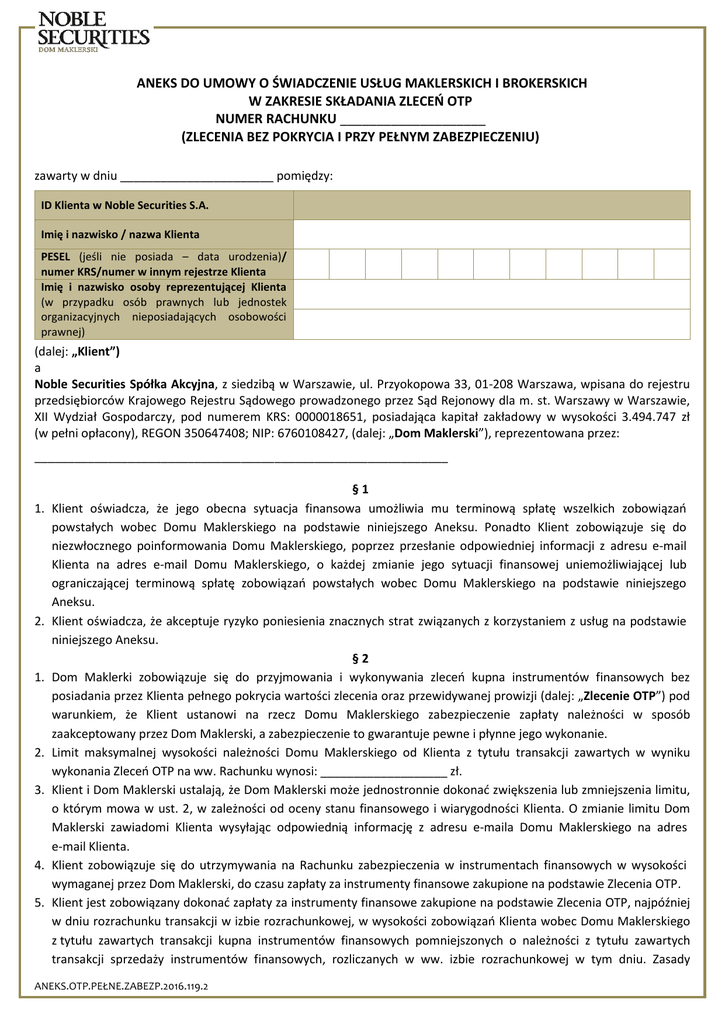ANEKS DO UMOWY O ŚWIADCZENIE USŁUG MAKLERSKICH I BROKERSKICH W ZAKRESIE SKŁADANIA ZLECEŃ OTP NUMER RACHUNKU ____________________ (ZLECENIA BEZ POKRYCIA I PRZY PEŁNYM ZABEZPIECZENIU) zawarty w dniu _______________________ pomiędzy: ID Klienta w Noble Securities S.A. Imię i nazwisko / nazwa Klienta PESEL (jeśli nie posiada – data urodzenia)/ numer KRS/numer w innym rejestrze Klienta Imię i nazwisko osoby reprezentującej Klienta (w przypadku osób prawnych lub jednostek organizacyjnych nieposiadających osobowości prawnej) (dalej: „Klient”) a Noble Securities Spółka Akcyjna, z siedzibą w Warszawie, ul. Przyokopowa 33, 01-208 Warszawa, wpisana do rejestru przedsiębiorców Krajowego Rejestru Sądowego prowadzonego przez Sąd Rejonowy dla m. st. Warszawy w Warszawie, XII Wydział Gospodarczy, pod numerem KRS: 0000018651, posiadająca kapitał zakładowy w wysokości 3.494.747 zł (w pełni opłacony), REGON 350647408; NIP: 6760108427, (dalej: „Dom Maklerski”), reprezentowana przez: ______________________________________________________________ 1. 2. 1. 2. 3. 4. 5. §1 Klient oświadcza, że jego obecna sytuacja finansowa umożliwia mu terminową spłatę wszelkich zobowiązań powstałych wobec Domu Maklerskiego na podstawie niniejszego Aneksu. Ponadto Klient zobowiązuje się do niezwłocznego poinformowania Domu Maklerskiego, poprzez przesłanie odpowiedniej informacji z adresu e-mail Klienta na adres e-mail Domu Maklerskiego, o każdej zmianie jego sytuacji finansowej uniemożliwiającej lub ograniczającej terminową spłatę zobowiązań powstałych wobec Domu Maklerskiego na podstawie niniejszego Aneksu. Klient oświadcza, że akceptuje ryzyko poniesienia znacznych strat związanych z korzystaniem z usług na podstawie niniejszego Aneksu. §2 Dom Maklerki zobowiązuje się do przyjmowania i wykonywania zleceń kupna instrumentów finansowych bez posiadania przez Klienta pełnego pokrycia wartości zlecenia oraz przewidywanej prowizji (dalej: „Zlecenie OTP”) pod warunkiem, że Klient ustanowi na rzecz Domu Maklerskiego zabezpieczenie zapłaty należności w sposób zaakceptowany przez Dom Maklerski, a zabezpieczenie to gwarantuje pewne i płynne jego wykonanie. Limit maksymalnej wysokości należności Domu Maklerskiego od Klienta z tytułu transakcji zawartych w wyniku wykonania Zleceń OTP na ww. Rachunku wynosi: ___________________ zł. Klient i Dom Maklerski ustalają, że Dom Maklerski może jednostronnie dokonać zwiększenia lub zmniejszenia limitu, o którym mowa w ust. 2, w zależności od oceny stanu finansowego i wiarygodności Klienta. O zmianie limitu Dom Maklerski zawiadomi Klienta wysyłając odpowiednią informację z adresu e-maila Domu Maklerskiego na adres e-mail Klienta. Klient zobowiązuje się do utrzymywania na Rachunku zabezpieczenia w instrumentach finansowych w wysokości wymaganej przez Dom Maklerski, do czasu zapłaty za instrumenty finansowe zakupione na podstawie Zlecenia OTP. Klient jest zobowiązany dokonać zapłaty za instrumenty finansowe zakupione na podstawie Zlecenia OTP, najpóźniej w dniu rozrachunku transakcji w izbie rozrachunkowej, w wysokości zobowiązań Klienta wobec Domu Maklerskiego z tytułu zawartych transakcji kupna instrumentów finansowych pomniejszonych o należności z tytułu zawartych transakcji sprzedaży instrumentów finansowych, rozliczanych w ww. izbie rozrachunkowej w tym dniu. Zasady ANEKS.OTP.PEŁNE.ZABEZP.2016.119.2 dokonania zapłaty określa „Regulamin świadczenia przez Noble Securities S.A. usług maklerskich i brokerskich oraz prowadzenia rachunków papierów wartościowych i rachunków pieniężnych” (dalej: „Regulamin”). 6. Dom Maklerski może odmówić przyjęcia Zlecenia OTP, gdy w ocenie Domu Maklerskiego jego przyjęcie może spowodować niewywiązanie się Klienta z przyjętych zobowiązań wobec Domu Maklerskiego. §3 Klient udziela Domowi Maklerskiemu pełnomocnictwa do wykonywania wszelkich czynności faktycznych i prawnych określonych w Umowie i Regulaminie na warunkach w nich określonych, w szczególności do: 1) sprzedaży instrumentów finansowych lub praw do otrzymania instrumentów finansowych stanowiących zabezpieczenie do wysokości roszczenia Domu Maklerskiego z tytułu nieopłacenia przez Klienta zakupionych instrumentów finansowych zrealizowanych na podstawie Zleceń OTP, wraz z prowizją i ewentualnymi innymi opłatami należnymi Domowi Maklerskiemu zgodnie z Tabelą opłat i prowizji, 2) sprzedaży dowolnych instrumentów finansowych lub praw do otrzymania instrumentów finansowych znajdujących się na Rachunku Klienta, jeżeli w czasie trwania danej sesji, wartość aktywów na Rachunku Klienta obniży się do wysokości zobowiązań Klienta z tytułu Zleceń OTP, 3) do zaspokojenia się ze wszystkich aktywów Klienta znajdujących się w Domu Maklerskim do wysokości roszczenia Domu Maklerskiego z tytułu niedokonania zapłaty za instrumenty finansowe nabyte na podstawie Zlecenia OTP, na zasadach określonych w Regulaminie. §4 1. Z dniem zawarcia niniejszego Aneksu ulegają rozwiązaniu zawarte wcześniej przez Klienta z Domem Maklerskim do ww. Rachunku Aneksy do „Umowy o świadczenie usług maklerskich i brokerskich" w zakresie składania Zleceń OTP. 2. Pozostałe postanowienia „Umowy o świadczenie usług brokerskich i maklerskich", z wyjątkiem ustalonych w niniejszym Aneksie, pozostają bez zmian. Podpis Klienta ________________________________ ____________________________________________ _______________________ podpis miejscowość data (W przypadku osób prawnych lub jednostek organizacyjnych reprezentant/reprezentanci umieszczają również pieczęć imienną) Oświadczam, iż Klient przedstawił oryginał swojego dokumentu tożsamości. Potwierdzam zgodność danych Klienta na umowie z danymi z dokumentu. Oświadczam, iż podpis Klienta został złożony w mojej obecności (nie dotyczy przypadku zawierania Umowy korespondencyjnie lub ele