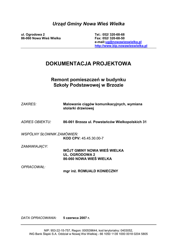Urząd Gminy Nowa Wieś Wielka ul. Ogrodowa 2 86-060 Nowa Wieś Wielka Tel.: 052/ 320-68-68 Fax: 052/ 320-68-50 e-mail:[email protected] http://www.bip.nowawieswielka.pl DOKUMENTACJA PROJEKTOWA Remont pomieszczeń w budynku Szkoły Podstawowej w Brzozie ZAKRES: Malowanie ciągów komunikacyjnych, wymiana stolarki drzwiowej ADRES OBIEKTU: 86-061 Brzoza ul. Powstańców Wielkopolskich 31 WSPÓLNY SŁOWNIK ZAMÓWIEŃ: KOD CPV: 45.45.30.00-7 ZAMAWIAJĄCY: WÓJT GMINY NOWA WIEŚ WIELKA UL. OGRODOWA 2 86-060 NOWA WIEŚ WIELKA OPRACOWAŁ: mgr inŜ. ROMUALD KONIECZNY DATA OPRACOWANIA: 5 czerwca 2007 r. NIP: 953-22-15-757, Regon: 000539644, kod terytorialny: 0403052, ING Bank Śląski S.A. Oddział w Nowej Wsi Wielkiej - 66 1050 1139 1000 0018 0204 5805 SPIS ZAWARTOŚCI OPRACOWANIA I. 1. 2. 3. 4. 5. 6. 7. 8. II. Opis techniczny Przedmiot i zakres opracowania. Podstawa opracowania. Stan istniejący. Projektowane rozwiązania techniczne. Informacja dotycząca BIOZ. Oddziaływanie na środowisko. Przedmiar robót. Uwagi końcowe. Protokół uzgodnień III. Część rysunkowa 1. Lokalizacja budynku w Brzozie. 2. Rzut remontowanych pomieszczeń. IV. Wypisy z rejestru gruntów 1. Stan własności. OPIS TECHNICZNY 1. PRZEDMIOT I ZAKRES OPRACOWANIA. Przedmiotem opracowania jest projekt budowlany, słuŜący do opisu zamówienia na wykonywanie robót budowlanych, dla których nie jest wymagane uzyskanie pozwolenia na budowę. Projekt obejmuje remont pomieszczeń w budynku Szkoły Podstawowej w Brzozie, w zakresie malowania ścian, sufitów oraz wymiany drzwi pełnych z ościeŜnicami drewnianymi w salach lekcyjnych, stołówce i pozostałych pomieszczeniach. Zakres prac obejmuje pomieszczenia Szkoły Podstawowej na I piętrze, parterze i piwnicy budynku w Brzozie przy ul. Powstańców Wielkopolskich 31. Szczegółowy opis przedmiotu zamówienia zawiera pkt 4 niniejszej dokumentacji. 2. PODSTAWA OPRACOWANIA. Projekt opracowano na podstawie zobowiązania podjętego z Zamawiającym. Dokumentacja została wykonana w oparciu o następujące przepisy, dokumenty i materiały: - Prawo zamówień publicznych; ustawa z dnia 29 stycznia 2004 r,. - Prawo budowlane; ustawa z dnia 7 lipca 1994 r., - rozporządzenie Ministra Infrastruktury z dnia 2 września 2004 r. w sprawie szczegółowego zakresu i formy dokumentacji projektowej, specyfikacji technicznych wykonania i odbioru robót budowlanych oraz programu funkcjonalno-uŜytkowego, - rozporządzenie Ministra Infrastruktury z dnia 12 kwietnia 2002 r. w sprawie warunków technicznych, jakim powinny odpowiadać budynki i ich usytuowanie, - mapa sytuacyjno-wysokościowa w skali 1:500, - wizja lokalna, uzgodnienia z uŜytkownikiem, - obowiązujące normatywy, katalogi, przepisy i normy. 3. STAN ISTNIEJĄCY. Na terenie Gminy Nowa Wieś Wielka znajduje się Szkoła Podstawowa im. Powstańców Wielkopolskich w Brzozie przy ul. Powstańców Wielkopolskich 31. Budynek Szkoły Podstawowej w Brzozie jest własnością Gminy i znajduje się na działkach ew. nr 58/1 i 59/8. Budynek szkoły nie jest wpisany do rejestru zabytków. Pomieszczenia szkoły, hole i korytarze, które są przedmiotem remontu znajdują się na I piętrze budynku i parterze, łącznie z klatką schodową do piwnicy przy dobudowanej części. Ze względu na zastrzeŜenia Powiatowego Inspektora Sanitarnego w Bydgoszczy oraz nienaleŜyty stan pomieszczeń przewidziano ich remont. W pomieszczeniach znajduje się instalacja elektryczna - oświetleniowa i sieciowa 230V, instalacja wodno-kanalizacyjna c.o. i wentylacji grawitacyjnej. Ściany remontowanych pomieszczeń są zabrudzone, spękane i nierówne. Drzwi wewnętrzne do pomieszczeń szkolnych są zniszczone. 4. PROJEKTOWANE ROZWIĄZANIA TECHNICZNE. W ramach opracowania przyjęto pomieszczenia do remontu zaznaczone na rzucie pomieszczeń. Przedmiotem malowania są następujące pomieszczenia: korytarz I piętra, parteru i piwnicy, klatka schodowa główna i boczna do piwnicy, korytarz zaplecza przy sali gimnastycznej, wraz z wnękami przy oknach. Zakres prac w powyŜszych pomieszczeniach obejmuje zeskrobanie i zmycie starej farby ze ścian i jednokrotne wykonanie gładzi gipsowej oraz dwukrotne malowanie ścian i sufitów farbą emulsyjną akrylową. Kolor sufitów biały, ściany w kolorze uzgodnionym z uŜytkownikiem. W ramach malowania ścian naleŜy wykonać lamperię farbą olejną, z przygotowaniem starej powierzchni z poszpachlowaniem ścian, przez dwukrotne malowanie. Główne korytarze parteru i piętra na ścianie z drzwiami wejściowymi do sal lekcyjnych naleŜy obłoŜyć płytkami ceramicznymi o wymiarach 30x30 3 warstwy, w celu zabezpieczenia przed uszkodzeniem i porysowaniem torbami i tornistrami dzieci szkolnych. Zestawienie powierzchni do malowania: PARTER: Wejście - sufity 18,26 m² - ściany 33,5 m² Hol główny - sufit 109,78 m² - ściany 88,36 m² Korytarz pom. socjalnych - sufit 25,2 m² - ściany 88,36 m² Korytarz - sufit 137,8 m² - ściany 209,68 m² Klatka schodowa główna - sufit 26,2 m² - ściany 74,82 m² Klatka schodowa boczna - sufit 33,83 m² - ściany 121,87 m² PIĘTRO: Korytarz - sufit 137,8 m² - ściany 209,68 m² Hol główny - sufit 102 m² - ściany 155,97 m² Zakres prac związanych z wymianą drzwi i ościeŜnic obejmuje: wyjęcie starych drzwi z zawiasów, wykucie ościeŜnic stalowych, dostarczenie i osadzenie ościeŜnic drewnianych (sosna) wraz z niezbędną obróbką tynkarską i uzupełnieniem ubytków w ścianie oraz wykończeniem ościeŜnic opaską, dostawę, montaŜ i regulację skrzydeł drzwiowych w ościeŜnicach, zamontowanie zamków wraz z klamkami gałkowymi. Drewniane skrzydła drzwiowe (sosna) pełne, jedynie do pomieszczeń sanitarnych z otworami wentylacyjnymi. Wymiana drzwi wraz z ościeŜnicami przewidziana jest w następujących pomieszczeniach: PARTER - sala gimnastyczna 90cm lewe - pomieszczenie socjalne 90cm prawe 1 szt., lewe 1 szt.; 80cm prawe 1szt. lewe 1szt. -pomieszczenie zaplecza