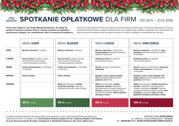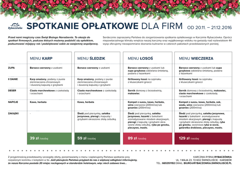 SPOTKANIE OPŁATKOWE DLA FIRM Przed nami magiczny czas Świąt Bożego Narodzenia. To okazja do spotkań firmowych, podczas których możemy podzielić się opłatkiem, podsumować mijający rok i podziękować sobie za wzajemną współpracę. Serdecznie zapraszamy Państwa do zorganizowania spotkania opłatkowego w Karczmie Rybaczówka. Oprócz niepowtarzalnego klimatu wnętrza naszej karczmy oraz wyjątkowego widoku na gwiazdy nad rozlewiskiem 44 wysp oferujemy niezapomniane doznania kulinarne w czterech pakietach przedstawionych poniżej. MENU KARP MENU ŚLEDZIK MENU ŁOSOŚ MENU WIECZERZA ZUPA Barszcz czerwony z uszkami Barszcz czerwony z uszkami Barszcz czerwony z uszkami lub zupa grzybowa zabielana śmietaną, podana z łazankami Barszcz czerwony z uszkami lub zupa grzybowa zabielana śmietaną, podana z łazankami II DANIE Karp smażony, podany z purée ziemniaczano-chrzanowym i duszoną kapustą z grzybami Karp smażony, podany z purée ziemniaczano-chrzanowym i duszoną kapustą z grzybami Grillowany łosoś na szpinaku z kluseczkami gnocci Grillowany łosoś na szpinaku z kluseczkami gnocci DESER Ciasto marchewkowe z czekoladą i orzechami Ciasto marchewkowe z czekoladą i orzechami Sernik domowy z brzoskwinią, makowiec Sernik domowy z brzoskwinią, makowiec, ciasto marchewkowe z czekoladą i orzechami NAPOJE Kawa, herbata Kawa, herbata Kompot z suszu, kawa, herbata, wino czerwone (200ml/os) lub grzaniec (200ml/os) Kompot z suszu, kawa, herbata, sok, woda, wino czerwone (200ml/os) lub grzaniec (200ml/os) ZAKĄSKI - Śledź pod pierzynką, sałatka jarzynowa, pierogi z kapustą i grzybami okraszone złotą cebulką. Śledź pod pierzynką, sałatka jarzynowa, łazanki z bakaliami aromatyzowane miodem akacjowym, pierogi z kapustą i grzybami okraszone złotą cebulką, ryba po grecku, pieczywo, masło. Śledź pod pierzynką, sałatka jarzynowa, łazanki z bakaliami aromatyzowane miodem akacjowym, pierogi z kapustą i grzybami okraszone złotą cebulką, ryba po grecku, sezonowa ryba w occie, galaretka drobiowa, pieczywo, masło. 39 zł /osobę 59 zł /osobę 89 zł /osobę 129 zł /osobę Z przyjemnością przedstawimy szczegóły oferty, porozmawiamy o menu i zaplanujemy Państwa spotkanie przy rozpalonym kominku z kolędami w tle. Jeśli planujecie Państwo przyjazd do nas z większej odległości informujemy, że nasza Karczma posiada 20 miejsc noclegowych w standardzie hotelowym, więc niech zabawa trwa… KARCZMA RYBNA RYBACZÓWKA TEL.: 665351192 EMAIL: [email protected]