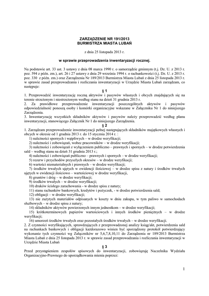 ZARZĄDZENIE NR 191/2013 BURMISTRZA MIASTA LUBAŃ z dnia 25 listopada 2013 r. w sprawie przeprowadzenia inwentaryzacji rocznej. Na podstawie art. 33 ust. 3 ustawy z dnia 08 marca 1990 r. o samorządzie gminnym (t.j. Dz. U. z 2013 r. poz. 594 z późn. zm.), art. 26 i 27 ustawy z dnia 29 września 1994 r. o rachunkowości (t.j. Dz. U. z 2013 r. poz. 330 z późn. zm.) oraz Zarządzenia Nr 189/2013 Burmistrza Miasta Lubań z dnia 25 listopada 2013 r. w sprawie zasad przeprowadzania i rozliczania inwentaryzacji w Urzędzie Miasta Lubań zarządzam, co następuje: §1 1. Przeprowadzić inwentaryzację roczną aktywów i pasywów własnych i obcych znajdujących się na terenie strzeżonym i niestrzeżonym według stanu na dzień 31 grudnia 2013 r. 2. Za prawidłowe przeprowadzenie inwentaryzacji poszczególnych aktywów i pasywów odpowiedzialność ponoszą osoby i komórki organizacyjne wskazane w Załączniku Nr 1 do niniejszego Zarządzenia. 3. Inwentaryzację wszystkich składników aktywów i pasywów należy przeprowadzić według planu inwentaryzacji, stanowiącego Załącznik Nr 1 do niniejszego Zarządzenia. §2 1. Zarządzam przeprowadzenie inwentaryzacji pełnej następujących składników majątkowych własnych i obcych w okresie od 1 grudnia 2013 r. do 15 stycznia 2014 r. : 1) należności spornych i wątpliwych – w drodze weryfikacji; 2) należności i zobowiązań, wobec pracowników – w drodze weryfikacji; 3) należności i zobowiązań z wyłączeniem publiczno – prawnych i spornych – w drodze potwierdzenia sald – według stanu na dzień 31 grudnia 2013 r.; 4) należności i zobowiązań publiczno – prawnych i spornych – w drodze weryfikacji; 5) rezerw i przychodów przyszłych okresów – w drodze weryfikacji; 6) wartości niematerialnych i prawnych – w drodze weryfikacji; 7) środków trwałych ujętych w ewidencji ilościowej – w drodze spisu z natury i środków trwałych ujętych w ewidencji ilościowo – wartościowej w drodze weryfikacji, 8) gruntów i dróg – w drodze weryfikacji; 9) środków trwałych – w drodze weryfikacji; 10) druków ścisłego zarachowania - w drodze spisu z natury; 11) stanu rachunków bankowych, kredytów i pożyczek, - w drodze potwierdzenia sald; 12) obligacji – w drodze weryfikacji; 13) nie zużytych materiałów odpisanych w koszty w dniu zakupu, w tym paliwo w samochodach służbowych – w drodze spisu z natury; 14) składników aktywów powierzonych innym jednostkom – w drodze weryfikacji; 15) krótkoterminowych papierów wartościowych i innych środków pieniężnych – w drodze weryfikacji; 16) umorzeń środków trwałych oraz pozostałych środków trwałych – w drodze weryfikacji. 2. Z czynności weryfikujących, sprawdzających z przeprowadzonej analizy ksiąg/akt, potwierdzenia sald na rachunkach bankowych i obligacji każdorazowo winien być sporządzony protokół potwierdzający wykonanie tych czynności wg Załączników nr 5,6,7,8,10,11 do Zarządzenia nr 189/2013 Burmistrza Miasta Lubań z dnia 25 listopada 2013 r. w sprawie zasad przeprowadzania i rozliczania inwentaryzacji w Urzędzie Miasta Lubań §3 Przed przystąpieniem zespołów spisowych do inwentaryzacji, zobowiązuję Naczelnika Wydziału Organizacyjno-Prawnego do uporządkowania mienia poprzez: 1 1. Oznaczenia wywieszkami mienia znajdującego się w poszczególnych pomieszczeniach (w każdym z budynków) z naniesieniem na wywieszki numerów ewidencyjnych widniejących na sprzętach, a wynikających z prowadzonej ewidencji ilościowej w Wydziale Organizacyjno – Prawnym i ilościowo – wartościowej prowadzonej w Wydziale Budżetowo - Księgowym. 2. Uporządkowanie ewidencji ilościowej pozostałych środków trwałych w używaniu poprzez nadanie brakujących numerów inwentarzowych. 3. Przygotowanie niezbędnej dokumentacji wynikającej z wewnętrznych uregulowań Burmistrza Miasta Lubań dotyczącej mienia nieprzydatnego lub kwalifikującego się do likwidacji. §4 Zobowiązuję osoby materialnie odpowiedzialne za powierzony majątek do dostarczenia w trybie pilnym (przed rozpoczęciem inwentaryzacji) do Wydziału Organizacyjno – Prawnego uzupełniających informacji o zmianie miejsca użytkowania środków trwałych i pozostałych środków trwałych w używaniu – zgodnie z Zarządzeniem Nr 190/2013 Burmistrza miasta Lubań z dnia 25 listopada 2013 r w sprawie przepisów wewnętrznych regulujących gospodarkę finansową Urzędu Miasta Lubań (Załącznik Nr 1 § 9 ust. 3 pkt 2 i § 20 ust.1 lit. o). §5 Zobowiązuję pracownika Wydziału Budżetowo - Księgowego (prowadzącego i odpowiedzialnego za ewidencję ilościowo – wartościową pozostałych środków trwałych i ewidencję środków trwałych) do: 1. Nadania brakujących numerów inwentarzowych przyjętym do używania sprzętom według prowadzonej w Wydziale Budżetowo - Księgowym ewidencji. 2. Dokonania wyceny zinwentaryzowanych składników majątkowych będących w ewidencji ilościowowartościowej i rozliczenia inwentaryzacji tych składników majątkowych. §6 Zobowiązuję pracownika Wydziału Organizacyjno – Prawnego (prowadzącego i odpowiedzialnego za ewidencję ilościową) do: 1. Nadania brakujących numerów inwentarzowych przyjętym do użytkowania pozostałym środkom trwałym. 2. Rozliczenie inwentaryzacji składników majątkowych pozostałych środków trwałych wg ewidencji ilościowej. §7 1. Przewodniczący Komisji Inwentaryzacyjnej – działający na podstawie Zarządzenia Nr 149/2003 Burmistrza Miasta Lubań z dnia 23 września 2003 roku w sprawie: powołania komisji inwentaryzacyjnej w Urzędzie Miasta Lubań - w terminie do 01 grudnia 2013 roku przygotuje wniosek do Burmistrza o powołanie zespołów spisowych według wzoru stanowiącego załączniki nr 2 do niniejszego zarządzenia. 2. Przewodniczący Komisji Inwentaryzacyjnej odpowiada za sprawny, terminowy i prawidłowy przebieg czynności inwentaryzacyjnych. 3. Przed przystąpi