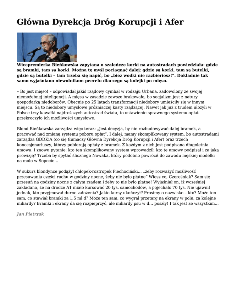 Główna Dyrekcja Dróg Korupcji i Afer Wicepremierka Bieńkowska zapytana o szaleńcze korki na autostradach powiedziała: gdzie są bramki, tam są korki. Można tę myśl pociągnąć dalej: gdzie są korki, tam są butelki, gdzie są butelki – tam trzeba się napić, bo „biez wodki nie razbieriosz!”. Dokładnie tak samo wyjaśniano niewolnikom peerelu dlaczego są kolejki po mięso. – Bo jest mięso! – odpowiadał jakiś rządowy cymbał w rodzaju Urbana, zadowolony ze swojej niemożebnej inteligencji. A mięsa w zasadzie zawsze brakowało, bo socjalizm jest z natury gospodarką niedoborów. Obecnie po 25 latach transformacji niedobory umieściły się w innym miejscu. Są to niedobory umysłowe próżniaczej kasty rządzącej. Nawet jak już z trudem ułożyli w Polsce trzy kawałki najdroższych autostrad świata, to ustawienie sprawnego systemu opłat przekroczyło ich możliwości umysłowe. Blond Bieńkowska zarządza więc teraz: „Jest decyzja, by nie rozbudowywać dalej bramek, a pracować nad zmianą systemu poboru opłat”. I dalej: mamy skomplikowany system, bo autostradami zarządza GDDKiA (co się tłumaczy Główna Dyrekcja Dróg Korupcji i Afer) oraz trzech koncesjonariuszy, którzy pobierają opłaty z bramek. Z każdym z nich jest podpisana długoletnia umowa. I znowu pytanie: kto ten skomplikowany system wprowadził, kto te umowy podpisał i za jaką prowizję? Trzeba by spytać ślicznego Nowaka, który podobno powrócił do zawodu męskiej modelki na molo w Sopocie… W sukurs blondynce podążył chłopek-roztropek Piechociński… „żeby rozważyć możliwość przesuwania części ruchu w godziny nocne, żeby nie było płatne” Wiesz co, Czereśniak? Sam się przesuń na godziny nocne z całym rządem i żeby to nie było płatne! Wyjaśniał on, iż wcześniej zakładano, że na drodze A1 miało kursować 20 tys. samochodów, a pojechało 70 tys. Nie ujawnił jednak, kto przyjmował durne założenia? Jakie kursy ukończył? Prosimy o nazwisko – kto? Może ten sam, co stawiał bramki za 1,5 ml d? Może ten sam, co wygrał przetarg na ekrany w polu, za kolejne miliardy? Bramki i ekrany da się rozpieprzyć, ale miliardy psu w d… poszły! I tak jest ze wszystkim… Jan Pietrzak