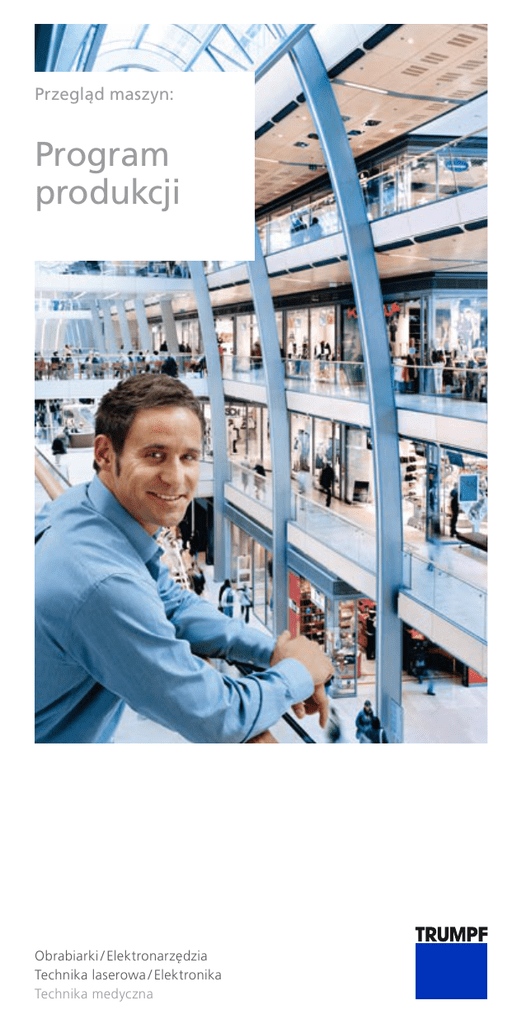 Przegląd maszyn: Program produkcji Obrabiarki / Elektronarzędzia Technika laserowa / Elektronika Technika medyczna Wszystko, czego Państwo potrzebują. Spis treści TruLaser: Ekonomiczne cięcie grubych i cienkich blach. 5–17 TruMatic: Doskonałe połączenie wykrawania i obróbki laserowej. 19–24 TruPunch: Nowa jakość wykrawania. 27–31 TruShear: Ekonomiczne cięcie. 33–38 TruBend: Większy zakres gięcia. 39–44 TruBend Cell: Pełna automatyzacja. 47–49 TruLaser Tube: Innowacyjne cięcie rur i profili. 51–53 TruStore: Magazyn na miarę Państwa ambicji. 55–57 TruTool: Narzędzia elektryczne i pneumatyczne. 58–59 Znakowarki laserowe: Znakowanie światłem. 61–65 Systemy laserowe: Podejmujemy wyzwania. 67–74 Lasery: Do każdego zadania doskonałe rozwiązanie. 77–85 TruServices: Serwis jak żaden inny. 87–99 Produkty przedstawione w niniejszym prospekcie nie są dostępne we wszystkich krajach. 2 Grupa TRUMPF należy w skali światowej do czołowych producentów maszyn do obróbki blachy i laserów przemysłowych. Zaawansowane rozwiązania technologicznie znajdują się w centrum naszych działań od 1923 roku. Nasze innowacje wyznaczają standardy – w obrabiarkach, elektronarzędziach oraz technice laserowej i medycznej. Chęć opracowywania innowacyjnych tech nologii i sukcesy naszych klientów są dla nas motywacją do opracowywania coraz bardziej wydajnych maszyn. Naszym celem jest spełnianie wysokich wymagań jakościowych oraz nieza wodna obsługa odbiorców. Mogą Państwo na nas liczyć w każdym przed siewzięciu, począwszy od planowania linii technologicznych aż do optymali zacji procesu produkcyjnego. Również jeśli chcą Państwo zasięgnąć informacji o nowym narzędziu – jesteśmy do Państwa dyspozycji. 3 4 TruLaser: Ekonomiczne cięcie grubych i cienkich blach. Urzadzenia TruLaser dają Państwu zdecydowaną prze wagę w obróbce detali 2D. Przy pomocy laserów ob rabiają Państwo dowolne kontury w blachach cienkich i grubych – to wszystko z zachowaniem najwyższej jakości. 5 TruLaser Seria 1000: TruLaser 1030 Ekonomiczne i przyjazne w obsłudze kompaktowe maszyny zapewniają wydajną obróbkę laserową. Niskie koszty inwestycyjne i eksploatacji. Łatwa w obsłudze. Mała powierzchnia zabudowy – tylko 25 m2. Szybka i łatwa instalacja. TruLaser 1030 Obszar roboczy 3000 x 1500 mm Maks. prędkości symultanicznie 85 m/min Dostępne lasery TruCoax 2500 Maks. moc lasera 2500 W Maks. grubość – stal konstrukcyjna 16 mm Maks. grubość – stal nierdzewna 8 mm Maks. grubość – aluminium 6 mm 6 TruLaser Seria 1000: TruLaser 1030 fiber Wszechstronność urządzenia TruLaser 1030 fiber z laserem na ciele stałym. Spektrum obrabianych materiałów powiększone o miedź i mosiądz. Zwiekszona wydajność w obróbce blach cienkich. Ekonomiczne wejście w świat spawania laserowego. TruLaser 1030 fiber Obszar roboczy 3000 x 1500 mm Maks. prędkości symultanicznie 85 m/min Dostępne lasery TruDisk 2001 Maks. moc lasera 2000 W Maks. grubość – stal konstr. 12 mm Maks. grubość – stal nierdz. 6 mm Maks. grubość – aluminium 5 mm Maks. grubość – miedź 3 mm Maks. grubość – mosiądz 3 mm 7 TruLaser Seria 2000: TruLaser 2025 / 2030 Maszyna z liniowym przepływem materiału – automatyzacja w pakiecie. Doskonała jakość obrabianych krawędzi w blachach cienkich. Wydajny, liniowy przepływ materiału. Zintegrowana automatyzacja. Optymalna dostępność. Kompaktowe wymiary maszyny. TruLaser 2025 TruLaser 2030 Obszar roboczy 2500 x 1250 mm 3000 x 1250 / 1500 mm Maks. prędkości, symultanicznie 170 m/min 170 m/min TruCoax 2000 TruCoax 3200 Maks. moc lasera 2000 W 3200 W Maks. grubość – stal konstr. 12 mm 20 mm Maks. grubość – stal nierdz. 6 mm 10 mm Maks. grubość – aluminium 5 mm 8 mm Dostępne lasery 8 9 TruLaser Seria 3000: TruLaser 3030 / 3040 / 3060 Standardowe maszyny uniwersalne – potrafią wszystko. Optymalna elastyczność obróbki. Duże prędkości cięcia i minimalne czasy przestoju. Łatwa konserwacja. Łatwa obsługa. Zróżnicowane opcje automatyzacji. Ekonomiczne wejście w obszar obróbki laserowej z TruLaser 3030 Lean Edition. TruLaser 3030 Lean Edition[1] TruLaser 3030 [2] Obszar roboczy 3000 x 1500 mm 3000 x 1500 mm Maks. prędkości, symultanicznie 140 m/min 140 m/min TruFlow 2000 TruFlow 2700 Maks. moc lasera 2000 W 2700 W Maks. grubość – stal konstr. 12 mm 15 mm Maks. grubość – stal nierdz. 4 mm 6 mm Maks. grubość – aluminium 3 mm 5 mm Dostępne lasery [1] Dostępny tylko z laserem TruFlow 3200. [2] Dostępny tylko z laserem TruFlow 3200 / 4000 / 5000 / 6000. 10 TruLaser 3040 [3] TruLaser 3060 [4] 4000 x 2000 mm 6000 x 2000 mm 140 m/min 85 m/min TruFlow 3200 TruFlow 4000 TruFlow 5000 TruFlow 6000 3200 W 4000 W 5000 W 6000 W 20 mm 20 mm 25 mm 25 mm 12 mm 15 mm 20 mm 25 mm 8 mm 10 mm 12 mm 15 mm [3] Dostępny tylko z laserem TruFlow 3200 / 4000 / 5000. [4] Dostępny tylko z laserem TruFlow 2000 / 2700 / 3200 / 4000. 11 TruLaser Seria 5000: TruLaser 5030 / 5040 / 5060 Uniwersalne maszyny o dużych mocach. Optymalna wydajność w obróbce uniwersalnej i obróbce blach cienkich. Duże prędkości osi i dynamika pozycjonowania dzięki napędom liniowym. Minimalne czasy przestoju dzięki strategii pojedynczej głowicy tnącej i opcjonalnemu, automatycznemu zmieniaczowi dysz. Szerokie spektrum materiałów. Zróżnicowane opcje automatyzacji. TruLaser 5030 TruLaser 5040 TruLaser 5060 Obszar roboczy 3000 x 1500 mm 4000 x 2000 mm 6000 x 2000 mm Maks. prędkości, symultanicznie 300 m/min 300 m/min 300 m/min TruFlow 5000 TruFlow 6000 TruFlow 7000 5000 W Dostępne lasery Maks. moc lasera 6000 W 7000 W Maks. grubość – stal konstr. 25 mm 25 mm 25 mm Maks. grubość – stal nierdz. 20 mm 25 mm 30 mm Maks. grubość – aluminium 12 mm 15 mm 20 mm 12 TruLaser Seria 5000: TruLaser 5030 fiber TruLaser 5030 fiber z laserem na ciele stałym daje przewagę w obróbce blach cienkich. Nawet tr
