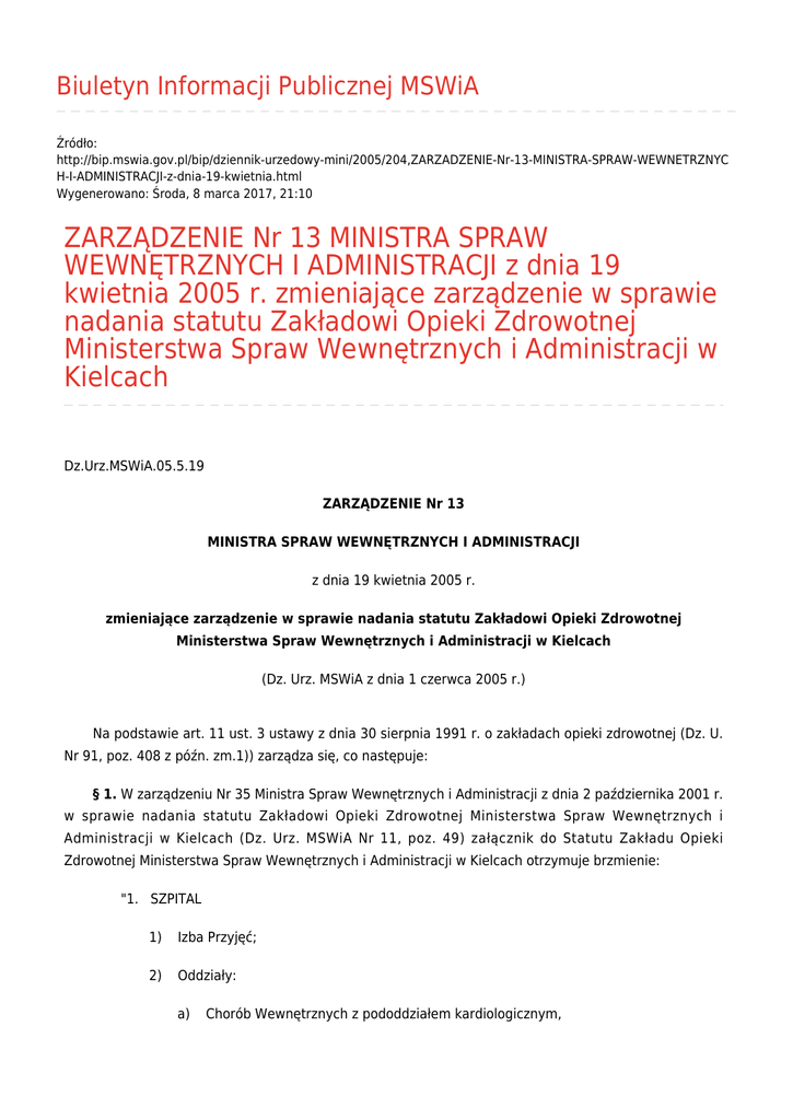 Biuletyn Informacji Publicznej MSWiA Źródło: http://bip.mswia.gov.pl/bip/dziennik-urzedowy-mini/2005/204,ZARZADZENIE-Nr-13-MINISTRA-SPRAW-WEWNETRZNYC H-I-ADMINISTRACJI-z-dnia-19-kwietnia.html Wygenerowano: Środa, 8 marca 2017, 21:10 ZARZĄDZENIE Nr 13 MINISTRA SPRAW WEWNĘTRZNYCH I ADMINISTRACJI z dnia 19 kwietnia 2005 r. zmieniające zarządzenie w sprawie nadania statutu Zakładowi Opieki Zdrowotnej Ministerstwa Spraw Wewnętrznych i Administracji w Kielcach Dz.Urz.MSWiA.05.5.19 ZARZĄDZENIE Nr 13 MINISTRA SPRAW WEWNĘTRZNYCH I ADMINISTRACJI z dnia 19 kwietnia 2005 r. zmieniające zarządzenie w sprawie nadania statutu Zakładowi Opieki Zdrowotnej Ministerstwa Spraw Wewnętrznych i Administracji w Kielcach (Dz. Urz. MSWiA z dnia 1 czerwca 2005 r.) Na podstawie art. 11 ust. 3 ustawy z dnia 30 sierpnia 1991 r. o zakładach opieki zdrowotnej (Dz. U. Nr 91, poz. 408 z późn. zm.1)) zarządza się, co następuje: § 1. W zarządzeniu Nr 35 Ministra Spraw Wewnętrznych i Administracji z dnia 2 października 2001 r. w sprawie nadania statutu Zakładowi Opieki Zdrowotnej Ministerstwa Spraw Wewnętrznych i Administracji w Kielcach (Dz. Urz. MSWiA Nr 11, poz. 49) załącznik do Statutu Zakładu Opieki Zdrowotnej Ministerstwa Spraw Wewnętrznych i Administracji w Kielcach otrzymuje brzmienie: "1. SZPITAL 1) Izba Przyjęć; 2) Oddziały: a) Chorób Wewnętrznych z pododdziałem kardiologicznym, 3) 2. b) Chirurgiczny, c) Ginekologiczny, d) Anestezjologii i Intensywnej Terapii; Pracownie: a) RTG i USG, b) Diagnostyki Laboratoryjnej, c) Usprawnienia Leczniczego (Rehabilitacja); 4) Apteka Szpitalna; 5) Wojewódzka Komisja Lekarska. PRZYCHODNIA 1) Gabinet Podstawowej Opieki Zdrowotnej w Przychodni w Kielcach; 2) Gabinet Podstawowej Opieki Zdrowotnej w ambulatoriach terenowych: Sandomierz, Jędrzejów, Kazimierza Wielka, Końskie, Ostrowiec Świętokrzyski, Skarżysko-Kamienna, Starachowice 3) Poradnia Medycyny Pracy; 4) Poradnie specjalistyczne: a) Badań Profilaktycznych, b) Zdrowia Psychicznego (PZP), c) Psychotechniczna, d) Neurologiczna, e) Chorób Płuc, f) Stomatologiczna (Zachowawcza Chirurgiczna Pracownia Protetyczna), g) Okulistyczna, h) Laryngologiczna, i) Dermatologiczna, j) Gastrologiczna, k) Kardiologiczna, l) Cukrzycowa, m) Endokrynologiczna, n) Chirurgiczna, o) Ortopedyczna, p) Urologiczna, q) Neurologii Dziecięcej r) Endokrynologii Dziecięcej, s) Ginekologiczna, t) Alergologiczna, u) Nefrologiczna, v) Alergii Pokarmowych, w) Alergii Oddechowych, x) Alergii Skórnych, y) Nadciśnienia Tętniczego, z) Zaburzeń Rytmu Serca, za) Przeciwpadaczkowa, zb) Stwardnienia Rozsianego, ze) Leczenia Jaskry, zd) Gastroenterologiczna, zc) Audiologiczna, zf) Foniatryczna, zg) Geriatryczna, zh) Wad Postawy, zi) Logopedyczna; 4) Gabinet Zabiegowy; 5) Pracownie: 6) a) RTG, b) USG, c) Diagnostyki laboratoryjnej; Apteka". § 2. Zarządzenie wchodzi w życie z dniem ogłoszenia. _________ 1) Zmiany ustawy zostały ogłoszone w Dz. U. z 1992 r. Nr 63, poz. 315, z 1994 r. Nr 121, poz. 591, z 1995 r. Nr 138, poz. 682, z 1996 r. Nr 24, poz. 110, z 1997 r. Nr 104, poz. 661, Nr 121, poz. 769 i Nr 158, poz. 1041, z 1998 r. Nr 106, poz. 668, Nr 117, poz. 756 i Nr 162, poz. 1115, z 1999 r. Nr 28, poz. 255 i 256 i Nr 84, poz. 935, z 2000 r. Nr 3, poz. 28, Nr 12, poz. 136, Nr 43, poz. 489, Nr 84, poz. 948 i Nr 120, poz. 1268, z 2001 r. Nr 5, poz. 45, Nr 88, poz. 961, Nr 100, poz. 1083, Nr 111, poz. 1193, Nr 113, poz. 1207, Nr 126, poz. 1382, 1383 i 1384 i Nr 128, poz. 1407, z 2002 r. Nr 113, poz. 984, z 2003 r. Nr 45, poz. 391, Nr 124, poz. 1151 i 1152, Nr 171, poz. 1663, Nr 213, poz. 2081 i Nr 223, poz. 2215 oraz z 2004 r. Nr 210, poz. 2135 i Nr 273, poz. 2703. Metryczka Data publikacji 19.07.2005 Podmiot udostępniający informację: Rejestr zmian Ministerstwo Spraw Wewnętrznych i Administracji Osoba wytwarzająca/odpowiadająca za informację: Osoba udostępniająca informację: Sebastian Górkiewicz Osoba modyfikująca informację:
