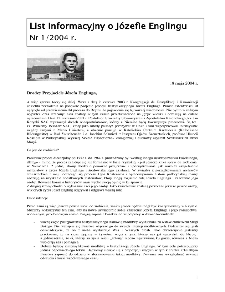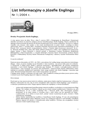 List Informacyjny o Józefie Englingu Nr 1/2004 r. 18 maja 2004 r. Drodzy Przyjaciele Józefa Englinga, A więc sprawa toczy się dalej. Wraz z datą 9. czerwca 2003 r. Kongregacja ds. Beatyfikacji i Kanonizacji udzieliła zezwolenia na ponowne podjęcie procesu beatyfikacyjnego Józefa Englinga. Prawie czterdzieści lat upłynęło od przewiezienia akt procesu do Rzymu do pojawienia się tej ważnej wiadomości. Nie był to w żadnym wypadku czas stracony: akta zostały w tym czasie przetłumaczone na język włoski i oczekują na dalsze opracowanie. Dnia 17. września 2003 r. Postulator Generalny Stowarzyszenia Apostolstwa Katolickiego, ks. Jan Korycki SAC wyznaczył dwóch wicepostulatorów, którzy z Niemiec będą towarzyszyć procesowi. Są to: ks. Wincenty Reinhart SAC, który jako młody pallotyn przebywał w Chile i tam współpracował intensywnie między innymi z Mario Hiriartem, a obecnie pracuje w Katolickim Centrum Kształcenia (Katholische Bildungstätte) w Bad Zwischenahn i o. Joachim Schmiedl z Instytutu Ojców Szensztackich, profesor Historii Kościoła w Pallotyńskiej Wyższej Szkole Filozoficzno-Teologicznej i duchowy asystent Szensztackich Braci Maryi. Co jest do zrobienia? Ponieważ proces diecezjalny od 1952 r. do 1964 r. prowadzony był według innego ustawodawstwa kościelnego, dlatego - mimo, że proces znajduje się już formalnie w fazie rzymskiej - jest jeszcze kilka spraw do zrobienia w Niemczech. Z jednej strony chodzi o ponowne przejrzenie i uporządkowanie, jak również uzupełnienie materiałów z życia Józefa Englinga i środowiska jego działania. W związku z porządkowaniem archiwów szensztackich z racji toczącego się procesu Ojca Kentenicha i opracowywania historii pallotyńskiej mamy nadzieję na uzyskanie dodatkowych materiałów, który mogą rozjaśnić rolę Józefa Englinga i znaczenie jego osoby. Również komisja historyków musi wydać swoją opinię w tej sprawie. Z drugiej strony chodzi o wykazanie czci jego osoby. Jako świadkowie zostaną powołane jeszcze pewne osoby, w których życiu Józef Engling odgrywał i odgrywa ważną rolę. Dwie intencje Przed nami są więc jeszcze pewne kroki do zrobienia, zanim proces będzie mógł być kontynuowany w Rzymie. Możemy wykorzystać ten czas, aby na nowo uświadomić sobie znaczenie Józefa Englinga i jego świadectwa w obecnym, przełomowym czasie. Pragnę zaprosić Państwa do współpracy w dwóch kierunkach: - - ważną część postępowania beatyfikacyjnego stanowią modlitwy wysłuchane za wstawiennictwem Sługi Bożego. Nie wahajcie się Państwo włączać go do swoich intencji modlitewnych. Podzielcie się, jeśli doświadczycie, że on z nieba wysłuchuje Was i Waszych próśb. Jako chrześcijanie jesteśmy przekonani, że na ziemi żyjemy w żywotnej więzi z tymi, którzy nas już uprzedzili do Nieba, a jednocześnie, że ci, którzy za życia mieli „antenę” mocno wystawioną ku górze, również z Nieba wspierają nas i pomagają. Dobrze byłoby zintensyfikować modlitwę o beatyfikację Józefa Englinga. W tym celu potrzebujemy jednak odpowiedniego tekstu. Będziemy cieszyć się z propozycji idących w tym kierunku. Chciałbym Państwa zaprosić do udziału w sformułowaniu takiej modlitwy. Powinna ona uwzględniać również odczucia i troski współczesnego czasu. 1 Proces beatyfikacyjny kosztuje wiele pracy i potrzebuje wielu ludzi, którzy będą jego intencję nieść w sercu. Serdecznie Państwa do tego zapraszam. O. Joachim Schmiedl Jako chrześcijanie wierzymy, że wzajemna więź trwa również po śmierci. Tak jak na ziemi wzajemnie sobie pomagamy i wspieramy się, tak też dzieje się poza granicami śmierci. Chętnie wzywamy wstawiennictwa u Boga zwłaszcza tych ludzi, którzy zmarli w opinii świętości. Jeśli poniżej wspominane są małe zdarzenia, w których ludzie doświadczyli wstawiennictwa Józefa Englinga, to niech te świadectwa zachęcą nas, aby w podobnych sytuacjach i większych problemach również wzywać jego pomocy. Józef otwiera wirtualne drzwi Dnia 5. stycznia, w dniu urodzin Englinga, otrzymałam dar od Józka. Oto ktoś z Bisztynka chciał dowiedzieć się czegoś na temat Józefa, a już dzisiaj czytałam o Nim na stronie www. bisztynek.prv.org.pl Józef jest bardzo szybki. Ten ktoś również: to pan Andrzej Grabowski. Wyraził on także chęć stworzenia – w miarę możliwości czasowych - strony o Józefie Englingu. Józek otwiera nowe drzwi... Alicja Kostka, Olsztyn Józef Engling ratuje małżeństwo Małżeństwo mojego brata było zagrożone. Próby pojednania obu stron wiąż zawodziły. Ostatecznie moja szwagierka wyprowadziła się z domu i przeniosła się do innego mieszkania. Przez wiele lat, nieustannie i w ufności modliłem się do Józefa Englinga, aby jednak uratował to małżeństwo. Kiedy w 1996 r. dane mi było odbyć pielgrzymkę do ojczyzny Józefa Englinga, włączyłem tę intencję w moją modlitwę. Bardzo powoli zaczęła się dokonywać zmiana Małżonkowie zaczynali lepiej się rozumieć, częściej też bywali ze sobą. W minionym roku dawała się odczuć między nimi harmonia. Obecnie moja szwagierka wyprowadziła się ze swego zastępczego mieszkania i wróciła z powrotem do mojego brata, swego męża. Jestem mocno przekonany, że Józef Engling uratował to małżeństwo. Ta cudowna przemiana dokonała się za jego wstawiennictwem. Dlatego pełen wdzięczności pragnę opublikować tę wysłuchaną modlitwę. A.S. Józef wspiera podstawy egzystencji Moja jednoosobowa firma istnieje już dwa miesiące. Od początku było dla mnie jasne, że patronem przedsięwzięcia będzie Józef Engling. Po modlitwie do niego 8. grudnia 2003 r. zamieściłem ogłoszenie w Gazecie Olsztyńskiej Odezwało się ponad 10-ciu zainteresowanych. Byłem ogromnie zaskoczony. Teraz muszę załatwić pierwsze zlecenia. Przed ważnym telefonem odmówiłem modlitwę do Józefa Englinga o jego beatyfikację i wstawi