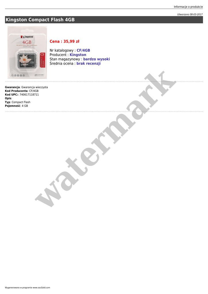 Informacje o produkcie Utworzono 08-03-2017 Kingston Compact Flash 4GB Cena : 35,99 zł w at Gwarancja: Gwarancja wieczysta Kod Producenta: CF/4GB Kod UPC:: 740617118711 Opis: Typ: Compact Flash Pojemność: 4 GB er m ar k Nr katalogowy : CF/4GB Producent : Kingston Stan magazynowy : bardzo wysoki Średnia ocena : brak recenzji Wygenerowano w programie www.oscGold.com