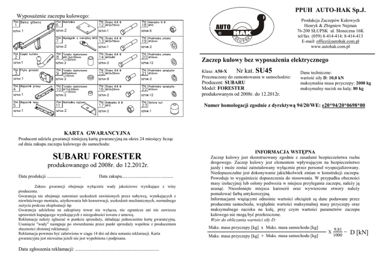 PPUH AUTO-HAK Sp.J. WyposaŜenie zaczepu kulowego: Produkcja Zaczepów Kulowych Henryk & Zbigniew Nejman 76-200 SŁUPSK ul. Słoneczna 16K tel/fax (059) 8-414-414; 8-414-413 E-mail: [email protected] www.autohak.com.pl Zaczep kulowy bez wyposaŜenia elektrycznego SU45 Klasa: A50-X Nr kat. Przeznaczony do zamontowania w samochodzie: Producent: SUBARU Model: FORESTER produkowanym od 2008r. do 12.2012r. Dane techniczne: wartość siły D: 10,0 kN maksymalna masa przyczepy: 2000 kg maksymalny nacisk na kulę: 80 kg Numer homologacji zgodnie z dyrektywą 94/20/WE: e20*94/20*0698*00 KARTA GWARANCYJNA Producent udziela gwarancji niniejszą kartą gwarancyjną na okres 24 miesięcy licząc od dnia zakupu zaczepu kulowego do samochodu: SUBARU FORESTER produkowanego od 2008r. do 12.2012r. Data produkcji .............................. Data zakupu............................................. Zakres gwarancji obejmuje wyłącznie wady jakościowe wynikające z winy producenta. Gwarancja nie obejmuje natomiast uszkodzeń zawinionych przez nabywcę, wynikających z niewłaściwego montaŜu, uŜytkowania lub konserwacji, uszkodzeń mechanicznych, normalnego zuŜycia podczas eksploatacji itp. Gwarancja udzielona na zakupiony towar nie wyłącza, nie ogranicza ani nie zawiesza uprawnień kupującego wynikających z niezgodności towaru z umową. Reklamacje naleŜy zgłaszać w punkcie sprzedaŜy, składając jednocześnie kartę gwarancyjną. Usunięcie "wady" następuje po stwierdzeniu przez punkt sprzedaŜy wspólnie z producentem słuszności złoŜonej reklamacji. Reklamacja powinna być załatwiona w ciągu 14 dni od dnia uznania reklamacji. Karta gwarancyjna jest niewaŜna jeŜeli nie jest wypełniona i podpisana. Data zgłoszenia reklamacji: ................................................................... INFORMACJA WSTĘPNA Zaczep kulowy jest skonstruowany zgodnie z zasadami bezpieczeństwa ruchu drogowego. Zaczep kulowy jest elementem wpływającym na bezpieczeństwo jazdy i moŜe zostać zainstalowany wyłącznie przez personel wyspecjalizowany. Niedopuszczalne jest dokonywanie jakichkolwiek zmian w konstrukcji zaczepu. Powoduje to wygaśniecie dopuszczenia do stosowania. W przypadku obecności masy izolacyjnej lub osłony podwozia w miejscu przylegania zaczepu, naleŜy ją usunąć. Nieosłonięte miejsca karoserii oraz wywiercone otwory naleŜy pomalować farbą antykorozyjną. Informacjami wiąŜącymi odnośnie wartości obciąŜeń są dane podawane przez producenta samochodu, względnie wartości maksymalnej masy przyczepy oraz maksymalnego nacisku na kulę, przy czym wartości parametrów zaczepu kulowego nie mogą być przekroczone. Wzór do obliczania wartości siły D: Maks. masa przyczepy [kg] x Maks. masa samochodu [kg] Maks. masa przyczepy [kg] + Maks. masa samochodu [kg] X 9,81 = 1000 D [kN] INSTRUKCJA MontaŜu i eksploatacji zaczepu kulowego Oznaczenie zacisku wg ISO PN 1 L 2 + 3 31 4 R 5 58R 6 54 7 58L Kolejność czynności przy montaŜu 1. 7 Łączenie przewodów 4 Kierunkowskazy lewe Tylne światła przeciwmgłowe Masa Kierunkowskazy prawe Światła pozycyjne prawe Światła hamowania Światła pozycyjne lewe 15 15 11 9 16 A 8 14 5 1 7 A 9 13 6 12 10 15 6 3 2 Zaczep kulowy przeznaczony jest do zamontowania w samochodzie: SUBARU FORESTER, produkowanym od 2008r. do 12.2012r., nr katalogowy SU45 i słuŜy do ciągnięcia przyczep o masie całkowitej 2000 kg i nacisku na kulę max 80 kg. OD PRODUCENTA Dziękujemy za wybór produkowanego przez naszą firmę zaczepu kulowego. Jego niezawodność została potwierdzona licznymi testami oraz opiniami zadowolonych klientów. JednakŜe niezawodność zaczepów kulowych jest zaleŜna równieŜ od prawidłowego montaŜu oraz prawidłowej eksploatacji. Z tego powodu prosimy Państwa o staranne przeczytanie niniejszej instrukcji montaŜu oraz przestrzeganie właściwych wskazówek. Zaczep naleŜy zamontować w miejscach do tego celu przeznaczonych przez producenta samochodu. Zdemontować zderzak wraz z metalowym wzmocnieniem. Wzmocnienie zderzaka nie będzie ponownie montowane. 2. Przykręcić luźno główną belkę zaczepu (poz. 1) w miejscach po odkręconym wzmocnieniu zderzaka w punktach A uŜywając oryginalnych nakrętek. 3. Do zamontowanej belki głównej zaczepu przykręcić luźno elementy (poz. 6 i 11) jak pokazano na rysunku śrubami M10x80mm (poz. 14). NaleŜy pamiętać o tulejkach dystansowych (poz. 8 i 9). 4. Poprzez duŜe otwory we wspornikach belki wsunąć wsporniki boczne (poz. 4 i 5) do podłuŜnic i skręcić od spodu jak pokazano na rysunku śrubami M10x35mm (poz. 15). NaleŜy pamiętać o tulejkach (poz. 10). 5. Skręcić wsporniki boczne z elementami (poz. 6 i 11) śrubami M10x35mm (poz.15) oraz M10x25mm (poz. 16) jak pokazano na rysunku. 6. Od spodu zderzaka, w jego osi wyciąć fragment o szerokości 55mm i głębokości 80mm. 7. Zamontować zderzak oraz przykręcić część kulistą zaczepu (poz. 2) śrubami: M12x75mm (poz. 12) oraz M12x70mm (poz. 13). Pierwszą z tych śrub przykręcić równieŜ blachę pod gniazdo (poz. 3). Patrz rysunek. 8. Dokręcić wszystkie śruby z momentem jak pokazano w tabeli. 9. Podłączyć przewody gniazdka 7 – bieg. do instalacji elektrycznej zgodnie z instrukcją fabryczną samochodu (zaleca się wykonanie w ASO). 10. Uzupełnić ewentualne ubytki powłoki malarskiej zaczepu powstałe w trakcie montaŜu. Zalecany moment skręcający dla śrub i nakrętek 8,8: M 8 - 25 Nm M 10 - 55 Nm M 12 - 85 Nm M 14 - 135 Nm UWAGA Po zamontowaniu zaczepu kulowego naleŜy uzyskać wpis w dowodzie rejestracyjnym pojazdu na „stacji kontroli pojazdów” właściwej dla miejsca zamieszkania. Samochód powinien być wyposaŜony w : -kierunkowskazy boczne -lusterka boczne o rozstawie co najmniej szerokości przyczepy Sprawdzać śruby mocujące zaczepu kulowego po około 1 000 km przebiegu eksploatacji. Kula zaczepu musi być utrzymana w czystości i konserwowana smarem stałym.