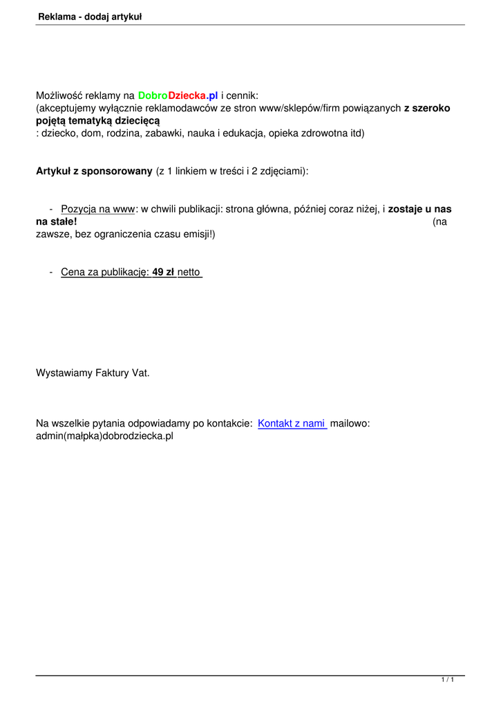 Reklama - dodaj artykuł Możliwość reklamy na DobroDziecka.pl i cennik: (akceptujemy wyłącznie reklamodawców ze stron www/sklepów/firm powiązanych z szeroko pojętą tematyką dziecięcą : dziecko, dom, rodzina, zabawki, nauka i edukacja, opieka zdrowotna itd) Artykuł z sponsorowany (z 1 linkiem w treści i 2 zdjęciami): - Pozycja na www: w chwili publikacji: strona główna, później coraz niżej, i zostaje u nas na stałe! (na zawsze, bez ograniczenia czasu emisji!) - Cena za publikację: 49 zł netto Wystawiamy Faktury Vat. Na wszelkie pytania odpowiadamy po kontakcie: Kontakt z nami mailowo: admin(małpka)dobrodziecka.pl 1/1