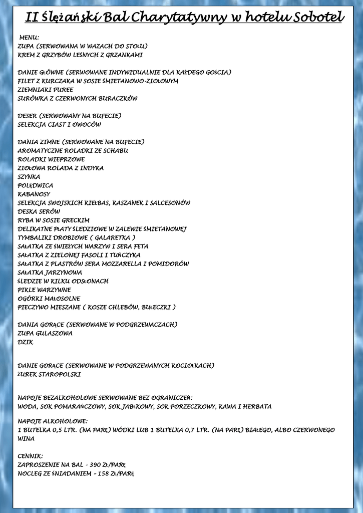 II Ślężański Bal Charytatywny w hotelu Sobotel MENU: ZUPA (SERWOWANA W WAZACH DO STOŁU) KREM Z GRZYBÓW LEŚNYCH Z GRZANKAMI DANIE GŁÓWNE (SERWOWANE INDYWIDUALNIE DLA KAŻDEGO GOŚCIA) FILET Z KURCZAKA W SOSIE ŚMIETANOWO-ZIOŁOWYM ZIEMNIAKI PUREE SURÓWKA Z CZERWONYCH BURACZKÓW DESER (SERWOWANY NA BUFECIE) SELEKCJA CIAST I OWOCÓW DANIA ZIMNE (SERWOWANE NA BUFECIE) AROMATYCZNE ROLADKI ZE SCHABU ROLADKI WIEPRZOWE ZIOŁOWA ROLADA Z INDYKA SZYNKA POLĘDWICA KABANOSY SELEKCJA SWOJSKICH KIEŁBAS, KASZANEK I SALCESONÓW DESKA SERÓW RYBA W SOSIE GRECKIM DELIKATNE PŁATY ŚLEDZIOWE W ZALEWIE ŚMIETANOWEJ TYMBALIKI DROBIOWE ( GALARETKA ) SAŁATKA ZE ŚWIEŻYCH WARZYW I SERA FETA SAŁATKA Z ZIELONEJ FASOLI I TUŃCZYKA SAŁATKA Z PLASTRÓW SERA MOZZARELLA I POMIDORÓW SAŁATKA JARZYNOWA ŚLEDZIE W KILKU ODSŁONACH PIKLE WARZYWNE OGÓRKI MAŁOSOLNE PIECZYWO MIESZANE ( KOSZE CHLEBÓW, BUŁECZKI ) DANIA GORĄCE (SERWOWANE W PODGRZEWACZACH) ZUPA GULASZOWA DZIK DANIE GORĄCE (SERWOWANE W PODGRZEWANYCH KOCIOŁKACH) ŻUREK STAROPOLSKI NAPOJE BEZALKOHOLOWE SERWOWANE BEZ OGRANICZEŃ: WODA, SOK POMARAŃCZOWY, SOK JABŁKOWY, SOK PORZECZKOWY, KAWA I HERBATA NAPOJE ALKOHOLOWE: 1 BUTELKA 0,5 LTR. (NA PARĘ) WÓDKI LUB 1 BUTELKA 0,7 LTR. (NA PARĘ) BIAŁEGO, ALBO CZERWONEGO WINA CENNIK: ZAPROSZENIE NA BAL - 390 ZŁ/PARĘ NOCLEG ZE ŚNIADANIEM – 158 ZŁ/PARĘ