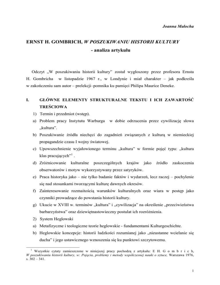 Joanna Małocha ERNST H. GOMBRICH, W POSZUKIWANIU HISTORII KULTURY - analiza artykułu Odczyt „W poszukiwaniu historii kultury” został wygłoszony przez profesora Ernsta H. Gombricha w listopadzie 1967 r., w Londynie i miał charakter – jak podkreśla w zakończeniu sam autor – prelekcji–pomnika ku pamięci Philipa Maurice Deneke. I. GŁÓWNE ELEMENTY STRUKTURALNE TEKSTU I ICH ZAWARTOŚĆ TREŚCIOWA 1) Termin i przedmiot (wstęp). a) Problem pracy Instytutu Warburga w dobie odrzucenia przez cywilizację słowa „kultura”. b) Poszukiwanie źródła niechęci do zagadnień związanych z kulturą w niemieckiej propagandzie czasu I wojny światowej. c) Upowszechnienie wyjałowionego terminu „kultura” w formie pojęć typu: „kultura klas pracujących”1 . d) Zróżnicowanie kulturalne poszczególnych krajów jako źródło zaskoczenia obserwatorów i motyw wykorzystywany przez satyryków. e) Praca historyka jako – nie tylko badanie faktów i wydarzeń, lecz raczej – pochylenie się nad stosunkami tworzącymi kulturę dawnych okresów. f) Zainteresowanie rozmaitością warunków kulturalnych oraz wiara w postęp jako czynniki prowadzące do powstania historii kultury. g) Ukucie w XVIII w. terminów „kultura” i „cywilizacja” na określenie „przeciwieństwa barbarzyństwa” oraz dziewiętnastowieczny postulat ich rozróżnienia. 2) System Heglowski a) Metafizyczne i teologiczne teorie heglowskie - fundamentami Kulturgeschichte. b) Heglowskie koncepcje: historii ludzkości rozumianej jako „nieustanne wcielanie się ducha” i jego ustawicznego wznoszenia się ku punktowi szczytowemu. 1 Wszystkie cytaty zamieszczone w niniejszej pracy pochodzą z artykułu: E H. G o m b r i c h, W poszukiwaniu historii kultury, w: Pojęcia, problemy i metody współczesnej nauki o sztuce, Warszawa 1976, s. 302 – 341. 1 c) Każda kultura - słusznym i koniecznym etapem procesu ewolucji ducha; stąd niemożliwość jej osądzenia i wartościowania, a jedynie – obserwacji. d) Rozumienie historii jako części Bożego planu – spekulacje trynitarystyczne Hegla. e) Ogólna zasada odrębności jako składnik każdego ustalonego przez historię faktu szczegółowego. f) Studium starożytności, „pęd ducha na zewnątrz”, żądza człowieka – czynnikami popierającymi rozwój sztuk. g) Rozwój sztuk jako logiczny proces tworzący i odzwierciedlający rozwijanie się ducha – estetyka Hegla. Zmieniające się style – wskaźnikami zmieniającego się ducha. h) Równorzędność praw każdej sztuki i kultury oraz niemożność osądzania ich za pomocą obcych sobie norm. 3) Heglizm Burckhardta a) Dziewiętnastowieczne podejście do Kulturgeschichte „ojca historii kultury” Jakoba Burckhardta. b) Nieudana próba odrzucenia heglowskiego „ducha świata” jako spekulatywnej abstrakcji. c) Ideał faktów historycznych – ideałem historii wg Burckhardta. d) Nowa metoda badawcza – subiektywne dobieranie, układanie i opracowywanie licznych źródeł pojmowanych jako znaki czasu. e) Podobieństwo teorii Hegla i Burckhardta (postęp ducha jako proces nieunikniony, jego urzeczywistnienie w kolejnych duchach narodowych, budowanie obrazu epoki wokół „z góry podjętej idei”). f) Jedność wszelkich przejawów cywilizacji jako wyrazów tego samego ducha i wynikające z tego - tworzenie zwartych obrazów epok. g) Odrzucenie heglowskiej gloryfikacji reformacji – odmienna koncepcja rozwoju jako wzrostu nowego, niechrześcijańskiego światopoglądu, filozofii nowoczesnego świata. 4) Heglizm bez metafizyki. a) Istnienie zasady porządkującej – warunkiem opisywania historii kultury jako historii wszelkich aspektów życia. b) Historiografia kultury XIX w. – serią prób ratowania heglowskich założeń z odrzuceniem jego metafizyki (H. Wolfflin, marksizm, Lamprecht, W. Dilthey). c) Koncepcja Riegla – ewolucja sztuk jako autonomiczny proces dialektyczny, posiadający swoja równoległość w zmianach ludzkich poglądów na świat. 2 d) Opinie E. Panofskyego, M. Dvoraka, J. Huizinga (w wypadku tego ostatniego – zwłaszcza – krytyka interpretacji artystycznego realizmu jako wyrazu nowego ducha). e) Poddanie w wątpliwość heglowskiego nawyku do egzegezy, która wymaga nie tylko uznania wszystkiego za wewnętrznie powiązane, ale także za symptom czegoś innego. 5) Symptomy i syndromy. a) Możliwość odrzucenia „metody egzegetycznej” bez uszczerbku dla zainteresowania wzajemnym oddziaływaniem między poszczególnymi strefami kultury. b) Nowa metoda antropologii kulturalnej Jonesa – wyznaczenie skłonności danych okresów do poszczególnych przeciwieństw. c) Sprzeczność między faktami historycznymi, a nową metoda „ratowania Hegla” (paradoks romantycznego utożsamienia, tego co twarde i naiwne z tym, co jest zwrócone ku światu nadzmysłowemu i co jest czyste). d) Ruchy artystyczne – historyczne pytani o sposób ich powstawania. 6) Ruchy i okresy. a) Heglowskie ujęcie okresu jako ruchu, tj.: wcielenia poruszającego się ducha. b) Pojmowanie jednostki jedynie jako cząstki zbiorowości, która ulega zmianom w toku dziejów i nie ma możliwości porozumienia się z „człowiekiem innej epoki”. c) Heglowska wiara w istnienie niezależnego, ponadindywidualnego ducha zbiorowego jako czynnik hamujący powstanie prawdziwej historii kultury. d) Cechy charakterystyczne ruchów: inicjowane są przez ludzi i posiadają swoje zewnętrzne godła (styl zachowania się, mowa, strój zwolenników danego ruchu). 7) Tematy i techniki. a) Niebezpieczeństwo „rozdrobnienia” badań historycznych i utraty umiejętności patrzenia całościowego na omawianą epokę. b) Potrzeba zastosowania nowych technik przez historyków sztuki, literatury, nauki, itd. c) Różnice miedzy historią społeczna i historia kultury (odmienny przedmiot zainteresowania, odmienne metody badawcze). d) Dylemat postheglowskiej tradycji: „żadnej kultury nie da się w pełni ująć 