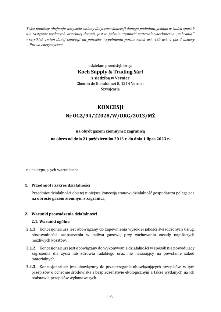 Tekst poniższy obejmuje wszystkie zmiany dotyczące koncesji danego podmiotu, jednak w żaden sposób nie zastępuje wydanych wcześniej decyzji, jest to jedynie czynność materialno-techniczna „zebrania” wszystkich zmian danej koncesji na potrzeby wypełnienia postanowień art. 43b ust. 4 pkt 3 ustawy – Prawo energetyczne. udzielam przedsiębiorcy: Koch Supply & Trading Sárl z siedzibą w Vernier Chemin de Blandonnet 8, 1214 Vernier Szwajcaria KONCESJI Nr OGZ/94/22028/W/DRG/2013/MŻ na obrót gazem ziemnym z zagranicą na okres od dnia 21 października 2013 r. do dnia 1 lipca 2023 r. na następujących warunkach: 1. Przedmiot i zakres działalności Przedmiot działalności objętej niniejszą koncesją stanowi działalność gospodarcza polegająca na obrocie gazem ziemnym z zagranicą. 2. Warunki prowadzenia działalności 2.1. Warunki ogólne 2.1.1. Koncesjonariusz jest obowiązany do zapewnienia wysokiej jakości świadczonych usług, niezawodności zaopatrzenia w paliwa gazowe, przy zachowaniu zasady najniższych możliwych kosztów. 2.1.2. Koncesjonariusz jest obowiązany do wykonywania działalności w sposób nie powodujący zagrożenia dla życia lub zdrowia ludzkiego oraz nie narażający na powstanie szkód materialnych. 2.1.3. Koncesjonariusz jest obowiązany do przestrzegania obowiązujących przepisów, w tym przepisów o ochronie środowiska i bezpieczeństwie ekologicznym a także wydanych na ich podstawie przepisów wykonawczych. 1/3 2.1.4. Koncesjonariusz jest obowiązany do utrzymywania lub zagwarantowania możliwości pozyskania środków finansowych lub majątku pozwalającego na zaspokojenie roszczeń osób trzecich mogących powstać wskutek niewłaściwego prowadzenia działalności objętej koncesją lub szkód w środowisku. 2.1.5. Koncesjonariusz nie może sprzedawać paliw gazowych przedsiębiorcom wykonującym działalność gospodarczą w zakresie magazynowania, skraplania gazu ziemnego i regazyfikacji skroplonego gazu ziemnego, przesyłania, dystrybucji lub obrotu paliwami gazowymi, jeżeli nie posiadają koncesji, w przypadkach gdy taka koncesja jest wymagana przepisami ustawy – Prawo energetyczne. 2.1.6. Koncesjonariusz jest obowiązany, zgodnie z art. 34 ust. 1 ustawy – Prawo energetyczne, do wnoszenia corocznej opłaty do budżetu państwa, w sposób i w wysokości określonych w przepisach wydanych na podstawie art. 34 ust. 3 tej ustawy. 2.2. Warunki szczególne 2.2.1. Koncesjonariusz przez cały okres obowiązywania niniejszej koncesji jest obowiązany do posiadania koncesji na obrót paliwami gazowymi i zachowania ustalonych w niej warunków. 2.2.2. Koncesjonariusz jest obowiązany do przestrzegania chronionych prawem interesów odbiorców, w tym poprzez udzielanie odbiorcom końcowym pełnych, rzetelnych i wyczerpujących informacji dotyczących ich uprawnień i obowiązków. Koncesjonariusz nie może stosować praktyk powodujących wprowadzenie odbiorców w błąd co do ich uprawnień lub obowiązków. W szczególności postanowienia umów zawieranych z odbiorcami powinny być czytelne i zrozumiałe, a postanowienia inne niż związane z dostarczaniem paliw gazowych (art. 5 ustawy – Prawo energetyczne), powinny być odrębnie i wyraźnie oznaczone. Umowa powinna wyraźnie określać koszty wynikające z postanowień innych niż dotyczących realizacji usług związanych z dostarczaniem paliw gazowych. 2.2.3. Koncesjonariusz nie może subsydiować działalności nie objętej niniejszą koncesją z przychodu osiąganego z działalności objętej tą koncesją. 2.2.4. Koncesjonariusz jest obowiązany do terminowego regulowania wszelkich należności celnych i podatkowych powstałych z tytułu wprowadzenia na polski obszar celny gazu ziemnego. 2.2.5. Koncesjonariusz jest obowiązany do utrzymywania zapasów obowiązkowych gazu ziemnego zgodnie z obowiązującymi w tym zakresie przepisami. 2.2.6. Koncesjonariusz jest obowiązany do dywersyfikacji dostaw gazu ziemnego z zagranicy zgodnie z obowiązującymi w tym zakresie przepisami. 2.3. Sprawozdawczość i udzielanie informacji 2.3.1. Koncesjonariusz obowiązany jest zawiadomić pisemnie Prezesa URE w przypadku zmiany: 1) oznaczenia podmiotu, jego siedziby lub miejsca zamieszkania oraz ich adresu, 2/3 2) numeru w rejestrze przedsiębiorców w Krajowym Rejestrze Sądowym lub numeru równoważnego rejestru państw członkowskich Unii Europejskiej, Konfederacji Szwajcarskiej, państwa członkowskiego Europejskiego Porozumienia o Wolnym Handlu (EFTA) – stron umowy o Europejskim Obszarze Gospodarczym lub Turcji, 3) numeru identyfikacji podatkowej NIP, - najpóźniej w terminie 7 dni od dnia zaistnienia tych zmian, przedkładając jednocześnie, w przypadku kiedy zmiana ta spowoduje potrzebę zmiany zapisów niniejszej koncesji, wniosek o jej zmianę. 2.3.2. Koncesjonariusz jest obowiązany, w terminie nie dłuższym niż 14 dni od dnia zaistnienia innych - niż wskazane w pkt 2.3.1. - istotnych zmian dotyczących wykonywanej działalności objętej niniejszą koncesją (w szczególności odnoszących się do rozszerzenia bądź ograniczenia zakresu tej działalności, danych osób uprawnionych lub wchodzących w skład organu uprawnionego do reprezentowania Koncesjonariusza), zawiadomić pisemnie Prezesa URE o tych zmianach, przedkładając jednocześnie - w przypadku kiedy zmiana ta powoduje potrzebę zmiany zapisów niniejszej koncesji - wniosek o jej zmianę. 2.3.3. Koncesjonariusz jest obowiązany do pisemnego poinformowania Prezesa URE o zamiarze zaprzestania działalności koncesjonowanej nie później niż na 18 miesięcy przed przewidywaną datą zaprzestania działalności. 2.3.4. Koncesjonariusz jest obowiązany pisemnie zawiadomić Prezesa URE o niepodjęciu działalności objętej koncesją, jeżeli nie podejmie jej w ciągu 6 miesięcy od dnia udzielenia koncesji, nie później niż 14 dni od dnia upływu tego terminu, podając przyczyny niepodjęcia działalności; za datę po